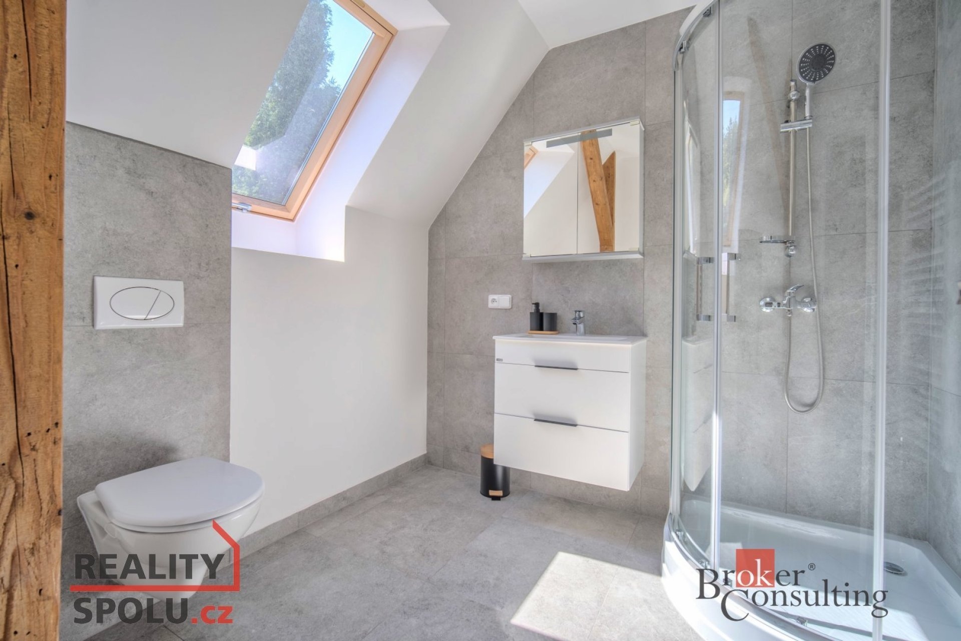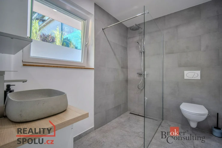 * 1. patro: hlavní ložnice s balkonem, další samostatný pokoj a druhá koupelna se sprchovým koutem a toaletou.