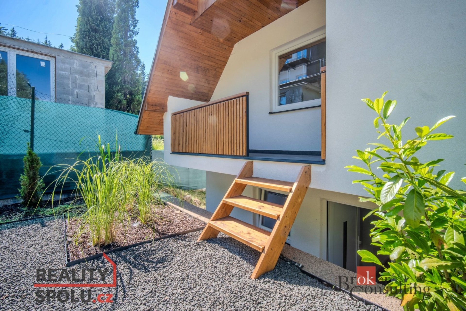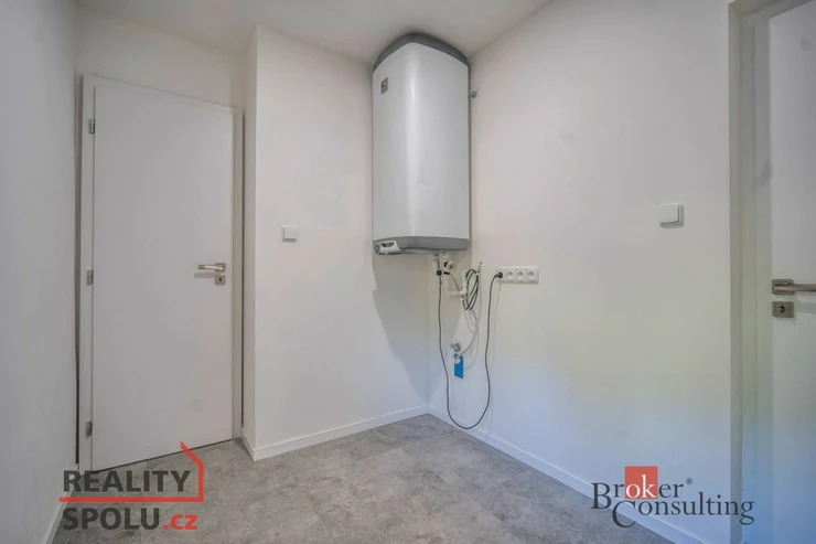 * Přízemí: vstupní předsíň, světlý obývací pokoj s jídelním koutem, moderní kuchyně s vestavnými spotřebiči (lednice, myčka, indukční varná deska, mikrovlnná trouba), koupelna se sprchovým koutem a toaletou, dále je zde technická místnost.