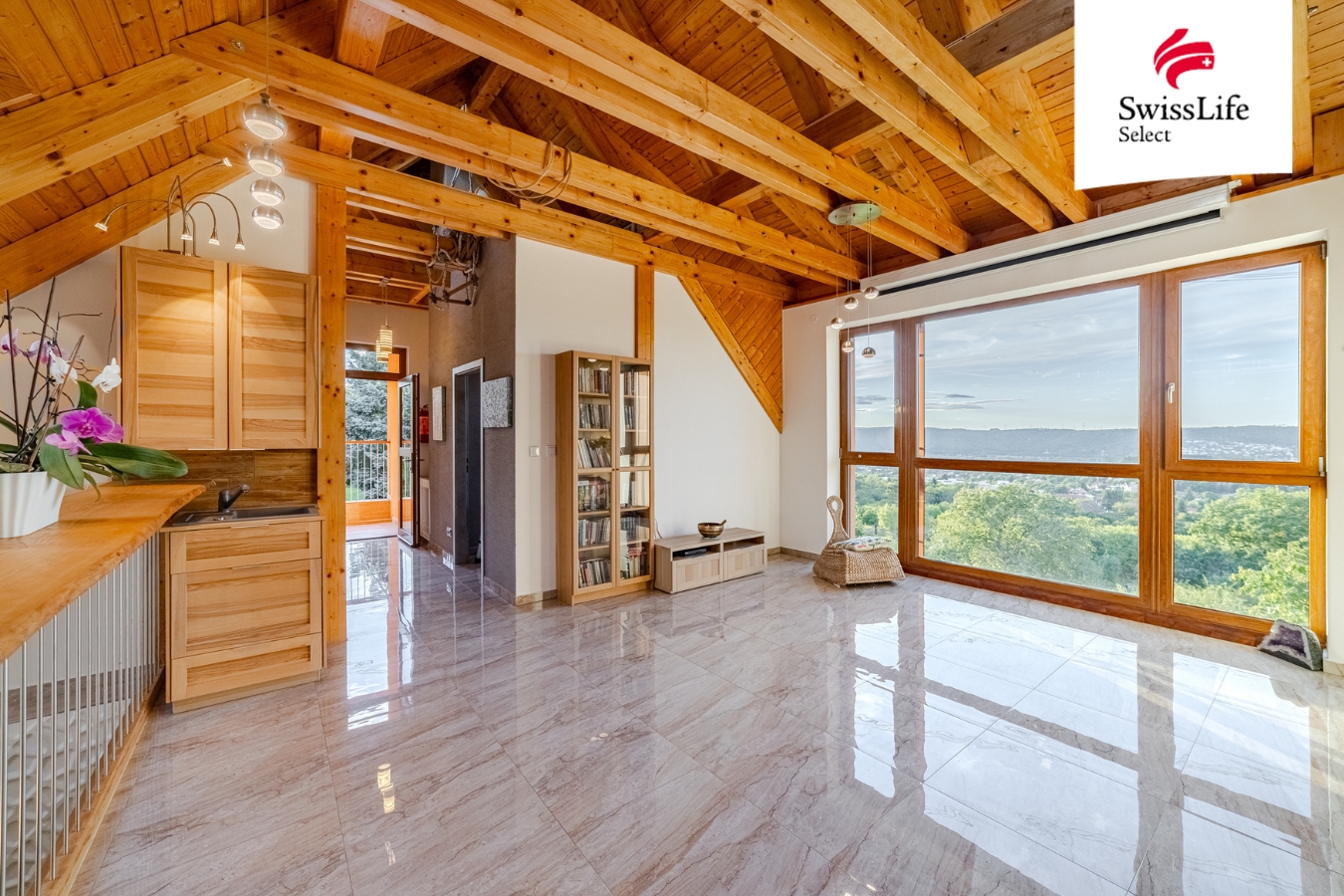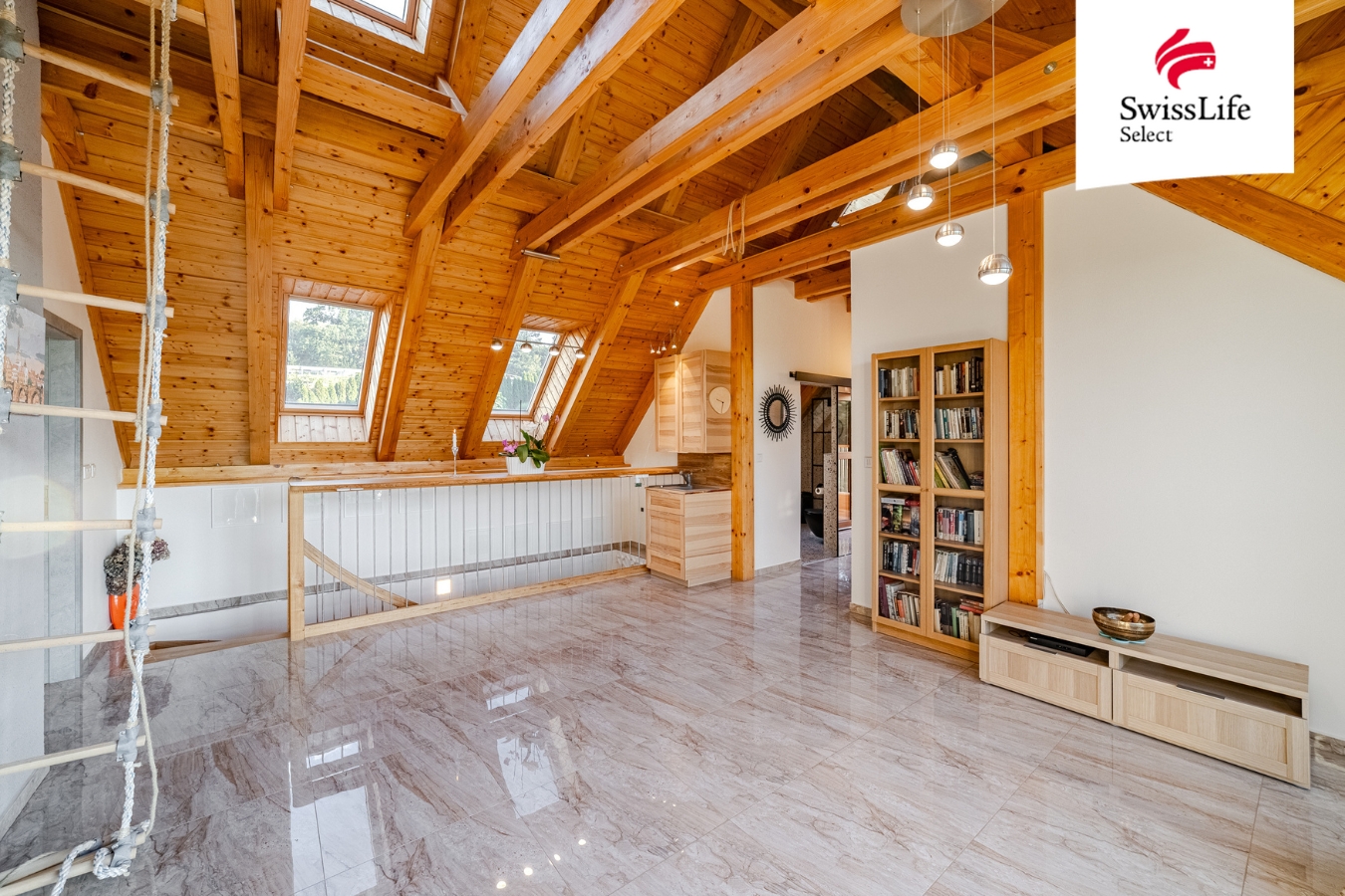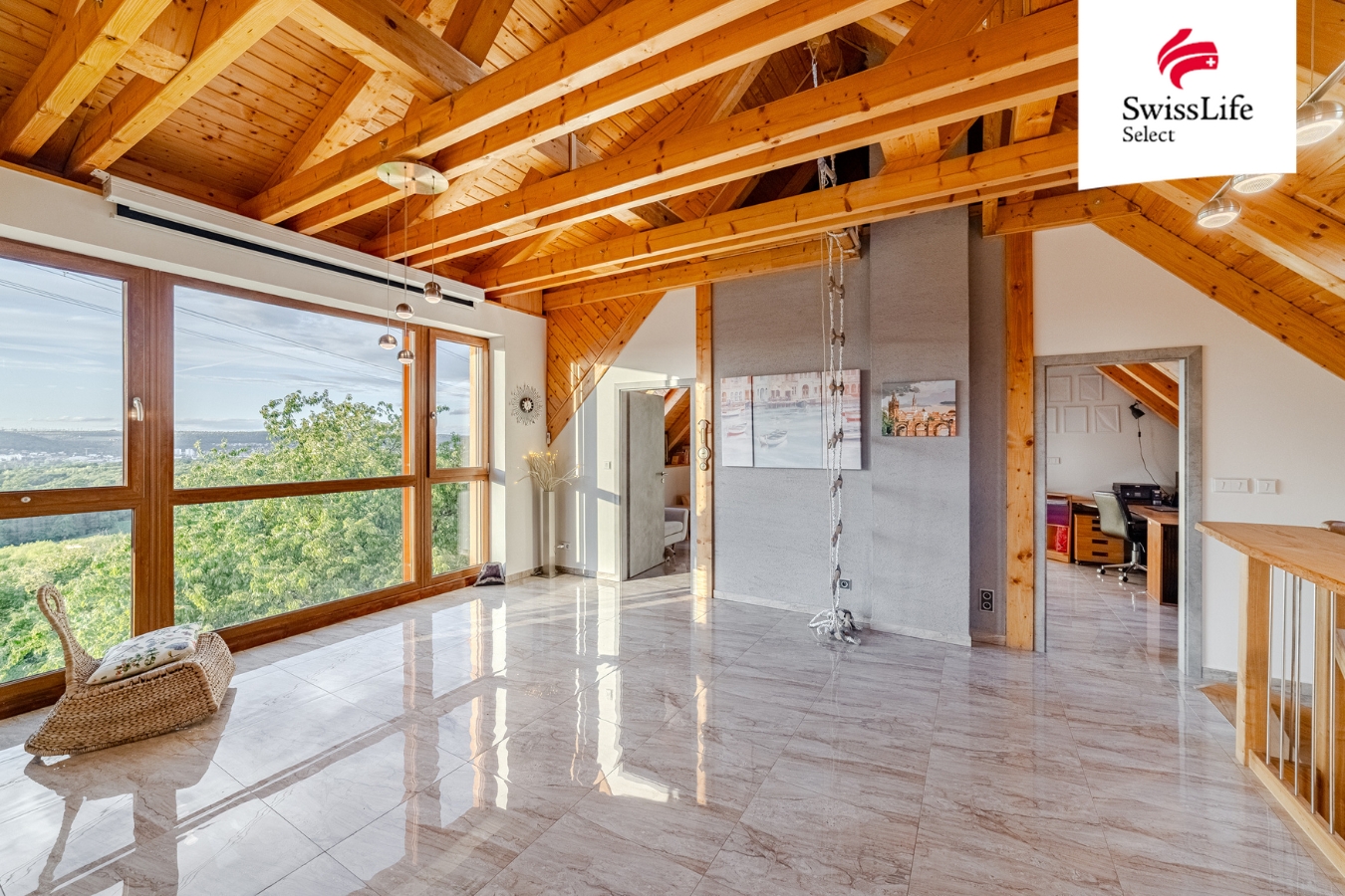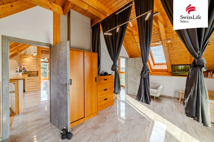 Upper Floor: large open space with panoramic view, bedroom, double room/office with access to a spacious terrace, bathroom, access to attic areas (children’s play zone).