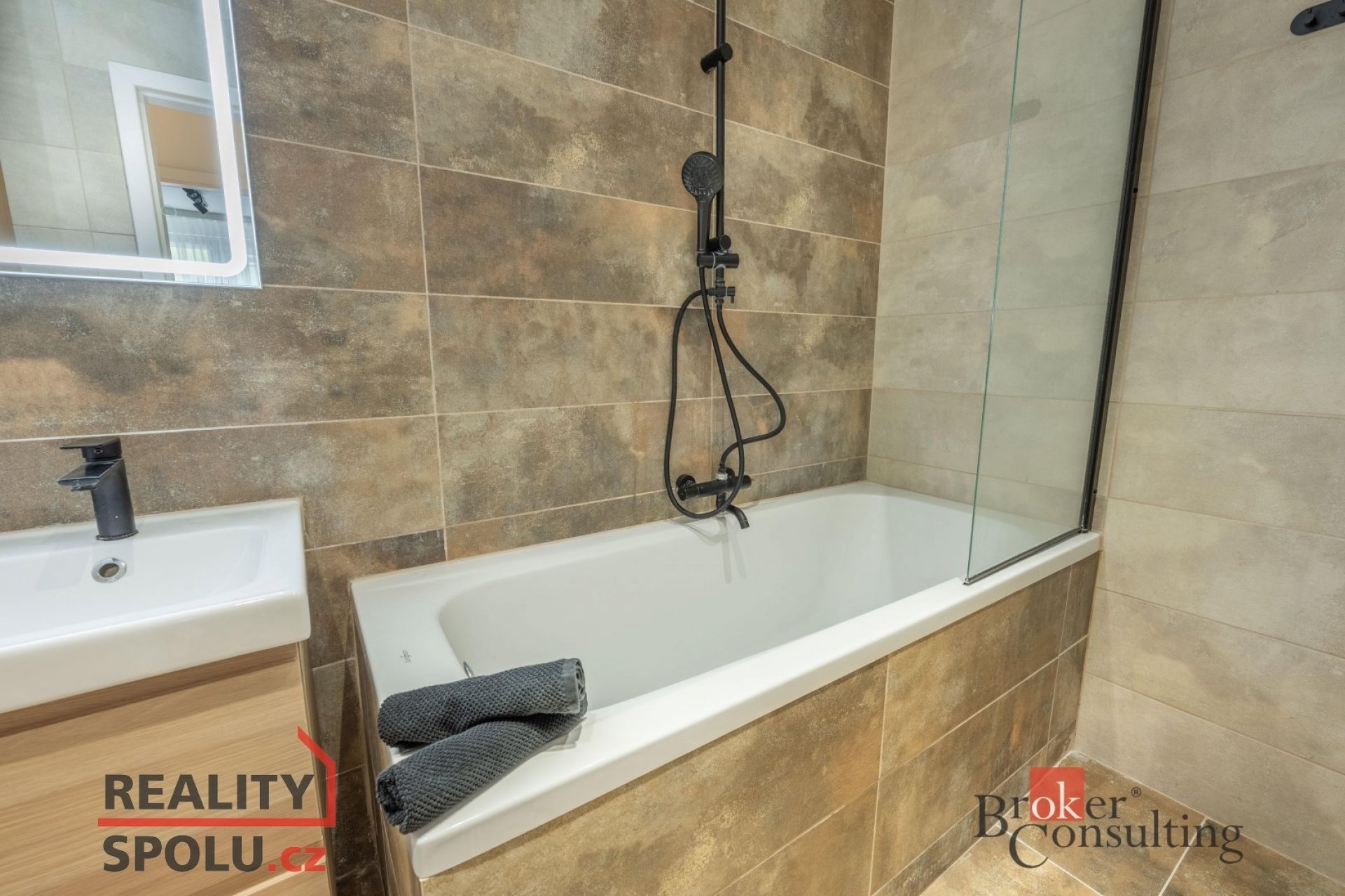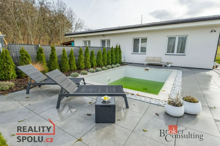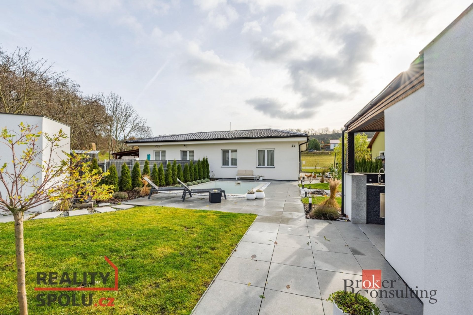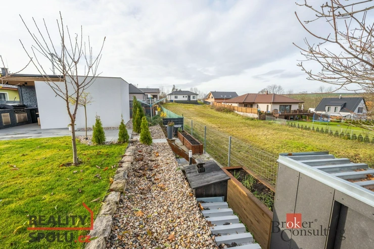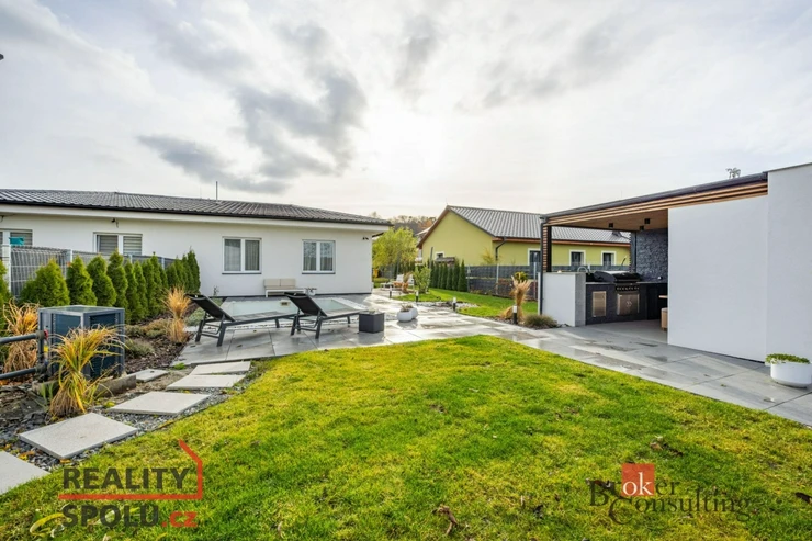 Součástí domu je krásná prostorná zahrada o výměře 463,7 m², která je ideálním místem pro relaxaci i volnočasové aktivity. Najdete zde betonový bazén obložený mozaikou, vestavěný venkovní gril s lednici a terasu z bambusových prken.