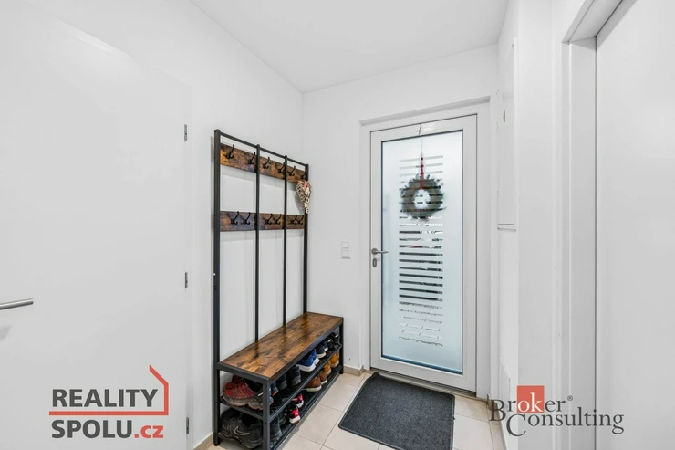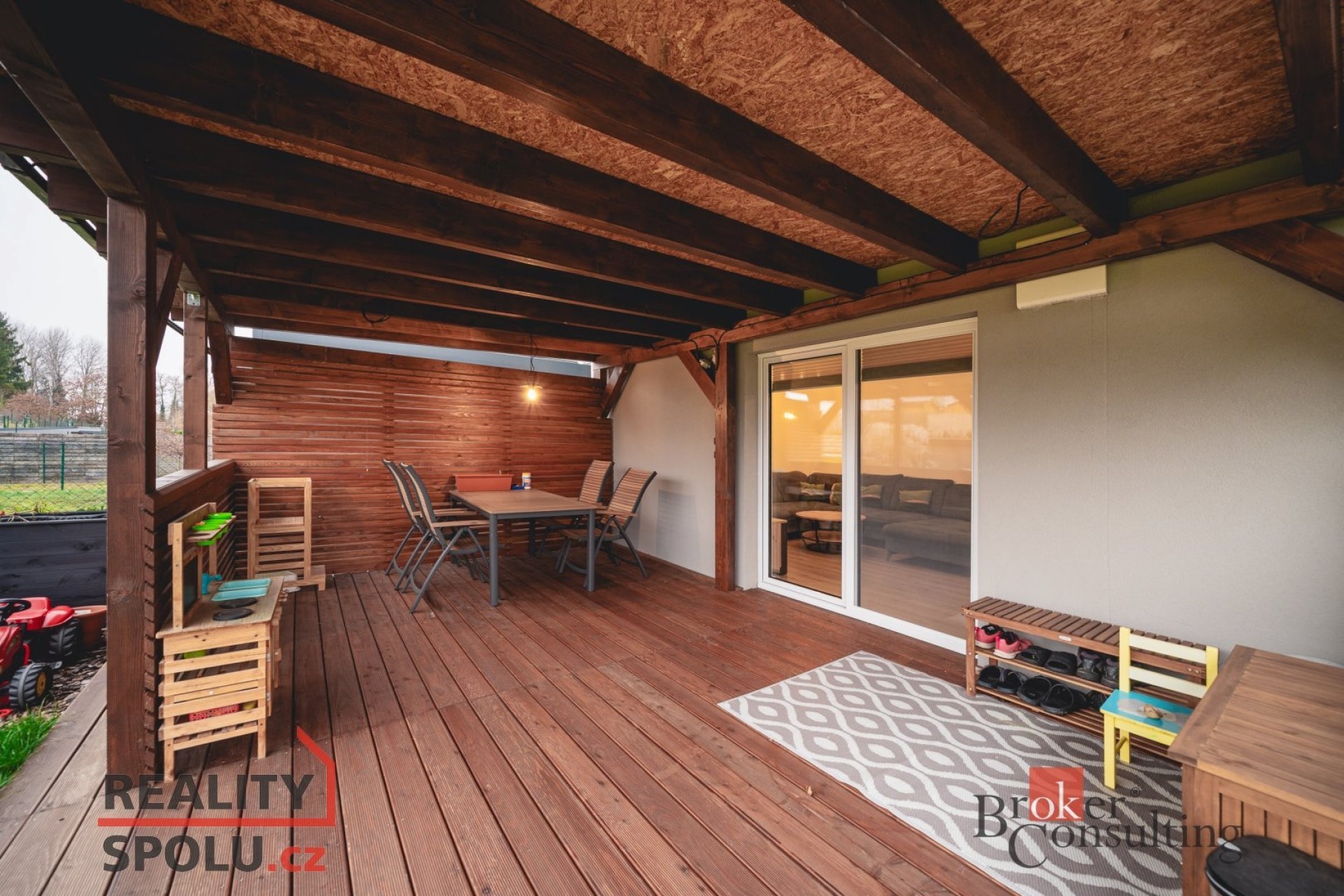 Dominantou přízemí je prostorný a světlý obývací pokoj. Otevřený koncept s moderní kuchyní umožňuje propojený rodinný život i pohodlné hostění návštěv. Z obývacího pokoje vstoupíte přímo na terasu se zahradou – místem určeným pro odpočinek, grilování i hry dětí.