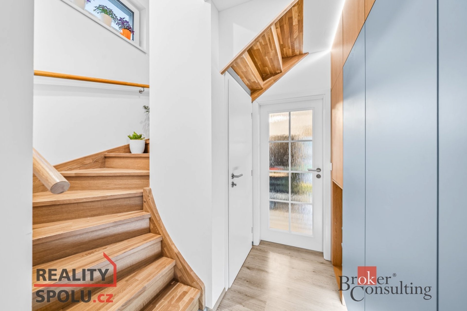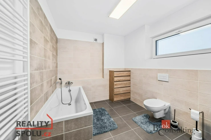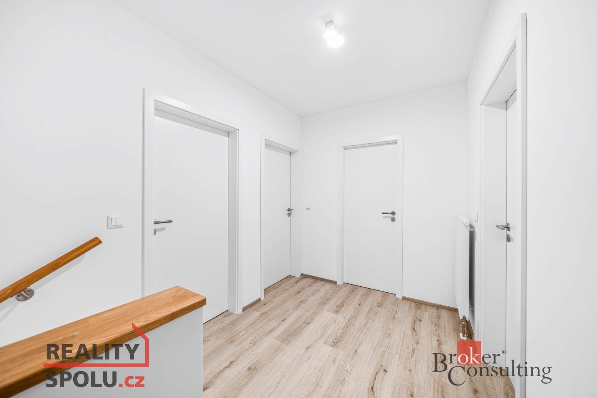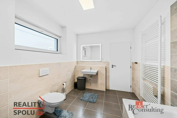 V patře se nachází útulná ložnice, dětský pokoj, pracovna a také šatna, které poskytují dostatek prostoru pro celou rodinu. Výhodou jsou dvě koupelny – jedna v přízemí a druhá v patře.