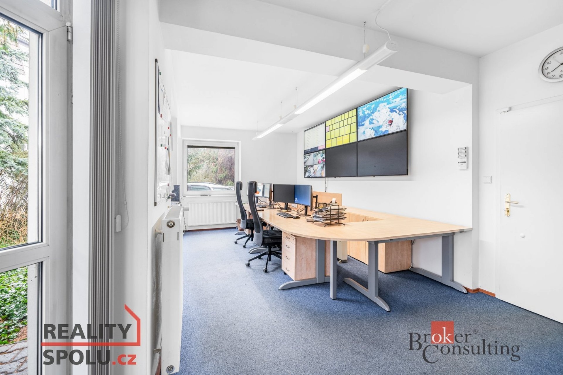 For sale, an administrative building with its own land in the village of Průhonice, which can be converted into a spacious family home. It is a three-storey building with a total area of 447 m², including parking spaces behind the gate for at least 12 cars. Currently, the building is divided into 9 separate rooms, which provides a wide range of possibilities for adapting layouts for family living. The ground floor offers an entrance hall, an office, a meeting room and a garage that could be used as a storage or parking space. The first floor contains five rooms suitable for bedrooms or offices, the second floor has two rooms and a large space, ideal for social activities. The new Viessmann gas boiler provides efficient heating and hot water heating. The property is entered through an automatic gate and everything is secured by EZS. The surrounding greenery provides a pleasant environment for relaxation. Thanks to the excellent accessibility of Prague and the D1 highway, this property is ideal for family living.