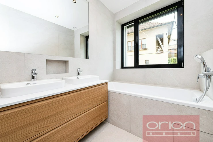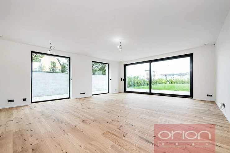 We offer for sale a brand new, luxurious six bedroom family house in a quiet residential area in Prague 5 - Stodůlky with excellent transport connections to the city center, international schools, and the airport. The high-quality new building on three floors combines modern design and the latest technology. The house is located in a quiet residential area of Prague 5. On the ground floor of the house there is an entrance hall, a spacious living room with access to the 292 sqm garden and terrace, an open space with a dining room and kitchen. On the first floor there is a master bedroom with an en-suite bathroom and dressing room, a second bathroom and two more bedrooms. On the top floor there is a bedroom with a bathroom and 17.1 smq terrace, two more bedrooms, and a utility room with a laundry room. A wooden staircase connects the entire house. The house is finished with wooden floors, bathrooms and other equipment: heat recovery, heat pump, air conditioning, electric external blinds, aluminum windows with triple glazing, central vacuum cleaner, alarm, security camera system and videophone. The garage is spacious for two cars with electric charges and two more parking spaces are on the plot. Usable area of the house 282 sqm, plot area 426 sqm, garden area 292 sqm. Energy label class B very economical.