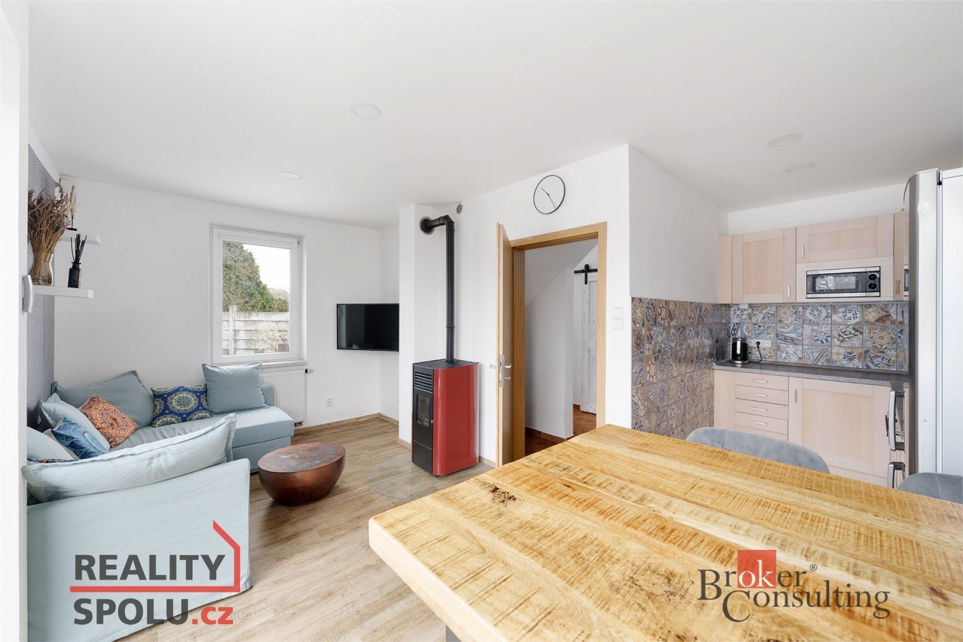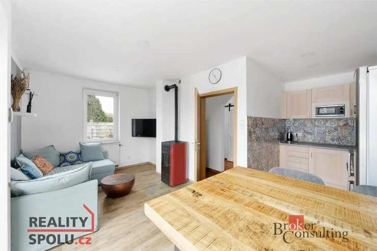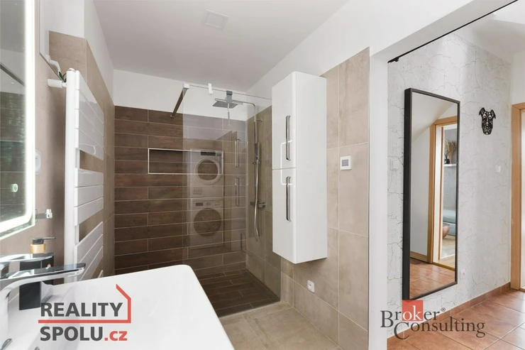 Přízemí domu nabízí obývací pokoj s kuchyní a přímým vstupem na venkovní terasu a k bazénu - ideální pro letní posezení s rodinou a přáteli, jelikož pro občerstvení to není daleko. V chladných dnech naopak potěší zvuky praskajícího ohně v krbových kamnech. Dále se v přízemí nachází také koupelna s prostorným sprchovým koutem a technická místnost.