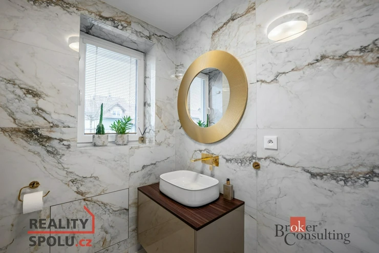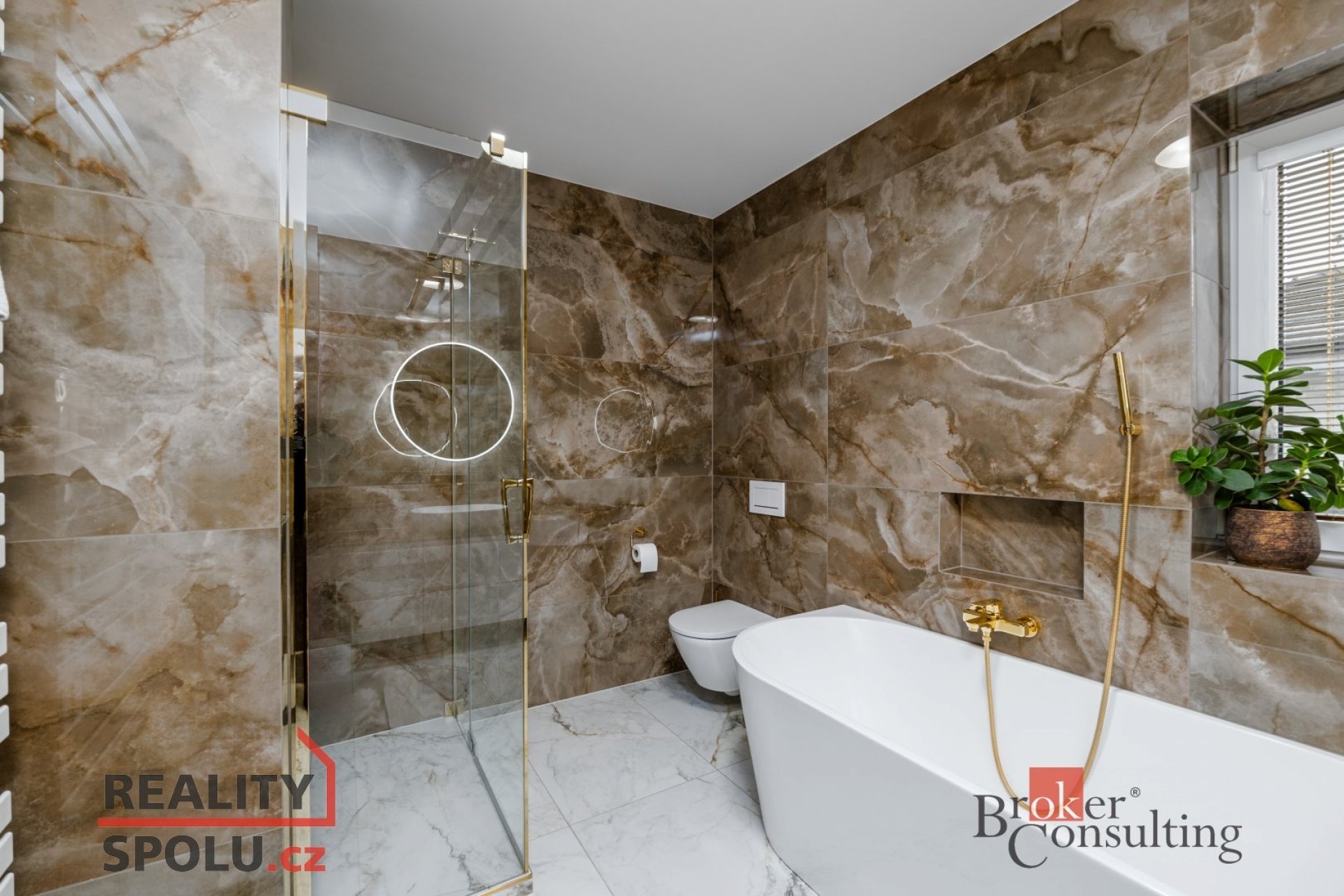 • luxusní koupelna s prostornou vanou i sprchovým koutem, obklady od italských výrobců, baterie Sapho ve zlatém designu (součástí koupelny je i toaleta)