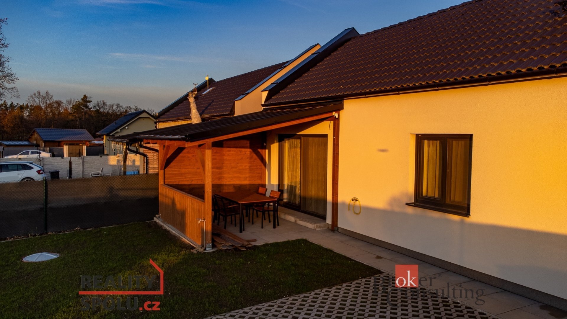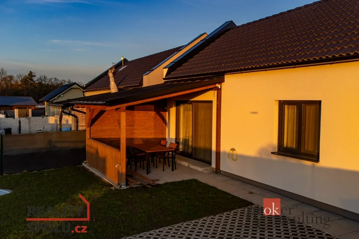 K domu náleží zastřešená terasa o výměře 12 m², pozemek o velikosti 225 m² s parkovacím stáním až pro dvě vozidla, betonová plocha pro zahradní domek, trávník a záhony. Na pozemku je podzemní nádrž na dešťovou vodu s přípravou na zavlažování a venkovní nezámrzný kohout.