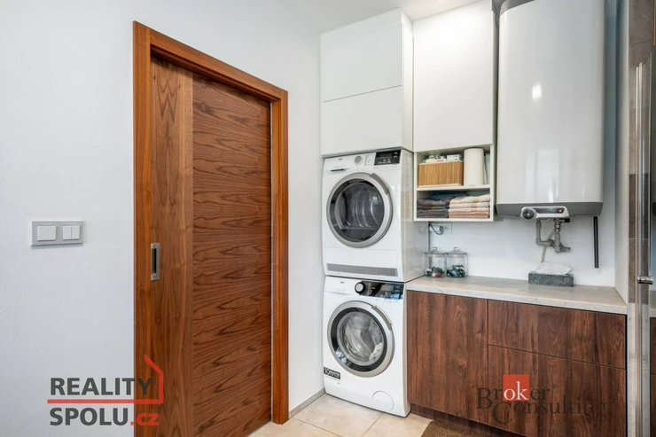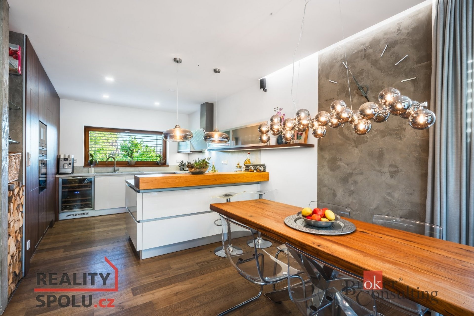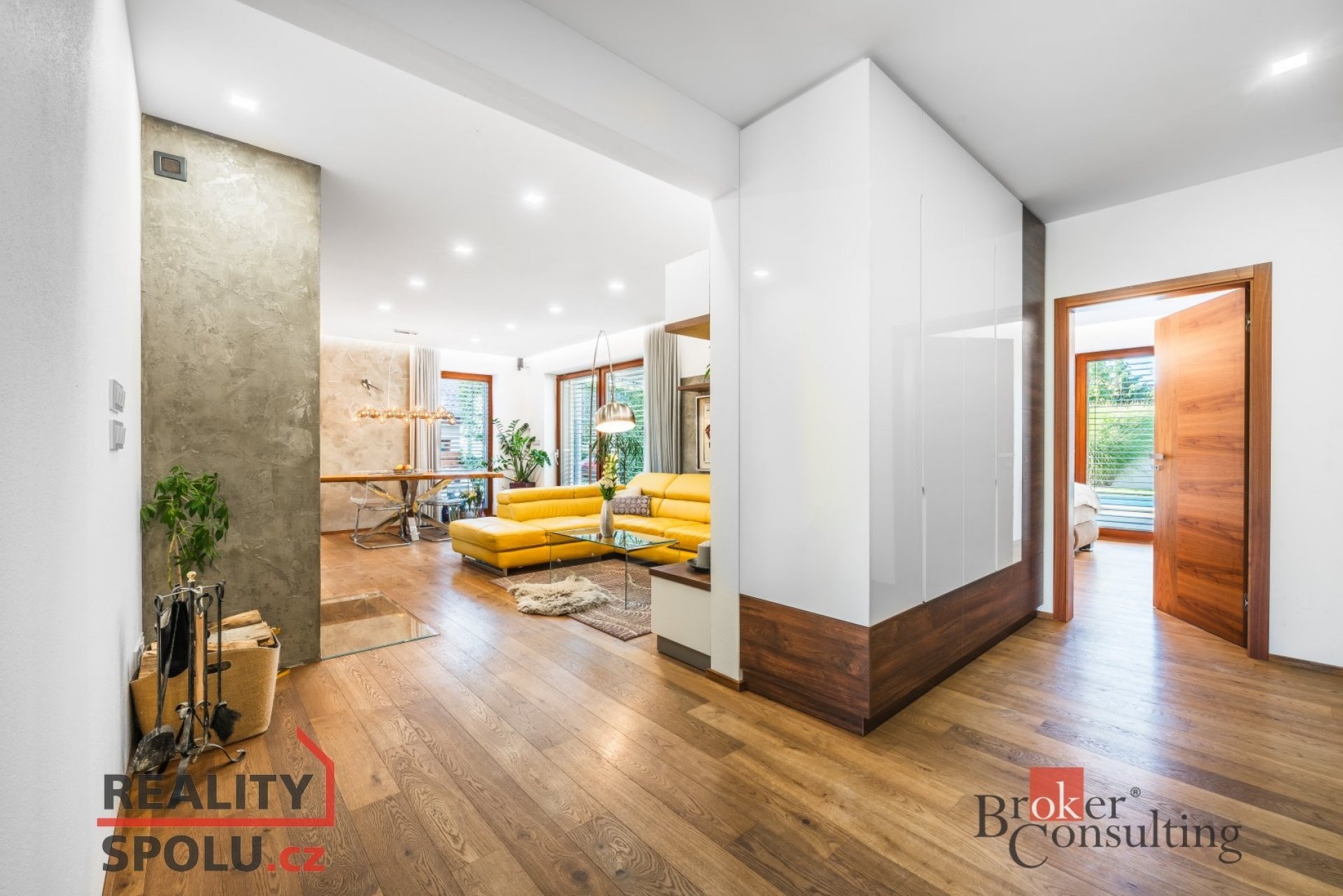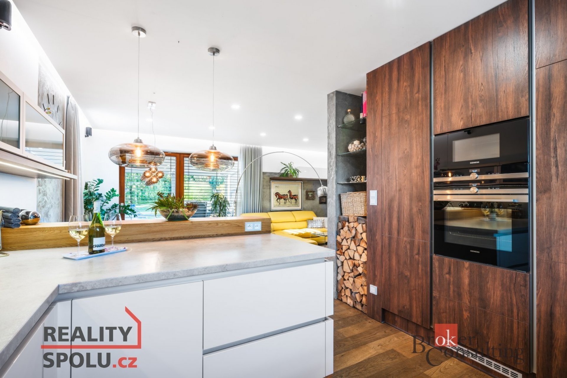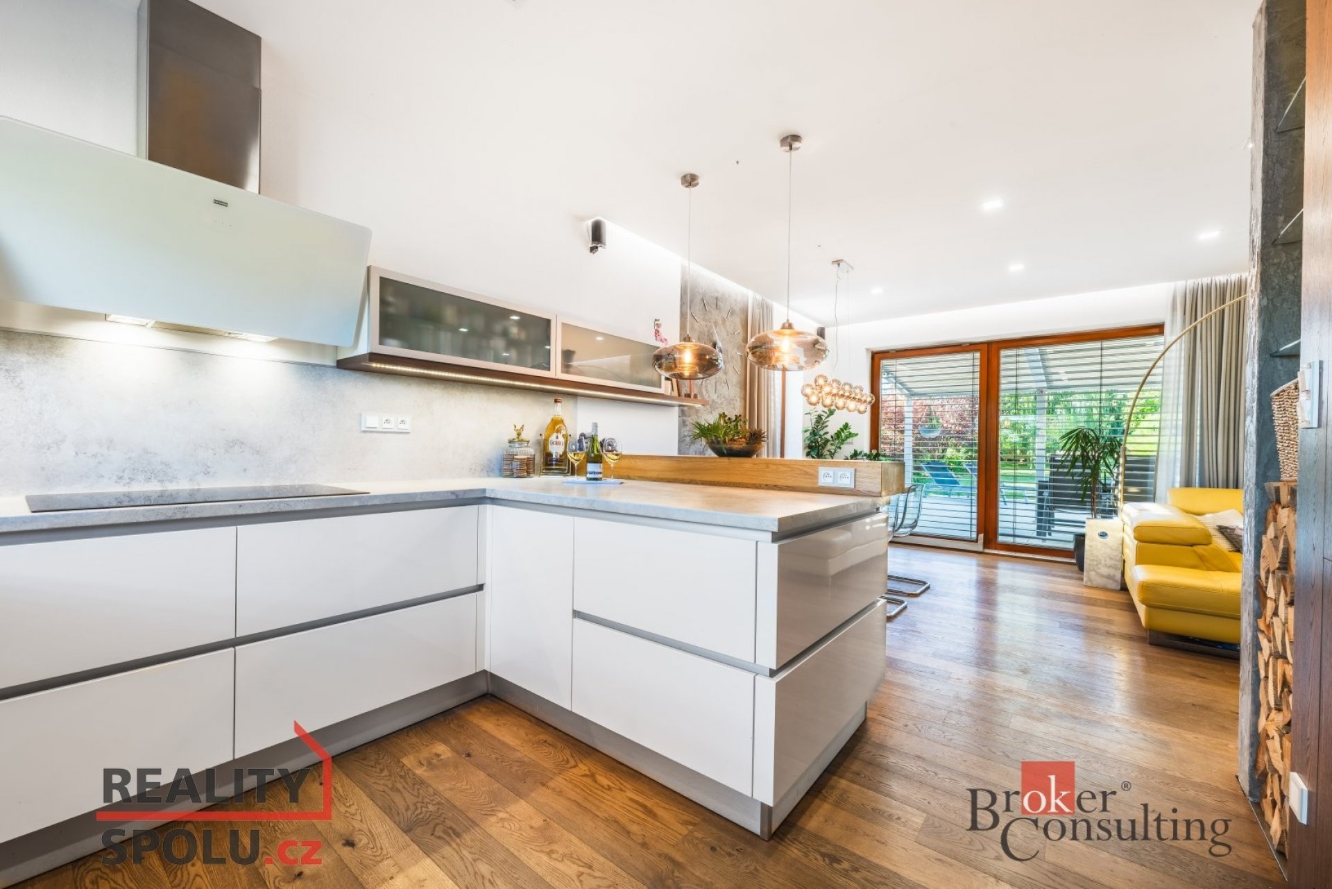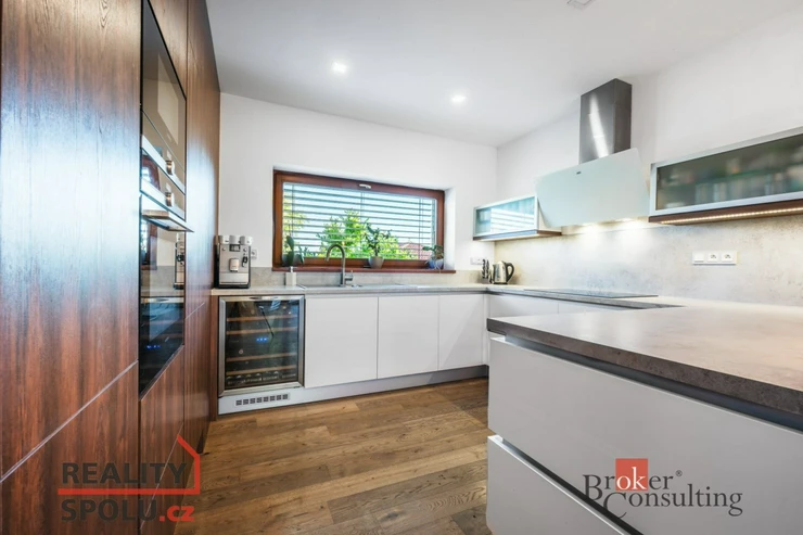 Z levé části chodby se vstupuje do prostorného obývacího pokoje propojeného s kuchyní. Dominantou obývací části je designový krb zasazený do stěny s elegantní betonovou stěrkou, který dodává světlému interiéru hřejivý kontrast. V kombinaci s dřevěnou podlahou, dřevěnými okny a přímým vstupem na zahradu vzniká útulná a sofistikovaná atmosféra. Kuchyň je velkorysá, vybavená moderní linkou s vestavěnými spotřebiči a poskytuje příjemný výhled do přední části domu.