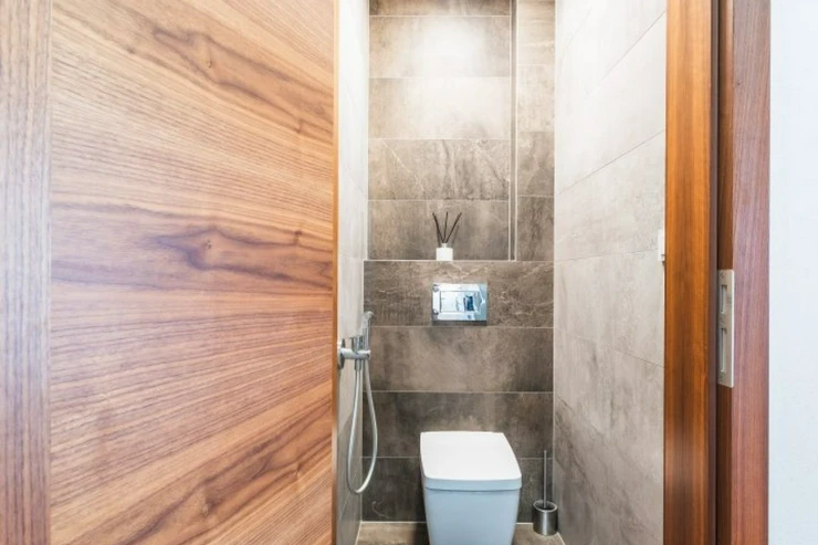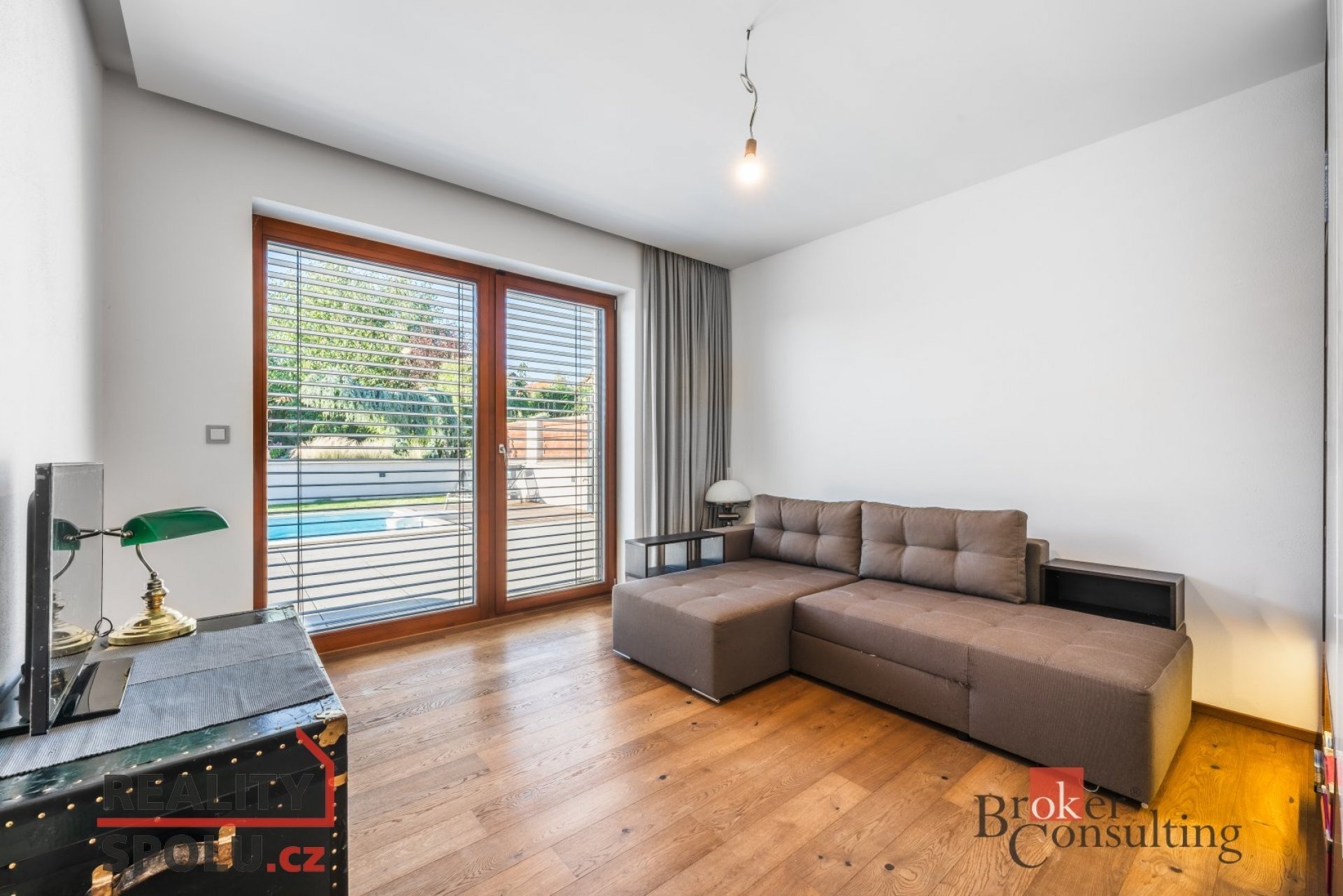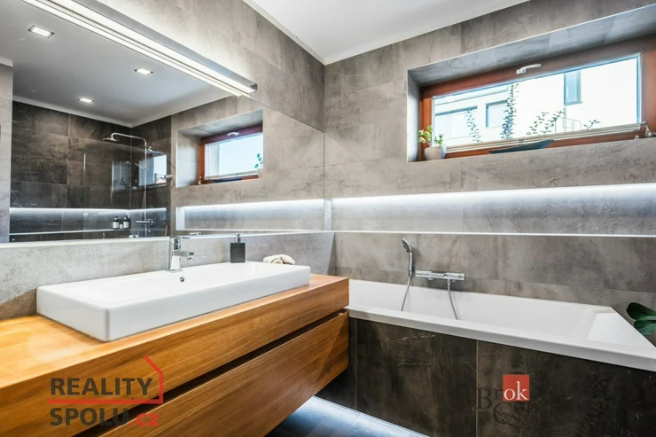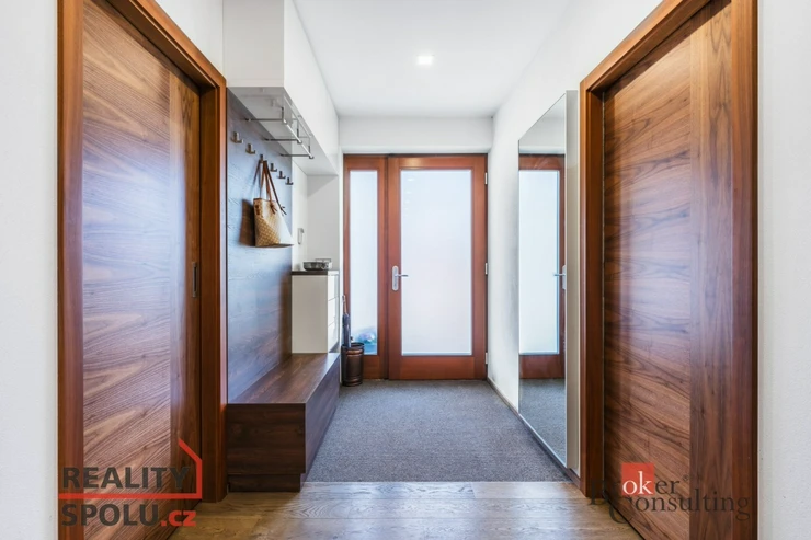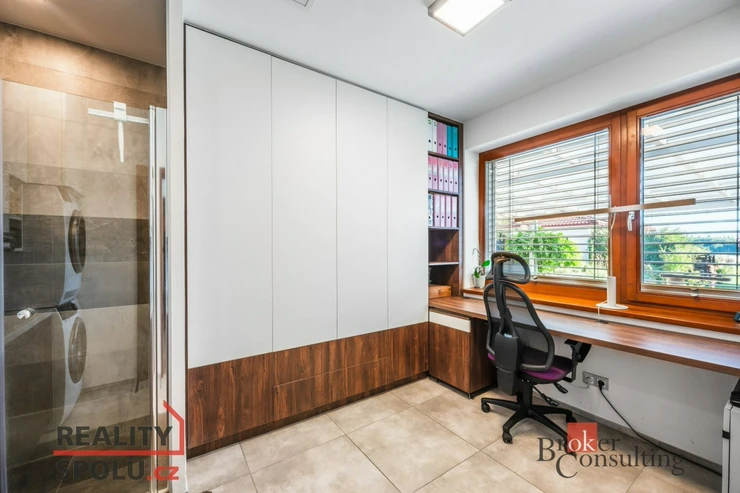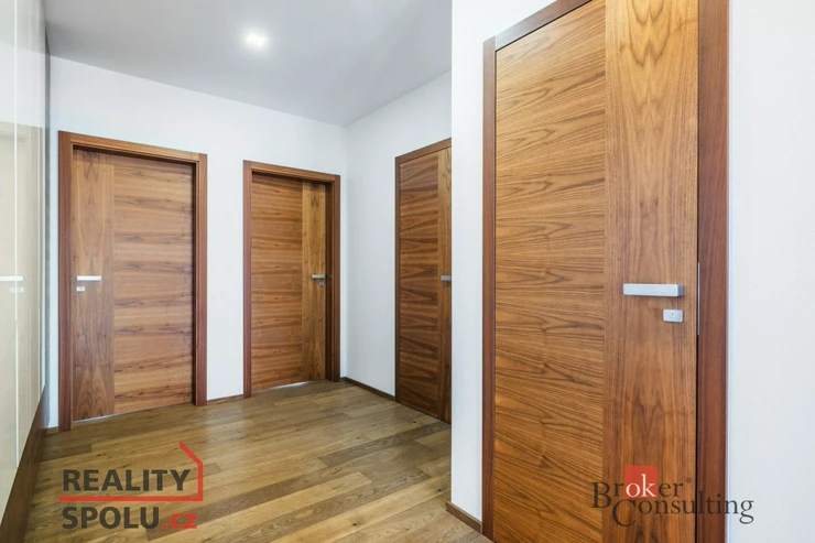 Po vstupu do domu Vás chodba zavede do dvou neprůchozích pokojů. Jeden z nich lze využít jako prostornou šatnu či ložnici, druhý je díky posuvným dveřím ideální jako pracovna, technická místnost nebo místo k relaxaci. Dále chodba pokračuje k samostatné toaletě s bidetovou sprškou a ke koupelně vybavené moderním sprchovým koutem a vanou. Zbývající dva neprůchozí pokoje jsou orientovány do zahrady a představují ideální volbu pro ložnice. Nabízejí nádherný výhled na bazén, jehož večerní odlesky jemně prosvětlují interiér a vytvářejí jedinečnou atmosféru klidu a luxusu.