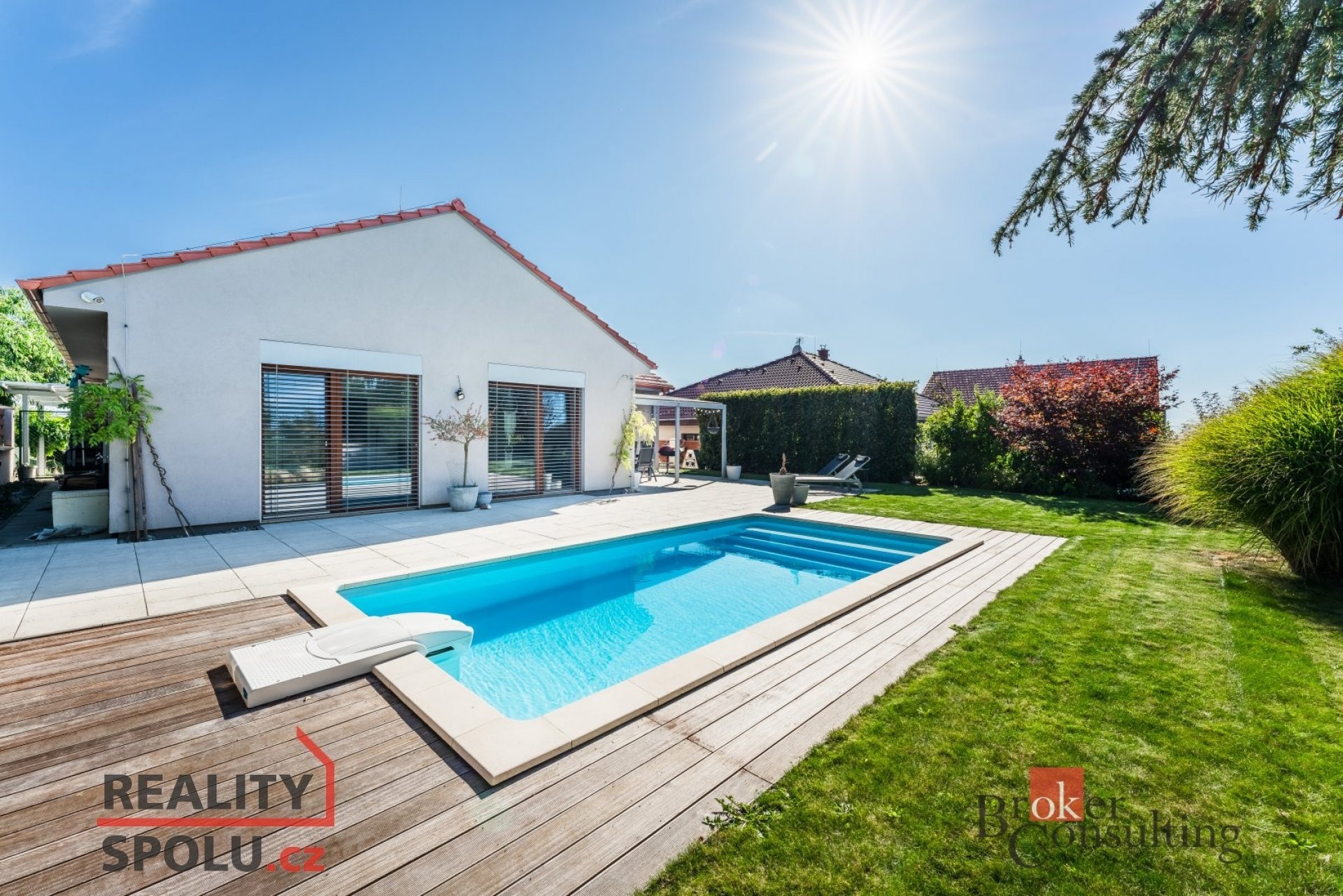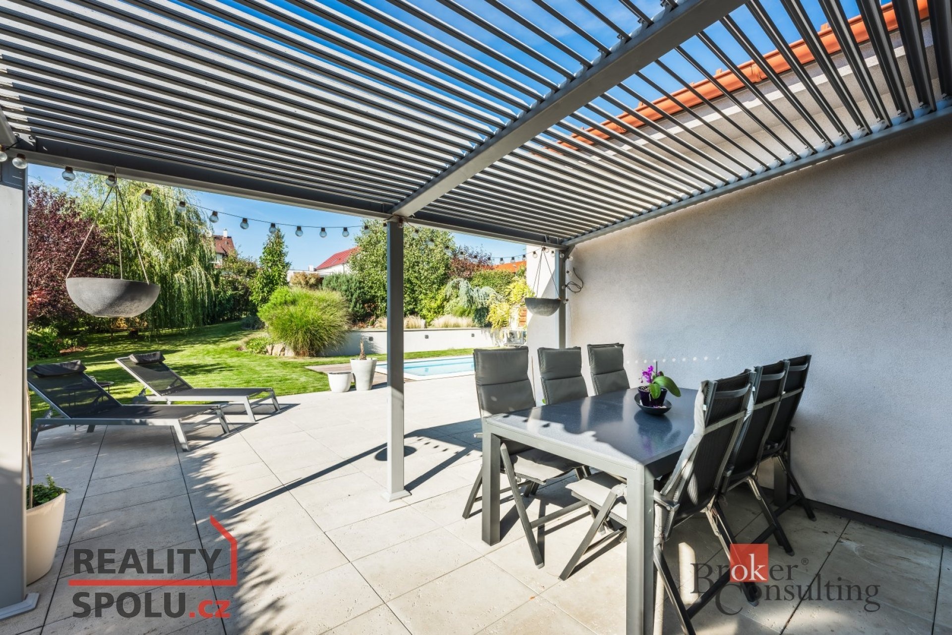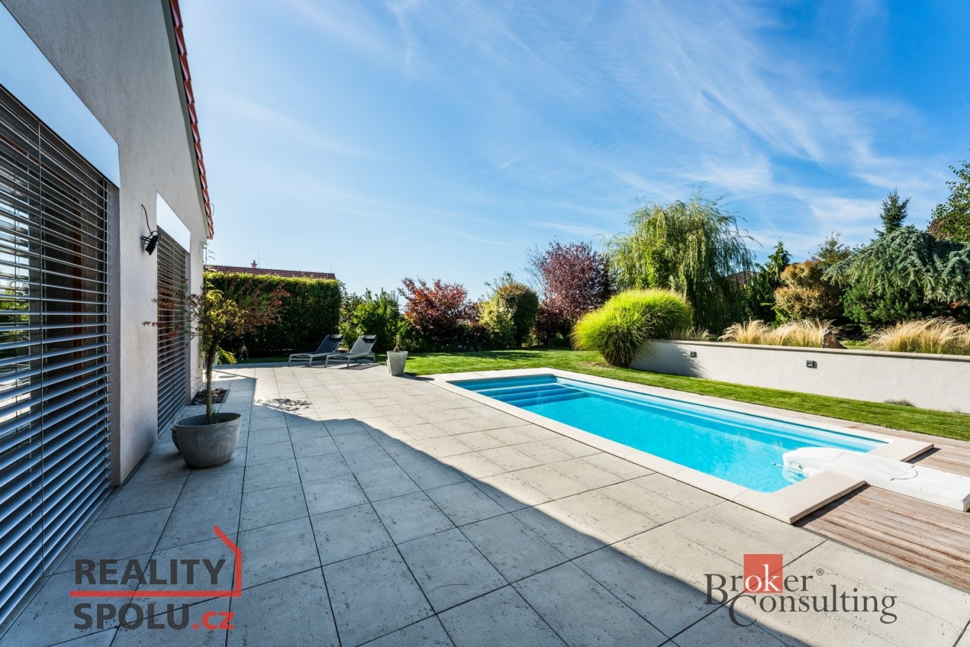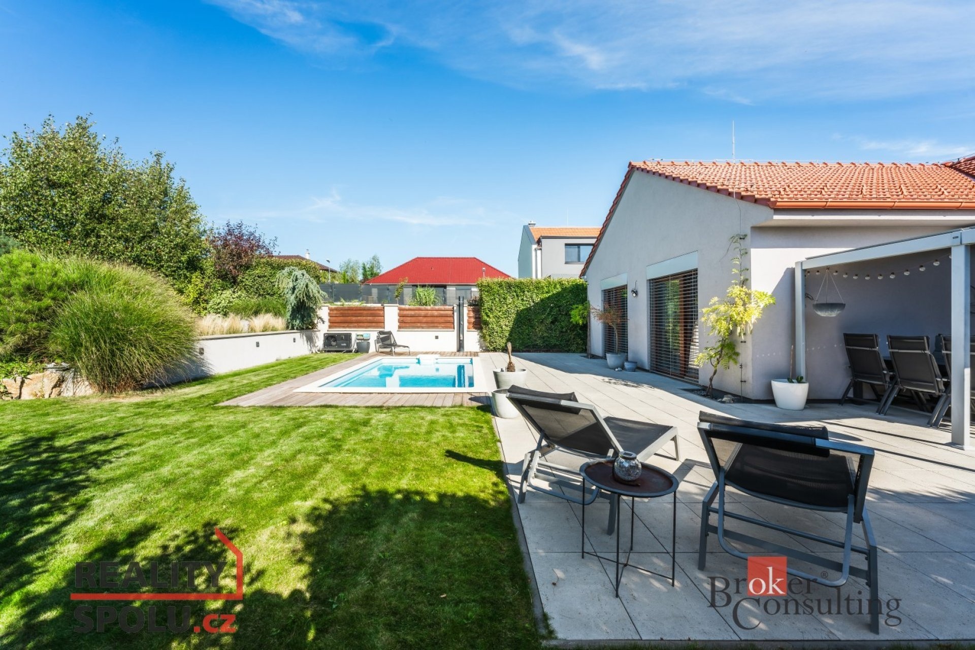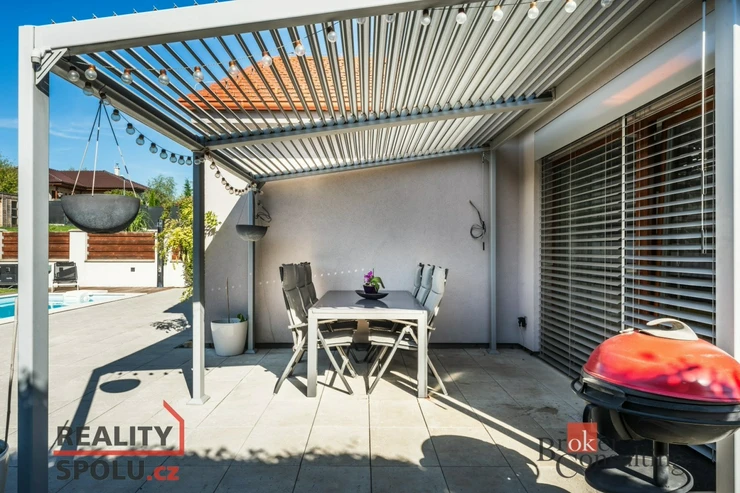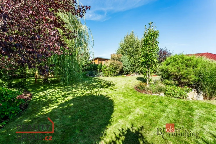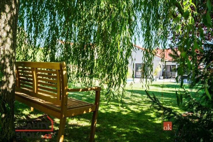 K domu náleží rozlehlá zahrada s bazénem, pergolou a zahradním domkem s úložným prostorem pro nábytek a zahradní náčiní. Již na první pohled Vás tento dům okouzlí svou propojeností se zahradou. Díky velký francouzským oknům a vzdušnému interiéru, je hranice zelené oázy klidu a obývaného prostoru téměř neviditelná. Ideální volba pro rodiny s dětmi nebo pro ty, kdo oceňují prostorné a komfortní bydlení.