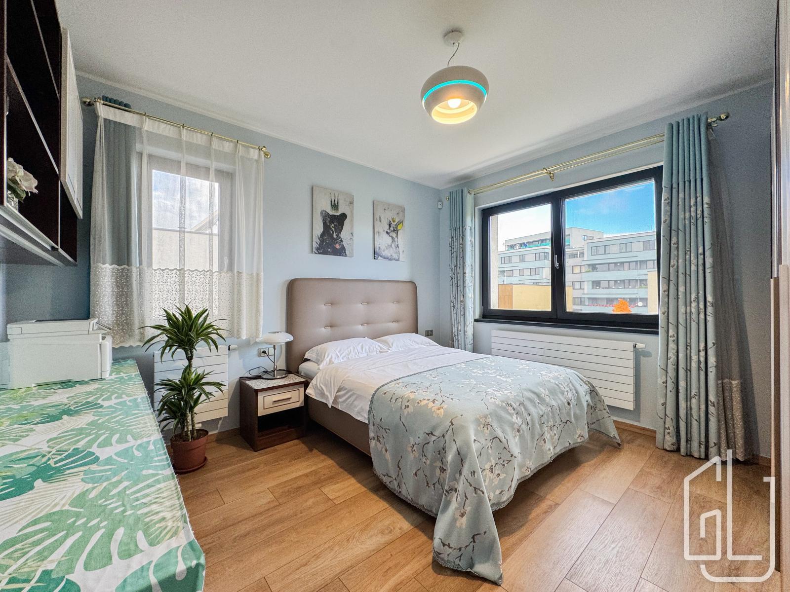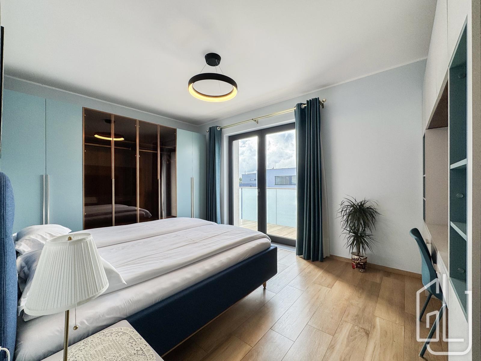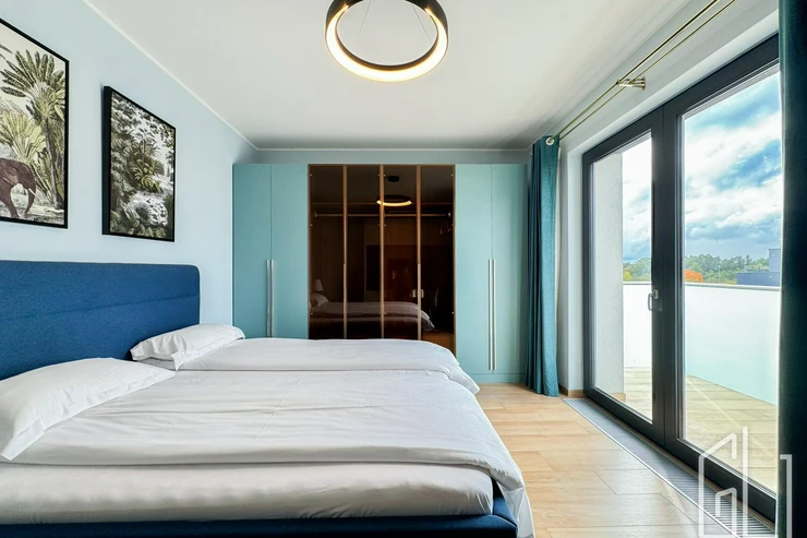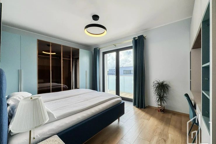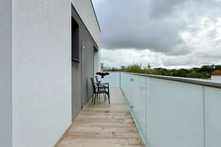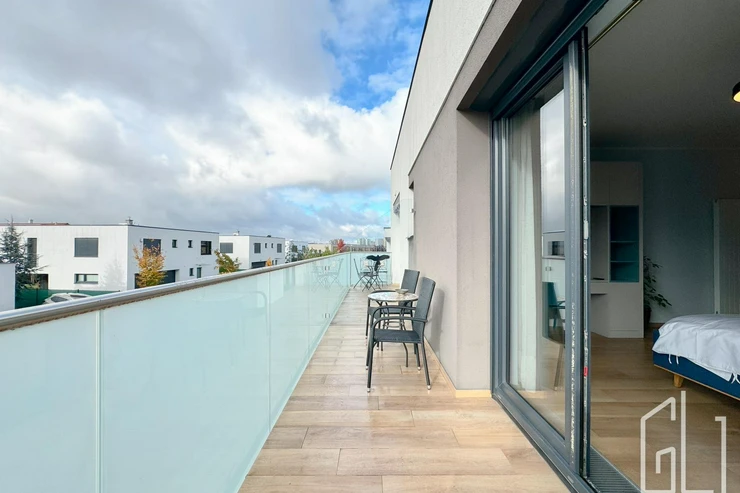 Součástí patra jsou také dva prostorné balkony (každý o velikosti 7 m), které poskytují výhled do zeleně a zajišťují maximální soukromí.