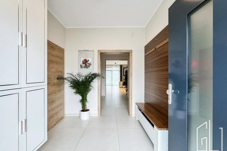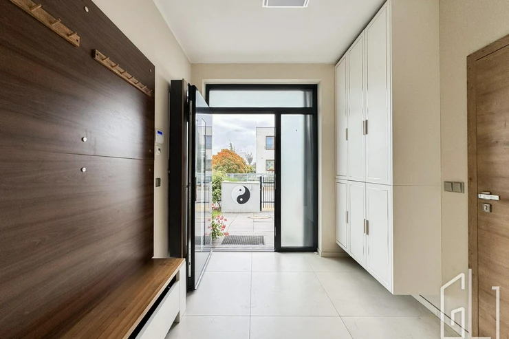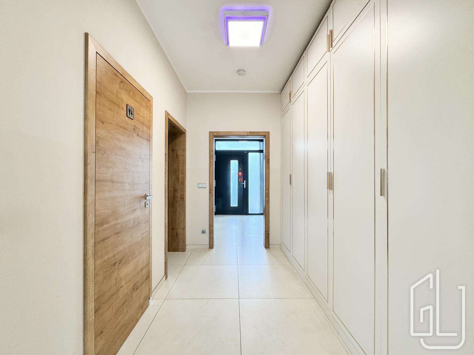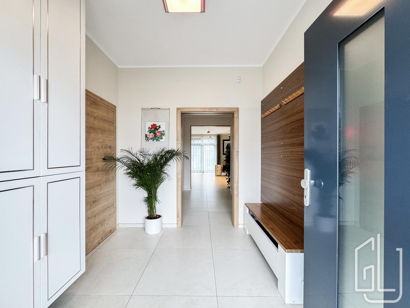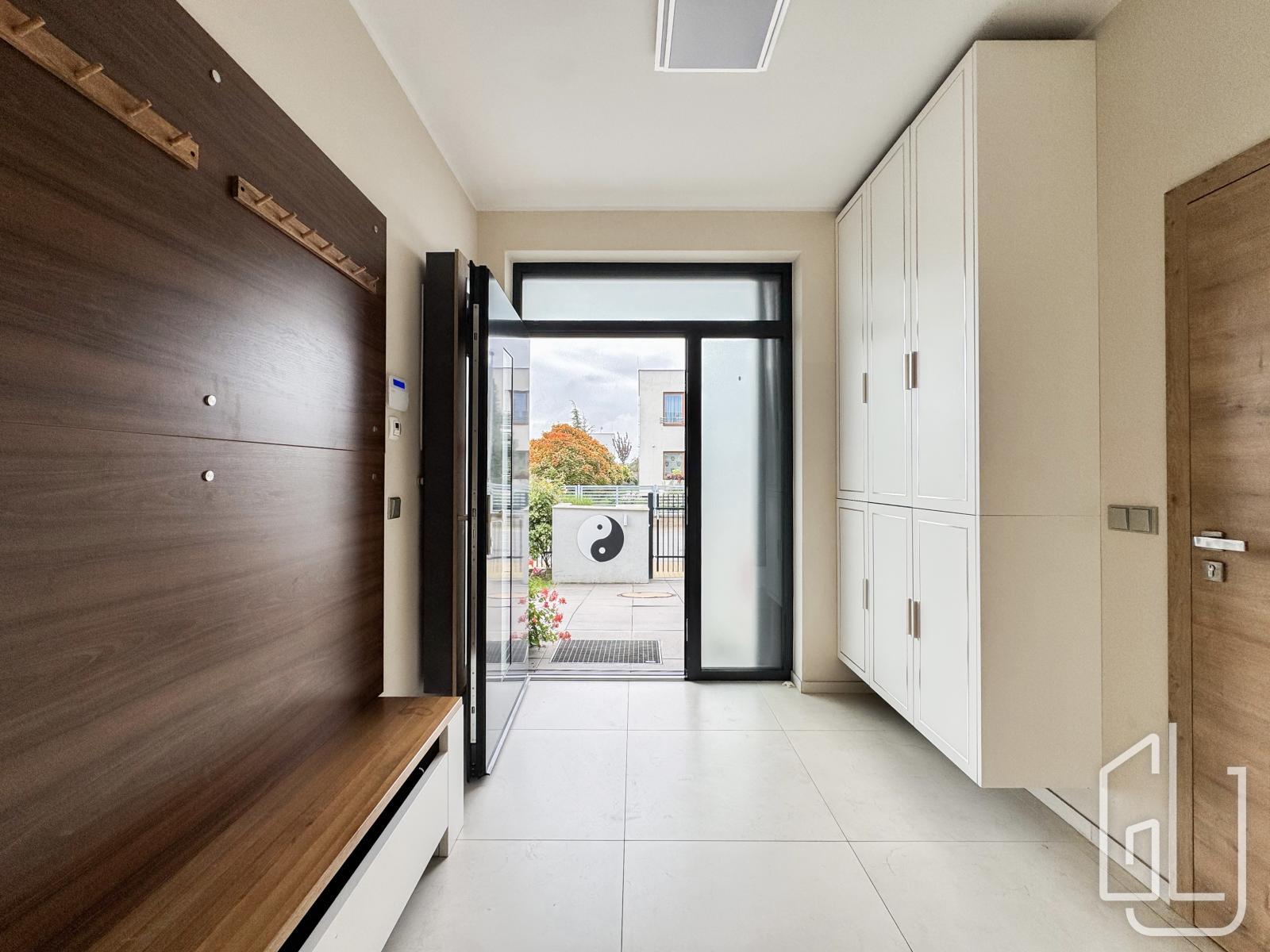 Reprezentativní vstupní hala plynule přechází do prostorného obývacího pokoje s designovou kuchyní, vybavenou nejmodernějšími vestavěnými spotřebiči.