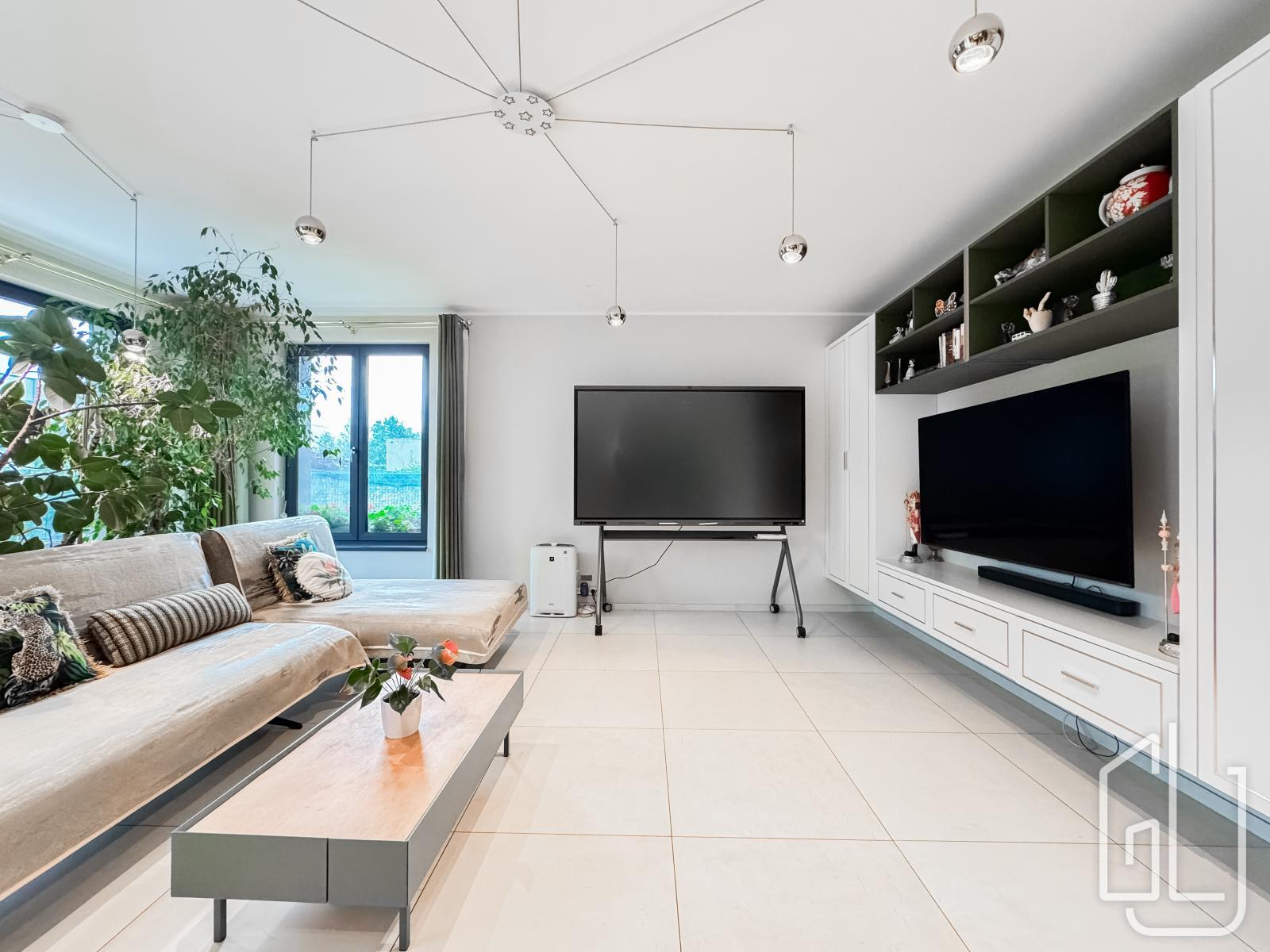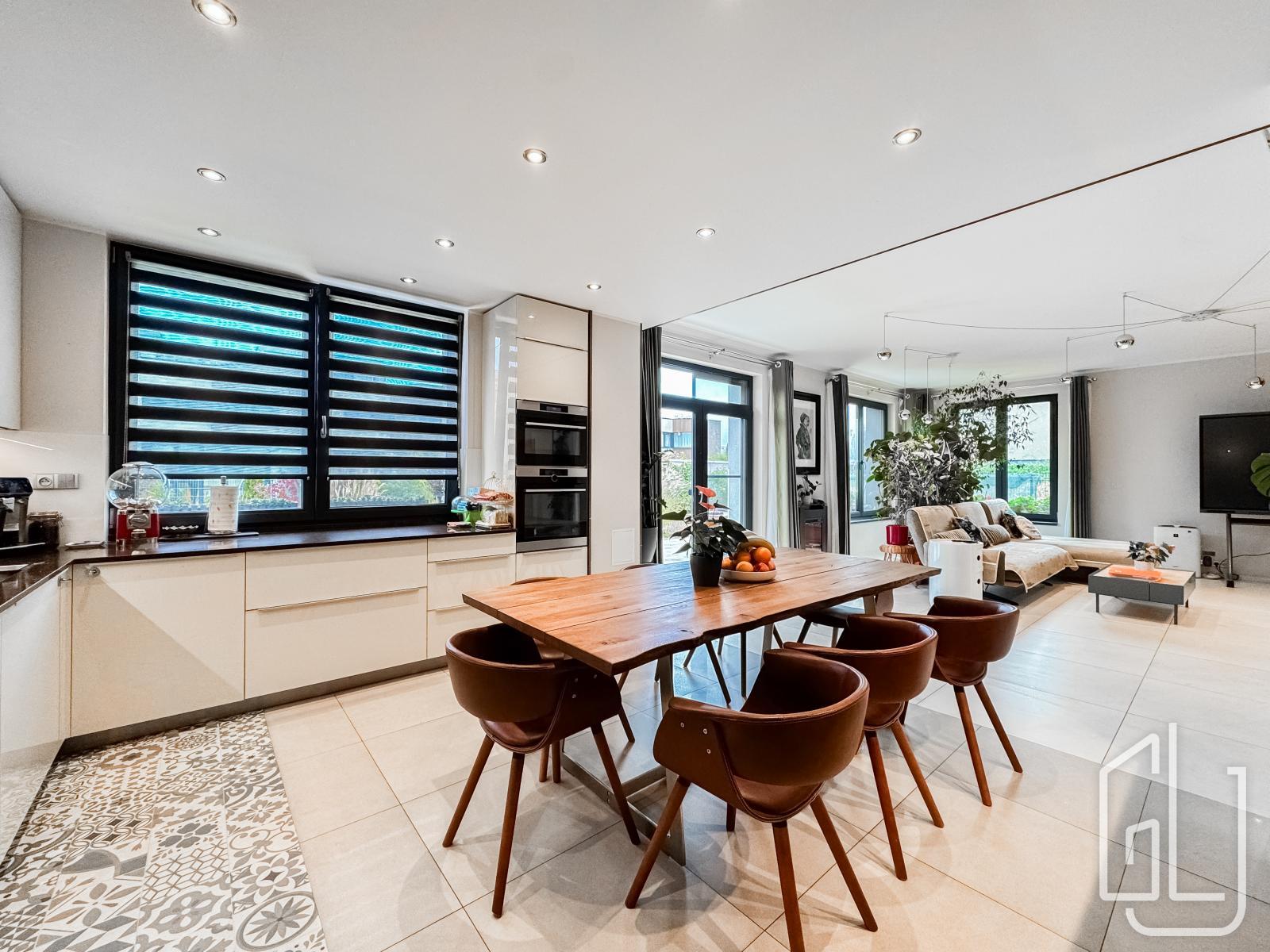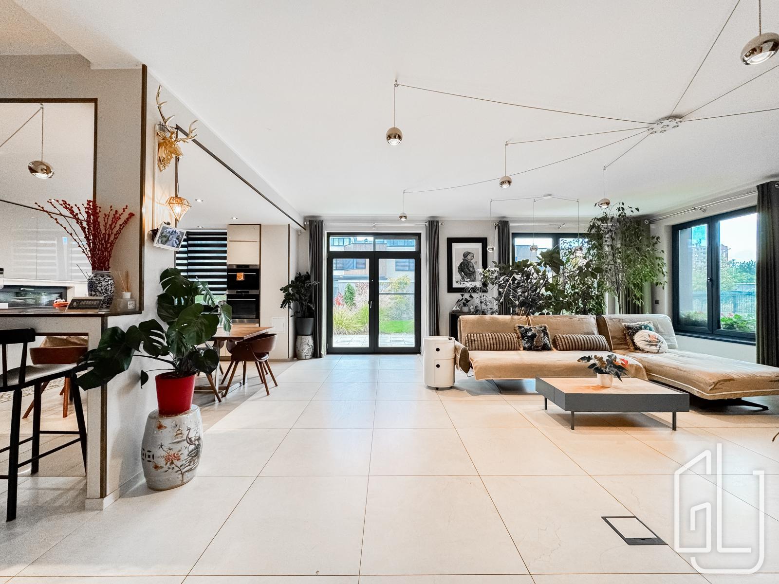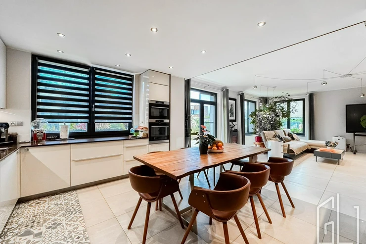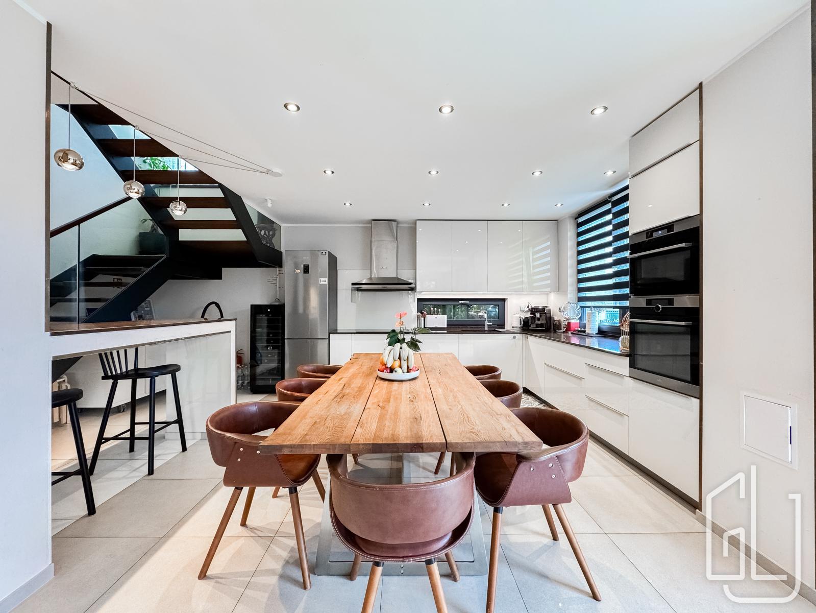 Reprezentativní vstupní hala plynule přechází do prostorného obývacího pokoje s designovou kuchyní, vybavenou nejmodernějšími vestavěnými spotřebiči.