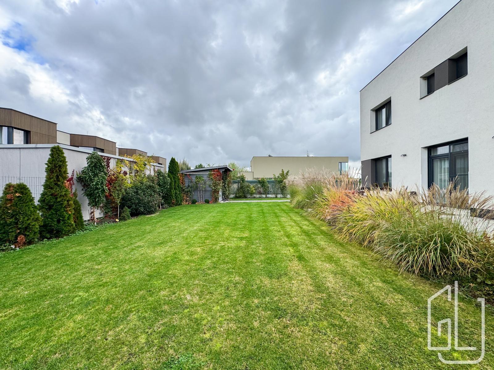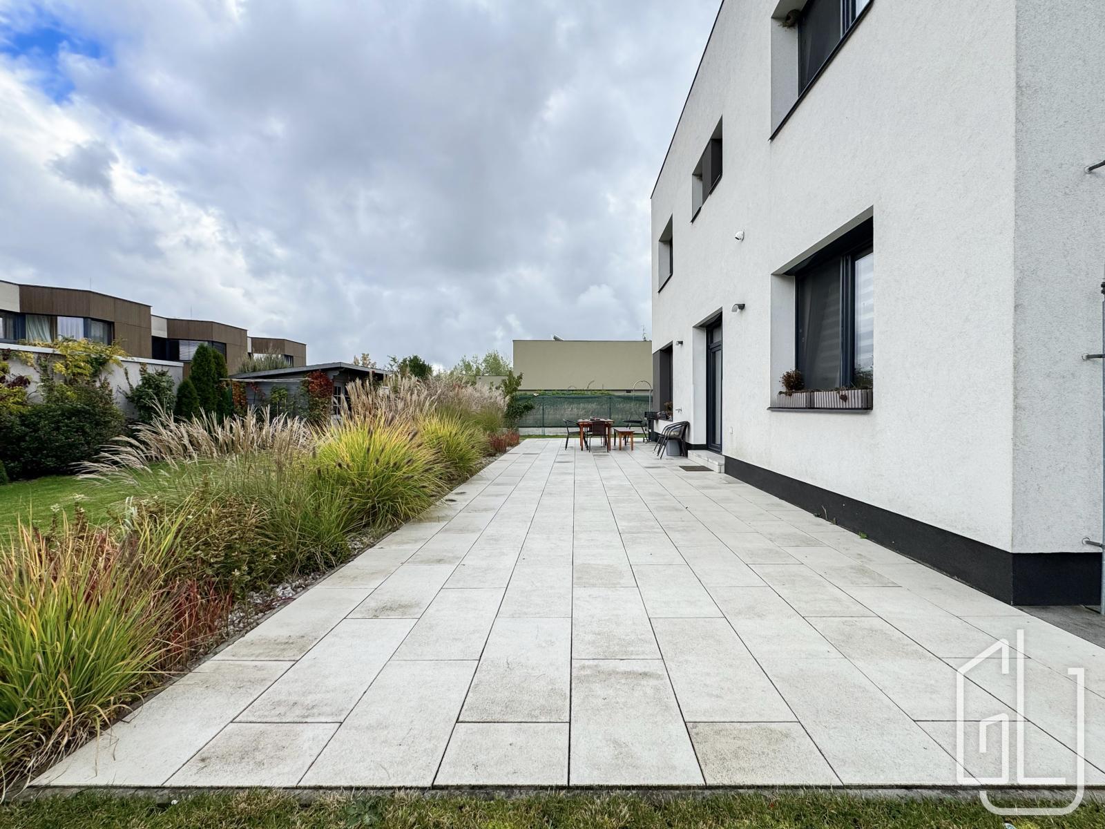 Zahrada je profesionálně upravená a nabízí terasové posezení, prostor pro grilování a odpočinek.