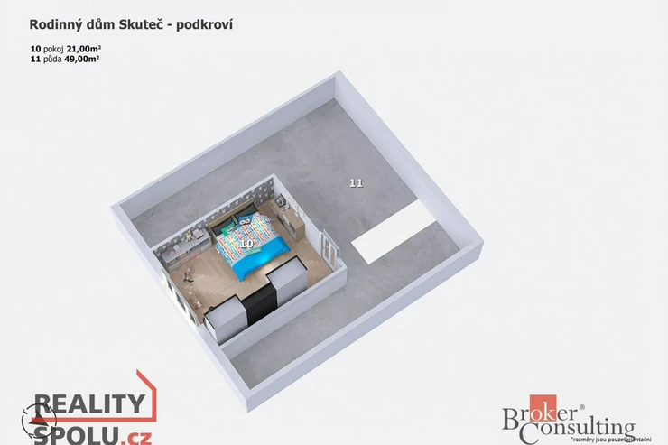 Dispozičně dům nabízí v přízemí kuchyni, obývací pokoj, další samostatný pokoj a koupelnu. V patře se nachází jeden prostorný pokoj a po obou stranách dva půdní prostory, které lze využít například jako úložné prostory nebo je stavebně upravit. Celková dispozice domu je 3+1 s užitnou plochou 82 m², přičemž půdní prostory nejsou do této plochy započítány.