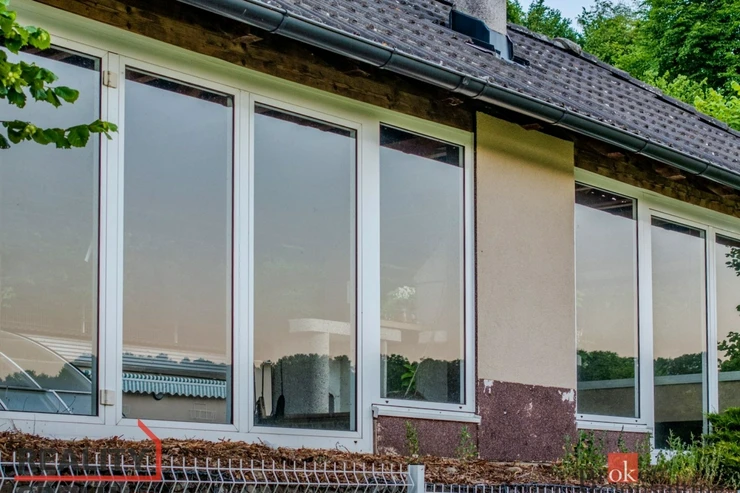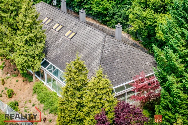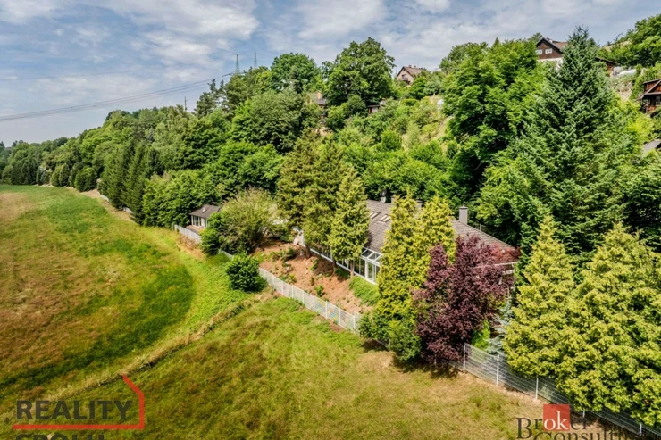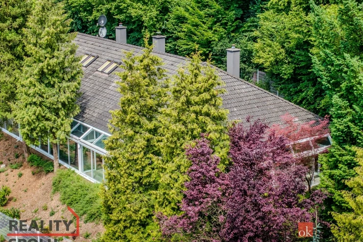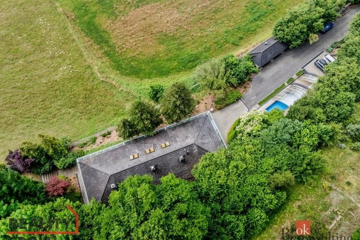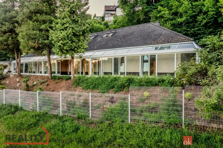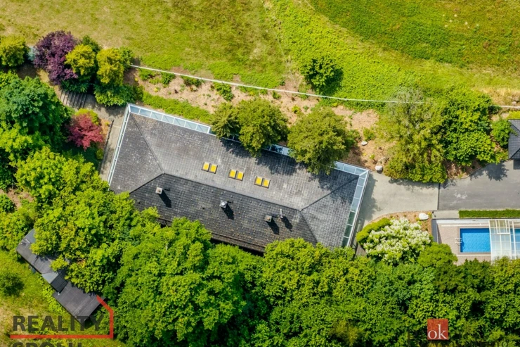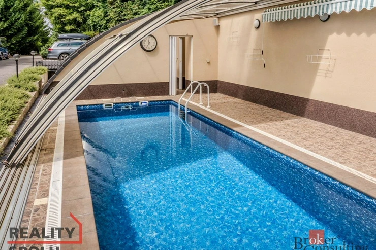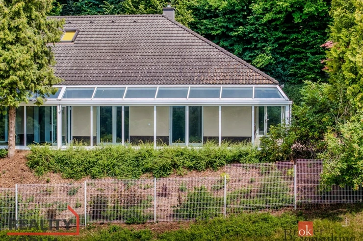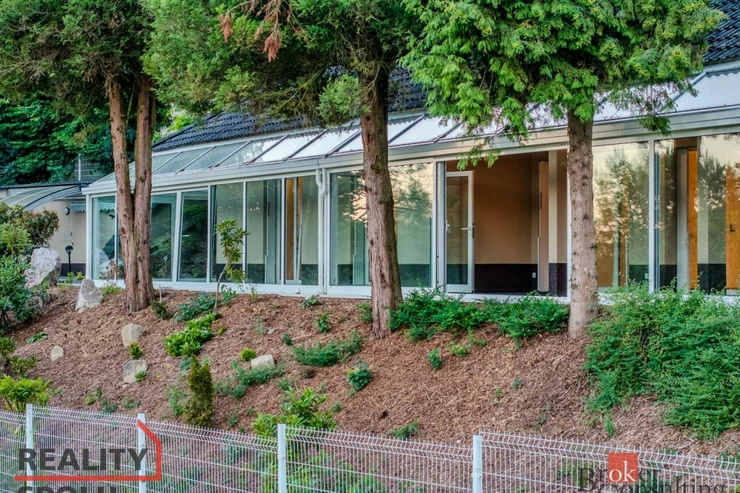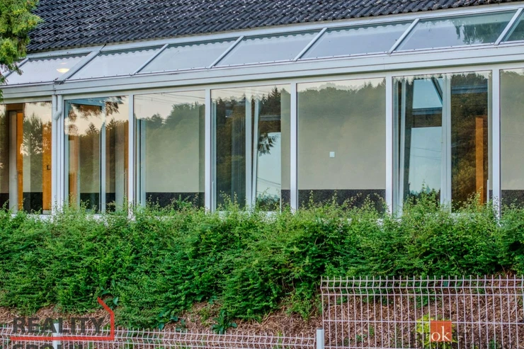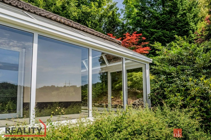 Kolem celého průčelí domu je zimní zahrada z hliníkových profilů a HS portálů. K domu vede vlastní příjezdová cesta ,parkování je vyřešeno pomocí tří parkovacích míst a tří garáží. K domu také patří přístavek s bazénem , vířivkou a sociálním zařízením a pergola s venkovním krbem.