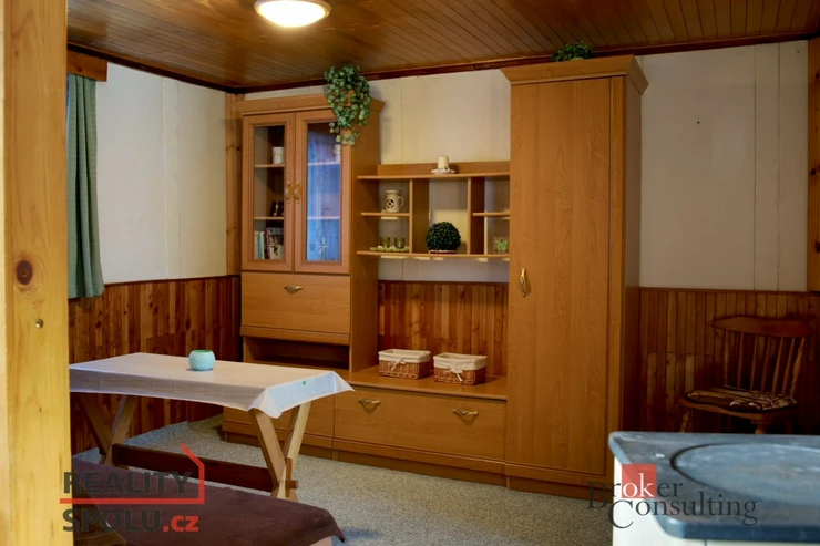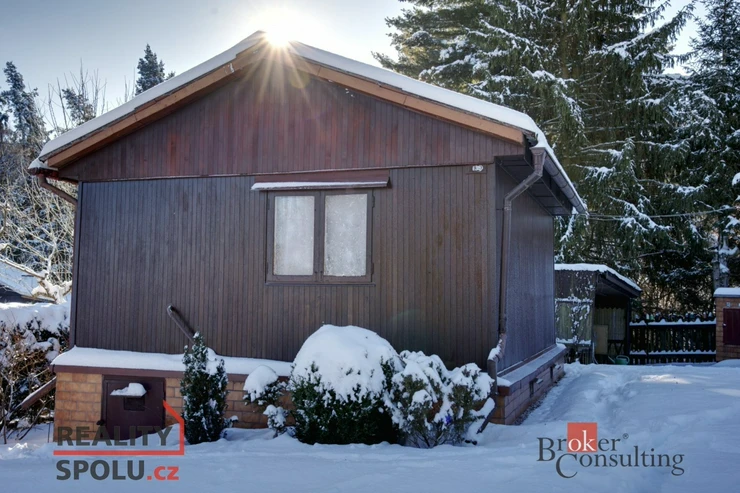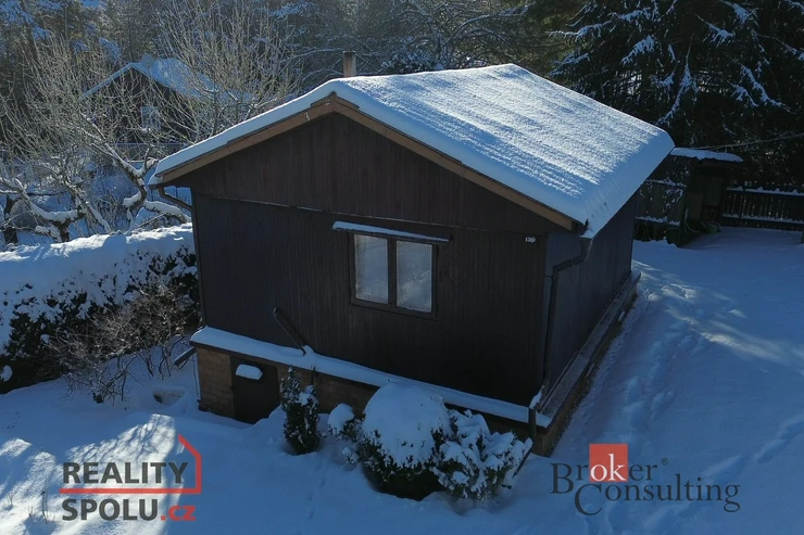 Chata má užitnou plochu cca 38 m² a praktickou dispozici 2 pokoje + kuchyňka. Stavba je postavená na zděných základech, je částečně podsklepená a má sedlovou střechu, což zajišťuje stabilitu i dobré využití prostoru.