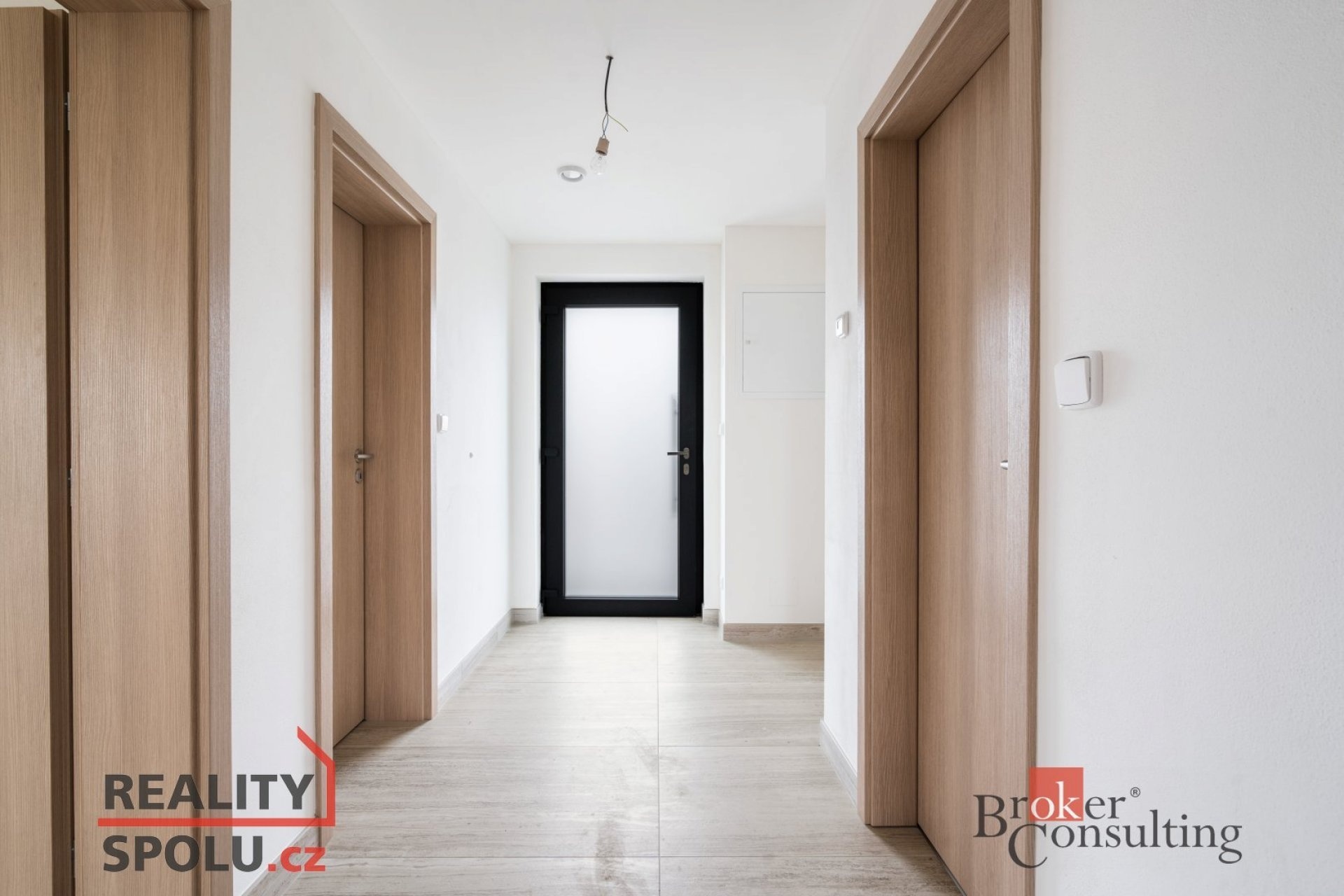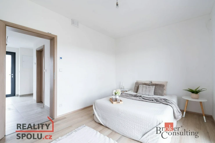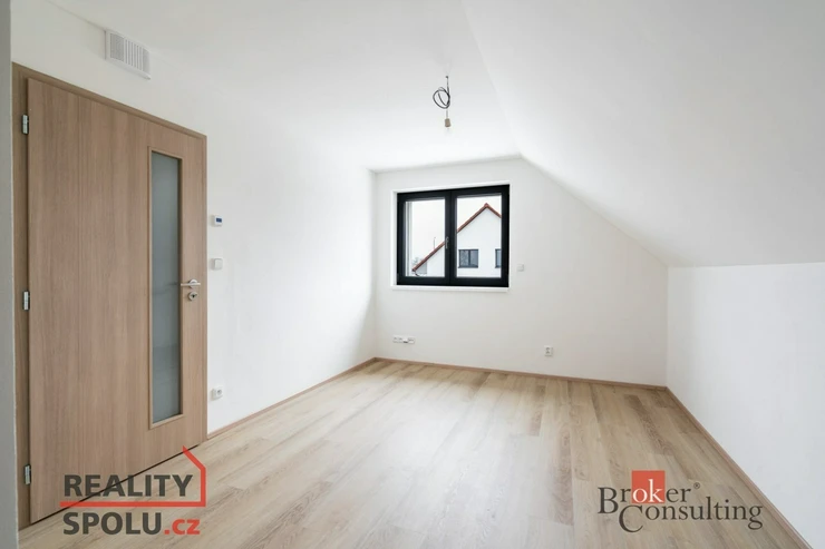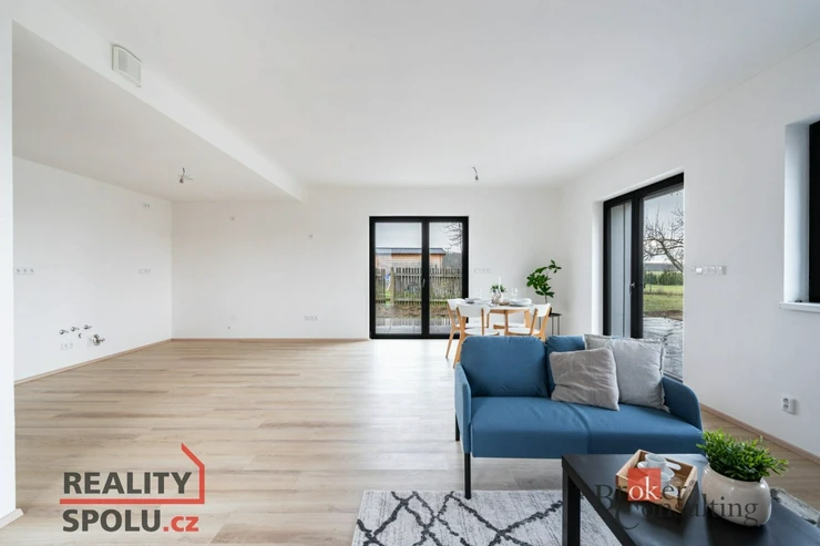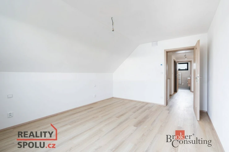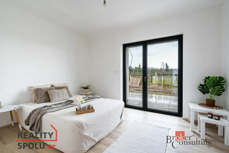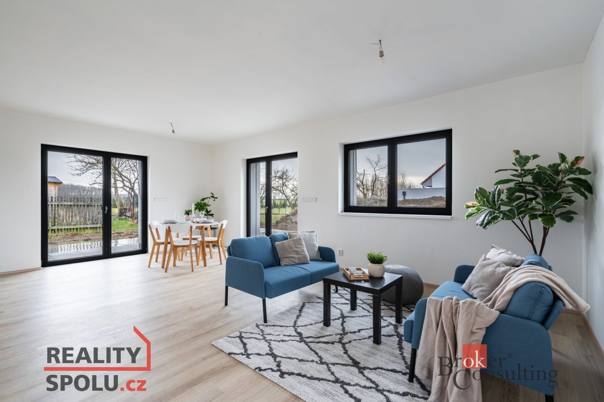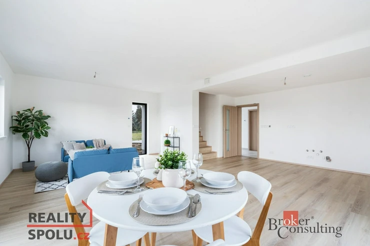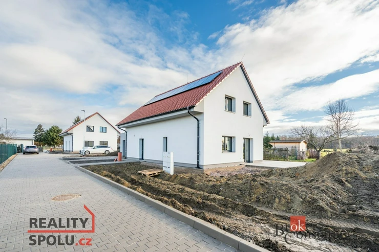 Jedná se o zděnou stavbu (Ytong) se dvěma nadzemními podlažími. Tato novostavba o dispozici 5+kk se nachází na pozemku o rozloze 723 m², přičemž celková plocha domu činí 164,8 m². V přízemí se nachází prostorný obývací pokoj spojený s kuchyní (41,1 m²) a vstupem na terasu (40 m²), dále je zde místnost, která může sloužit jako pokoj pro hosty či pracovna (11,8 m²), koupelna se záchodem (4,6 m²), technická místnost (2,9 m²) a ještě jedna menší místnost pod schody (4,0 m²). V prvním patře jsou dva pokoje s vlastní šatnou (17,8 m² a 16,0 m²), dále ložnice (16,0 m²) se samostatnou šatnou (3,0 m²) přes chodbu a také druhá koupelna (6,1 m²). Jistě také oceníte pudní prostor o velikosti cca 40 m².