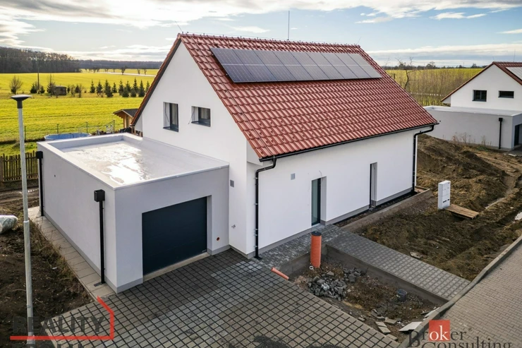 U domu se nachází také prostorná garáž se skladem zahradního nářadí (28,5 m²), kde je uložena technologie FVE s bateriovým úložištěm. V současné době ještě probíhají terénní úpravy a výstavba plotu.
