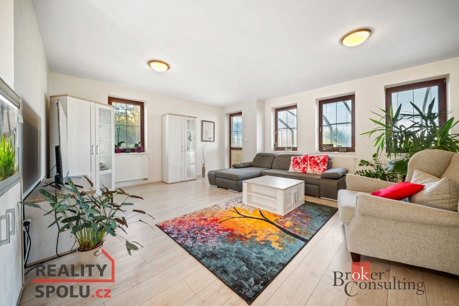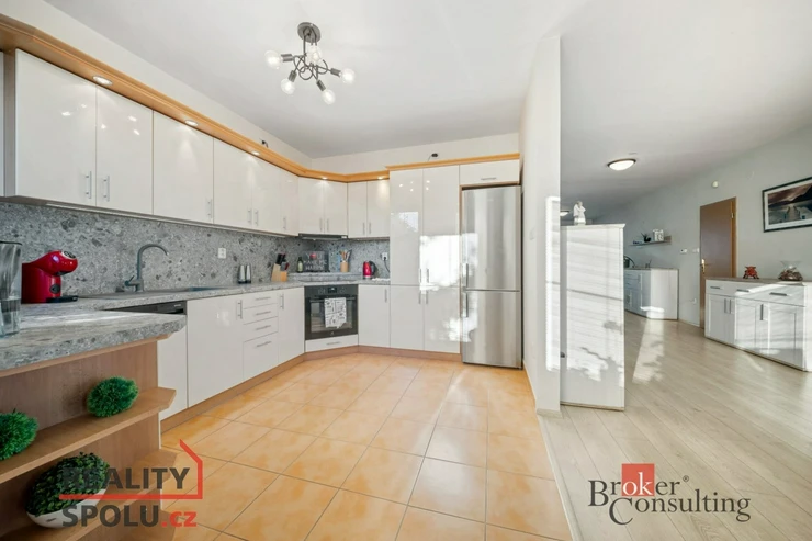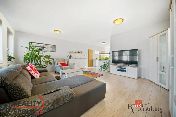 prostorný obývací pokoj propojený s kuchyní a jídelnou – tvořící příjemnou společenskou zónu
