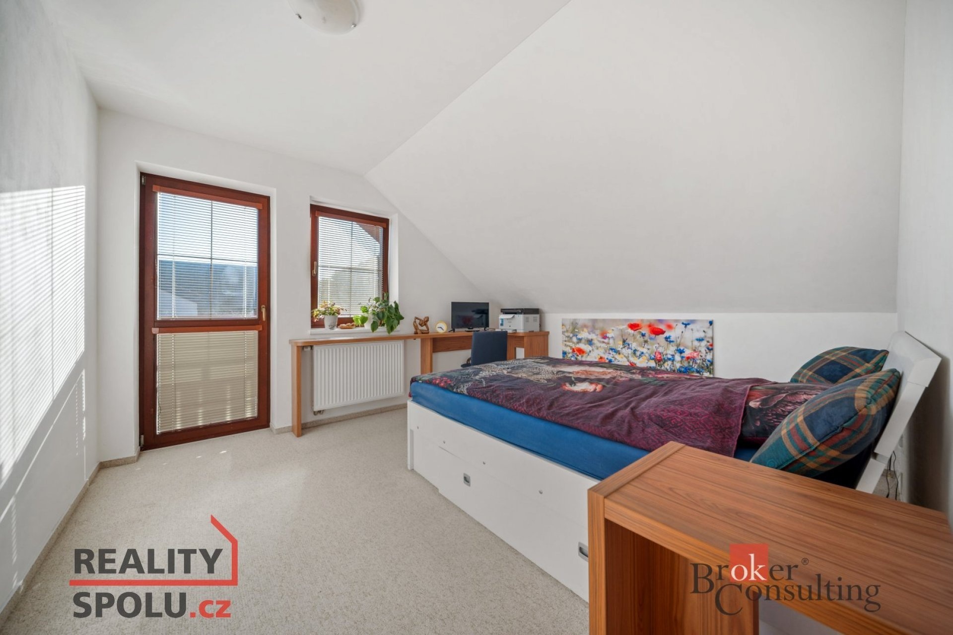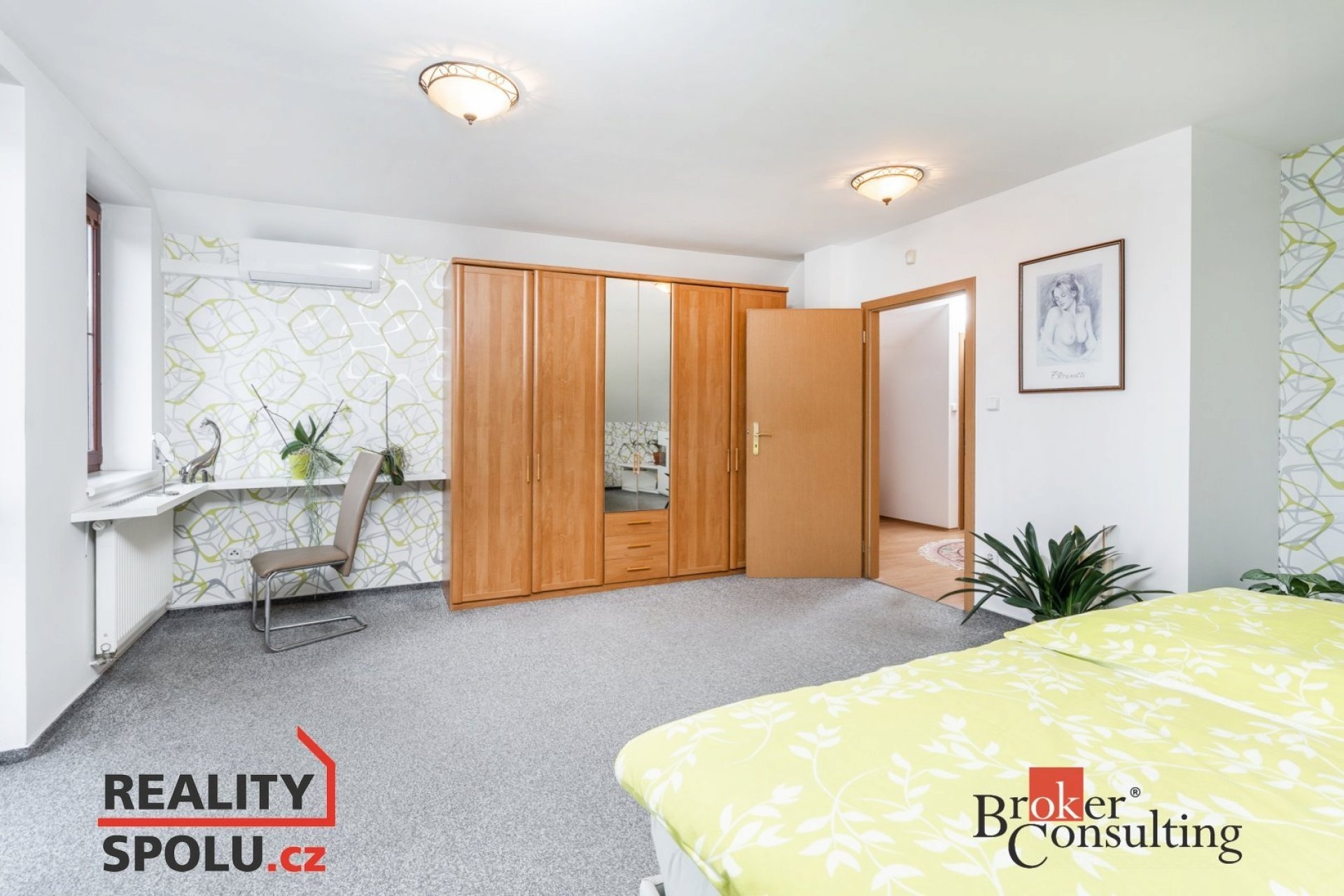 V patře jsou čtyři samostatné pokoje, z nichž jeden je využíván jako šatna (s vestavěnou skříní po celé délce). Dále je zde druhá koupelna s vanou a samostatná toaleta. Hlavní ložnice je vybavena klimatizací.