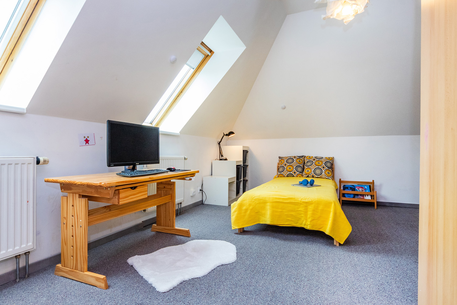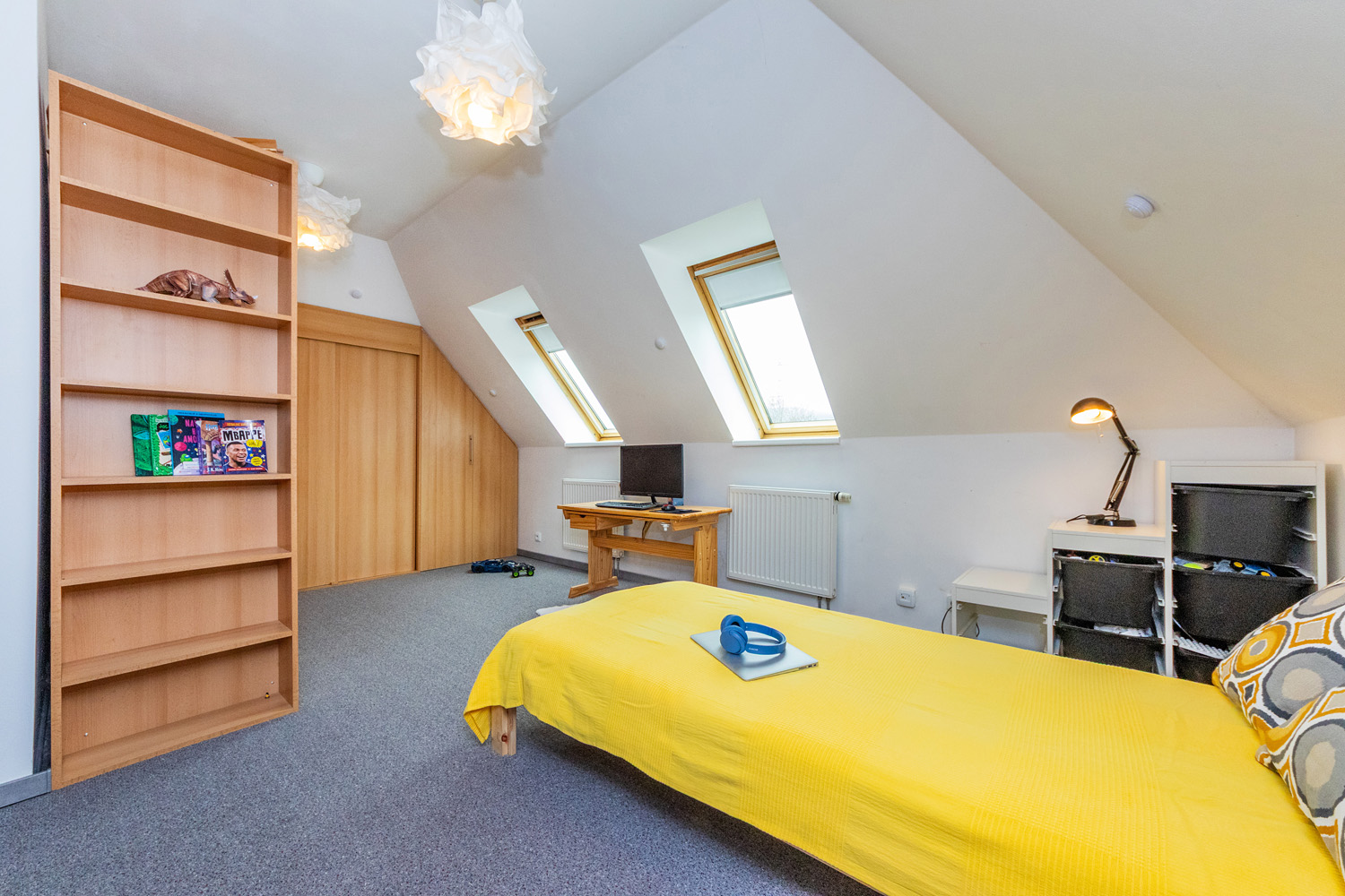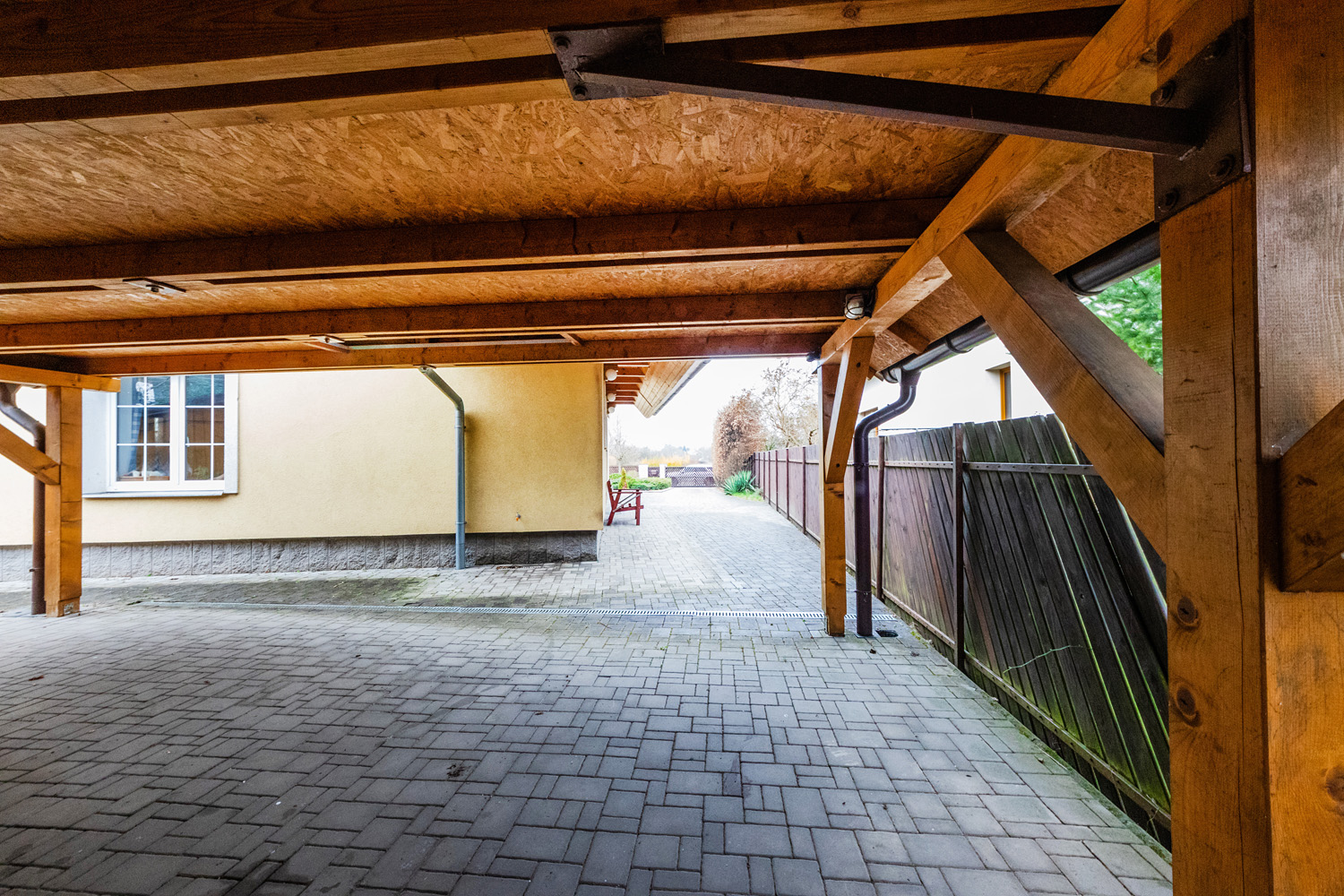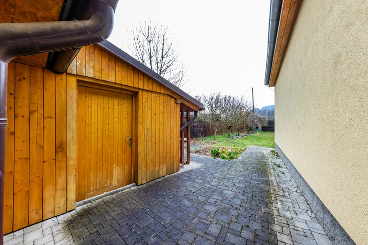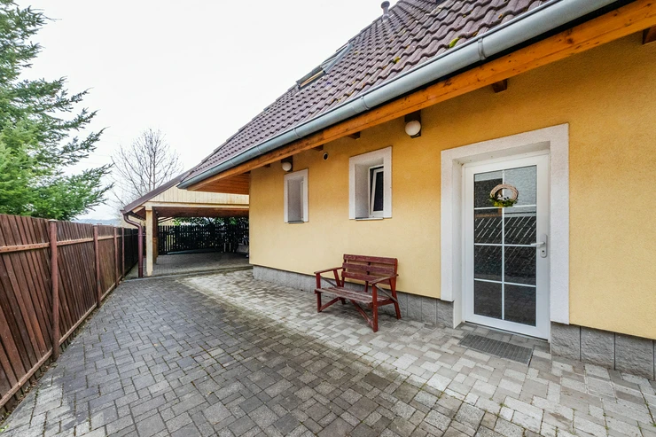 The first floor (93m²) offers: 3 bedrooms with built-in furniture, a bathroom (bath, shower, toilet), a laundry/technical room, and a balcony. The house has plastic windows, electrical security system, gas heating plus wood stoves in the living room, a carport for two cars with an attic (approx. 36m2) for storage, a workshop which can also be used as a bike storage, and its own well. The house is eligible for a renovation grant.