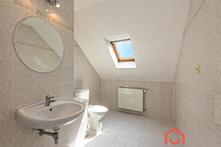 Attic: two spacious bedrooms (47 sqm and 42 sqm) with exposed wooden beams, bathroom with corner bath and toilet.