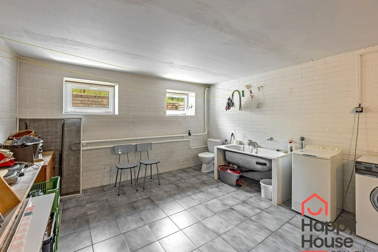 Basement: utility room, laundry/drying room (with a sink, toilet, washing machine, dryer, and shelves), a social room with a fireplace (49 sqm), a beautiful and dry cellar (not shown in the plan), and a spacious garage.