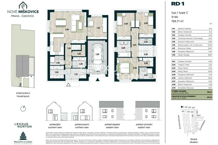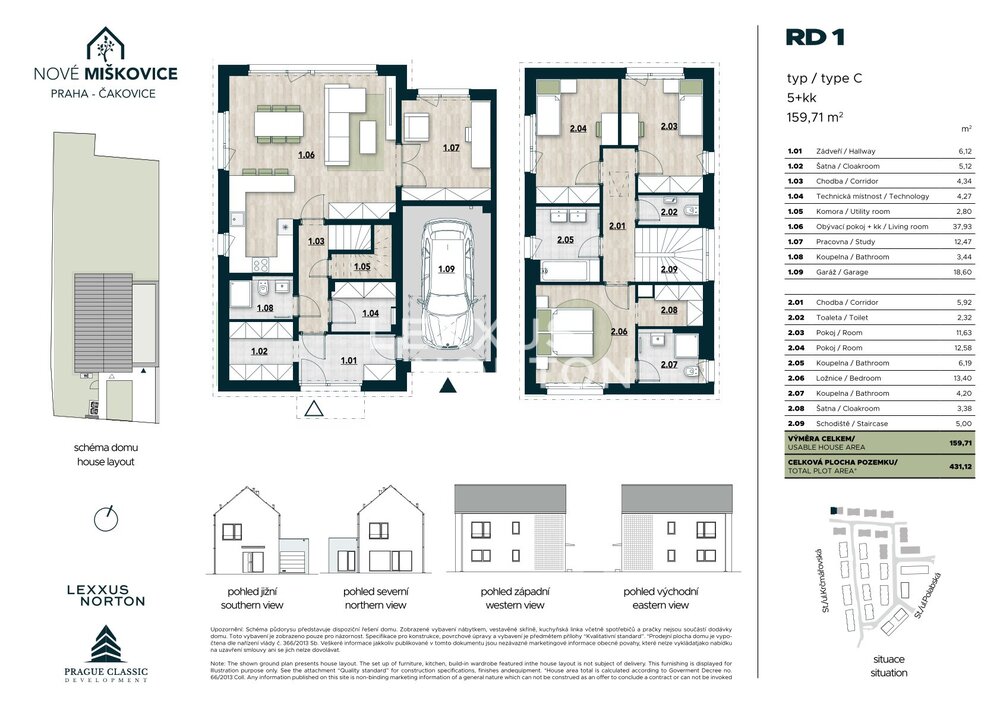We are offering for sale a spacious four-bedroom family house in the Nove Miskovice residential project, which stands out with its generous usable area of 159.70 sqm and its own plot of land measuring 431.12 sqm. The layout of the house is designed with an emphasis on comfortable family life, plenty of privacy, and a natural connection between the interior and the garden.On the ground floor of the house, there is a spacious living room with a kitchenette and direct access to the garden, a separate room suitable as a study or guest room, a bathroom, a utility room, a storage room, a vestibule, and direct access to the garage. The living area is clearly connected to the garden, which offers plenty of space for relaxation and family activities.Upstairs there are three separate rooms, a bedroom, two bathrooms, a dressing room, and a hallway, which comfortably separates the quiet part of the house from the common area on the ground floor. The layout allows for comfortable living even for a larger family and at the same time provides enough space for working from home.The house is built to a high standard with an emphasis on functionality and long-term cost-effective operation. The furnishings include vinyl flooring from Alpod, SIKO tiles and wall tiles, including accessories, and interior doors of a higher standard. Plastic windows with insulated triple glazing provide plenty of daylight. The house is equipped with a heat pump for heating and hot water and controlled ventilation with air recovery, making the house very energy efficient. The houses are not connected to gas. The house meets energy efficiency standards (PENB: B).Nove Miskovice is being built between Polabska and Krcmarovska streets as a new residential area of Prague – Cakovice. The project will offer a new square with shops, services, and an electrified bus stop.The Praha-Cakovice train station provides connections to the center of Prague in approximately 22 minutes. The location thus offers an ideal balance between quiet family living and accessibility to the city.