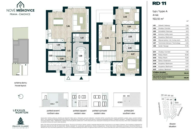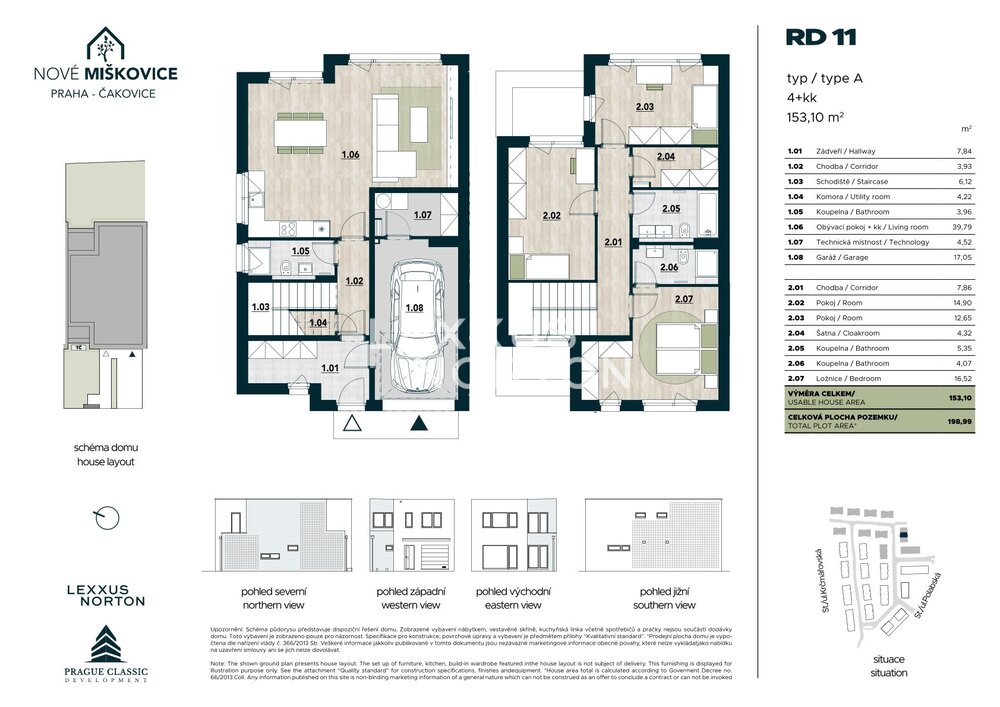We are offering for sale a three-bedroom family house in the newly emerging residential district of Nové Miškovice, which stands out with its usable area of 153.10 sqm and its own plot of land measuring 199 sqm. The house is designed with an emphasis on practical family layout, ample space, and a natural connection between the interior and the garden, which becomes an everyday part of living.On the ground floor of the house, there is a spacious living room with a kitchenette measuring 39.79 sqm with direct access to the garden, a bathroom, a utility room, a storage room, a vestibule, a hallway, and a staircase. The house has a flat roof, which emphasizes its modern look. The layout also includes a 17.05 sqm garage, which is directly connected to the living area of the house and ensures maximum comfort in everyday use.Upstairs, there are three separate rooms measuring 14.90 sqm, 12.65 sqm, and 16.52 sqm, as well as two bathrooms, a dressing room, and a hallway. The upper floor forms the quiet zone of the house with plenty of space for the family, storage solutions and a possible home office. The layout is designed to make the house feel airy, clear and functional.The standard finish includes vinyl flooring from Alpod, SIKO tiles and wall tiles including accessories, interior doors in a higher standard finish, and plastic windows with triple glazing. The family homes are equipped with a heat pump for heating and hot water, along with air recovery, making the homes energy efficient. The family homes are not connected to gas. The home meets energy efficiency standards (PENB: B).With its own garden, direct connection between the living space and the exterior, and logical layout, the house is an ideal choice for family life in a quiet environment with excellent access to the center of Prague.Nove Miskovice is being built between Polabska and Krcmarovska streets as a new residential area of Prague – Cakovice. The project will offer a new square with shops, services, and an electrified bus stop.The Praha-Cakovice train station provides connections to the center of Prague in approximately 22 minutes. The location thus offers an ideal balance between quiet family living and accessibility to the city.
