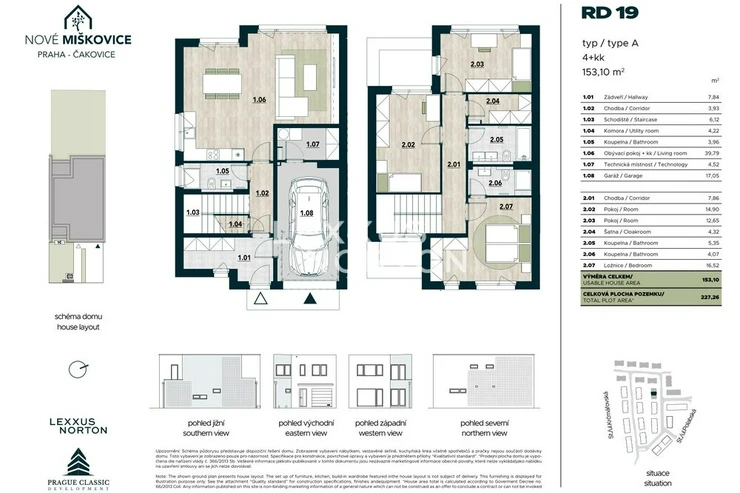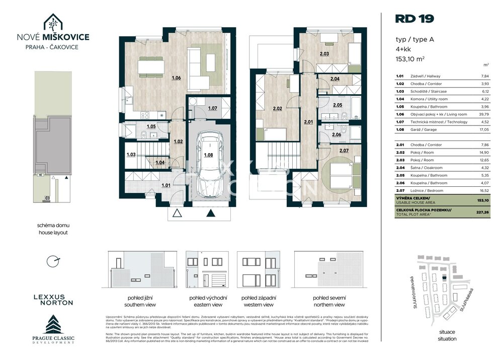 We are offering for sale a three-bedroom family house in the newly emerging residential district of Nové Miskovice, which stands out with its usable area of 153.10 sqm and its own plot of land measuring 227.26 sqm. The house is designed with an emphasis on practical family layout, ample space, and a natural connection between the interior and the garden, which becomes an everyday part of living.On the ground floor of the house, there is a spacious living room with a kitchenette measuring 39.79 sqm with direct access to the garden, a bathroom, a utility room, a storage room, a vestibule, a hallway, and a staircase. The house has a flat roof, which emphasizes its modern look. The layout also includes a 17.05 sqm garage, which is directly connected to the living area of the house and ensures maximum comfort in everyday use.Upstairs, there are three separate rooms measuring 14.90 sqm, 12.65 sqm, and 16.52 sqm, as well as two bathrooms, a dressing room, and a hallway. The upper floor forms the quiet zone of the house with plenty of space for the family, storage solutions and a possible home office. The layout is designed to make the house feel airy, clear and functional.The standard finish includes vinyl flooring from Alpod, SIKO tiles and wall tiles including accessories, interior doors in a higher standard finish, and plastic windows with triple glazing. The family homes are equipped with a heat pump for heating and hot water, along with air recovery, making the homes energy efficient. The family homes are not connected to gas. The home meets energy efficiency standards (PENB: B).With its own garden, direct connection between the living space and the exterior, and logical layout, the house is an ideal choice for family life in a quiet environment with excellent access to the center of Prague.Nove Miskovice is being built between Polabska and Krcmarovska streets as a new residential area of Prague – Cakovice. The project will offer a new square with shops, services, and an electrified bus stop.The Praha-Cakovice train station provides connections to the center of Prague in approximately 22 minutes. The location thus offers an ideal balance between quiet family living and accessibility to the city.