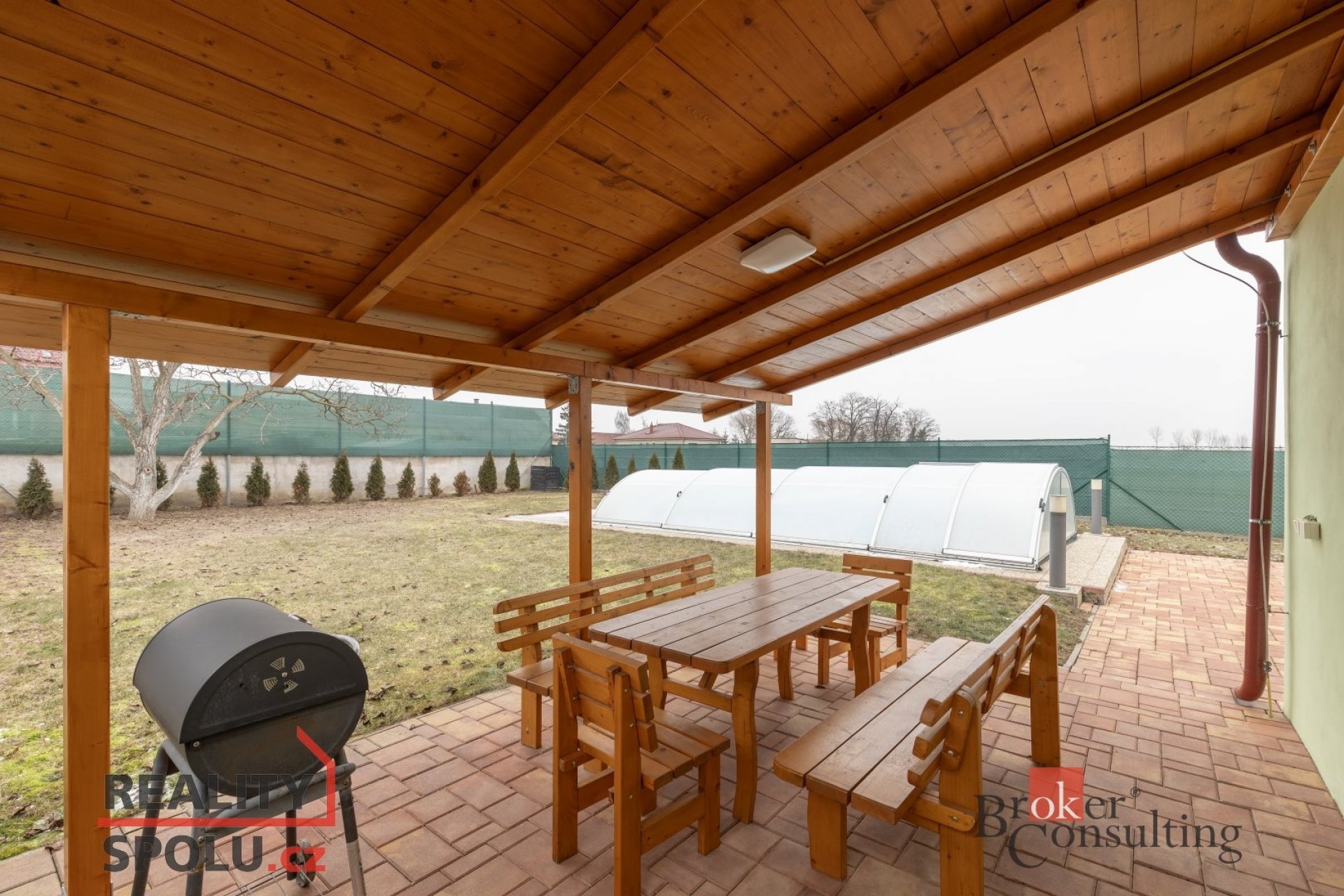 K domu patří také udržovaná zahrada jejíž součástí je i zastřešená venkovní pergola s grilem.