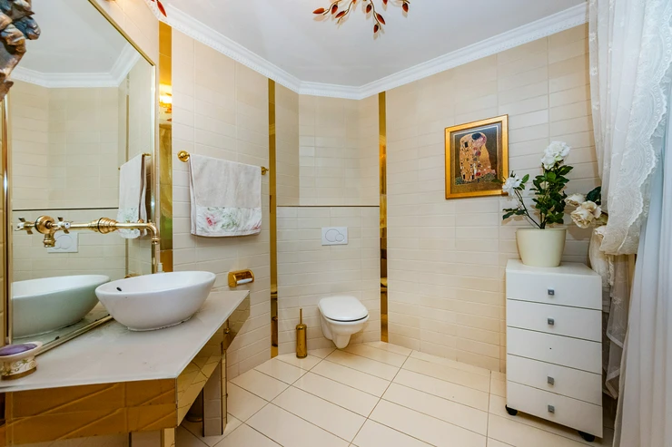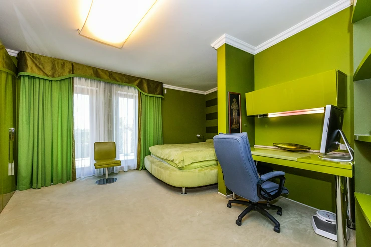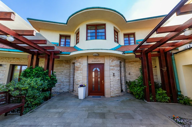 Other luxury features of the RADOST VILLA include: 4 bathrooms, a garage for 2 cars + additional parking in the courtyard, a separate residential unit for housekeeper or staff, a laundry room, 2 drilled wells for the house and garden, a greenhouse, modern technologies such as a heat pump, air conditioning, security camera system, top-quality craftsmanship, and luxurious natural materials, absolute privacy, and a peaceful atmosphere.