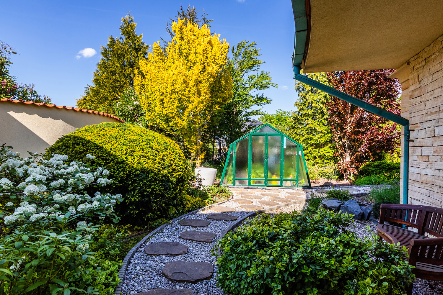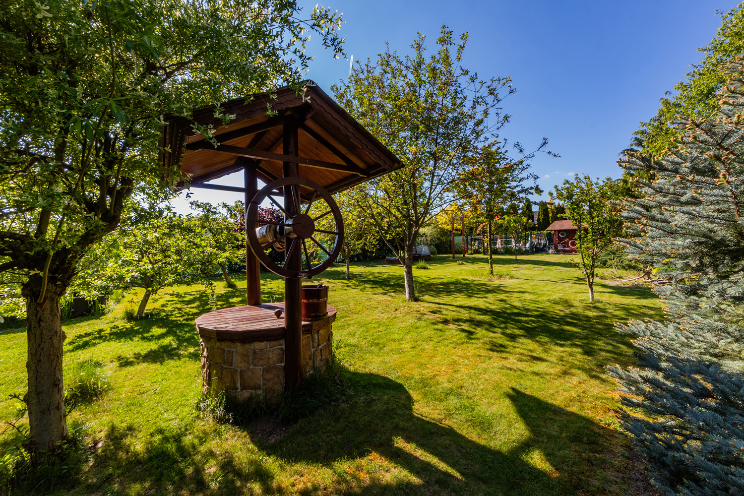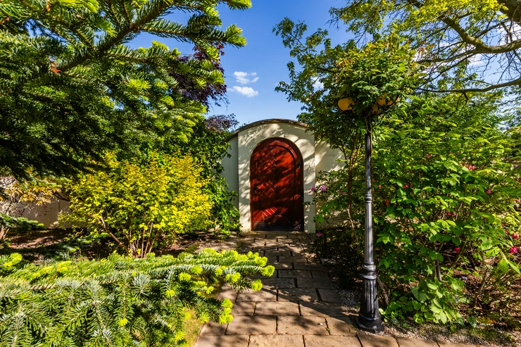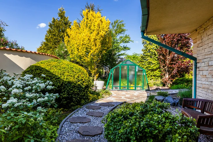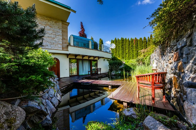 The garden is a true oasis of peace. It is richly planted with fruit trees (apples, cherries, plums, apricots, currants, raspberries, and strawberries) as well as ornamental shrubs and flowers. The property features a garden gazebo and a separate summer house for sleeping in the garden or practicing yoga. The beautifully maintained space offers many corners for resting and relaxation, with stunning views of the garden.