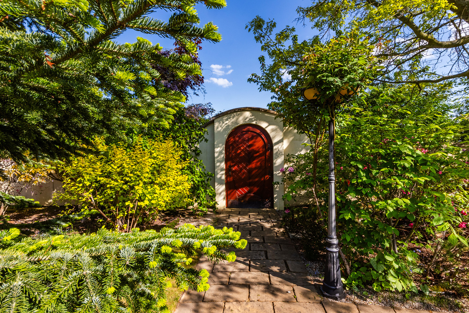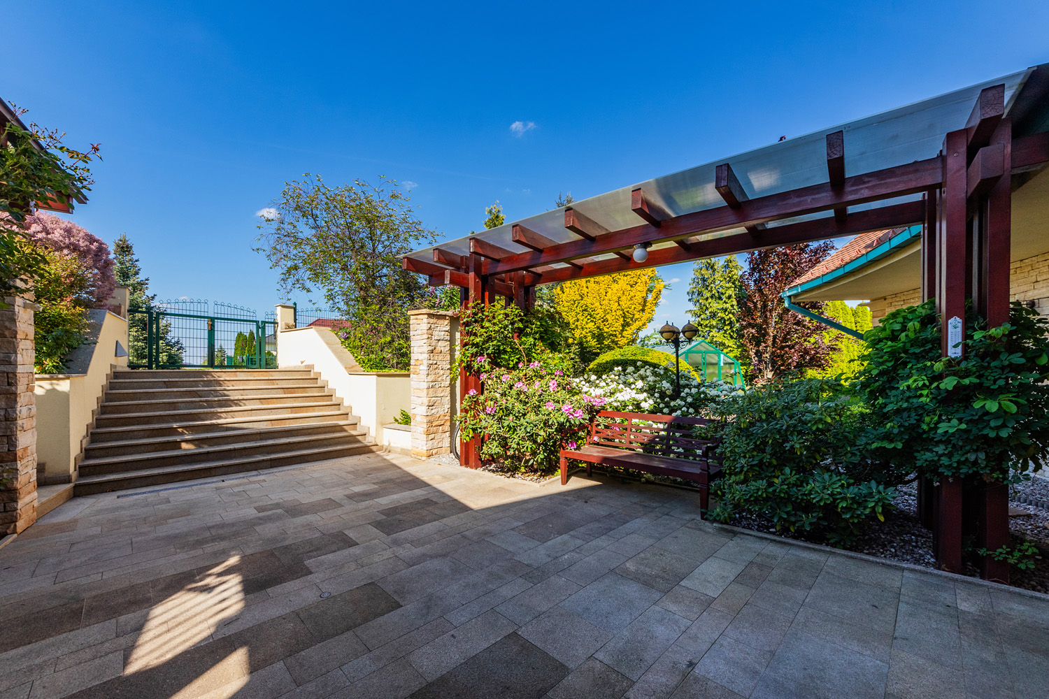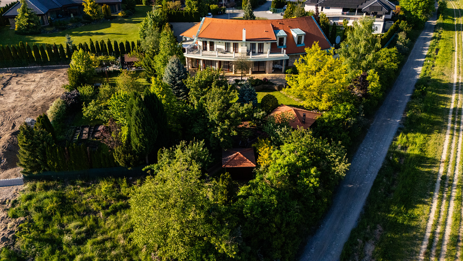The garden is a true oasis of peace. It is richly planted with fruit trees (apples, cherries, plums, apricots, currants, raspberries, and strawberries) as well as ornamental shrubs and flowers. The property features a garden gazebo and a separate summer house for sleeping in the garden or practicing yoga. The beautifully maintained space offers many corners for resting and relaxation, with stunning views of the garden.