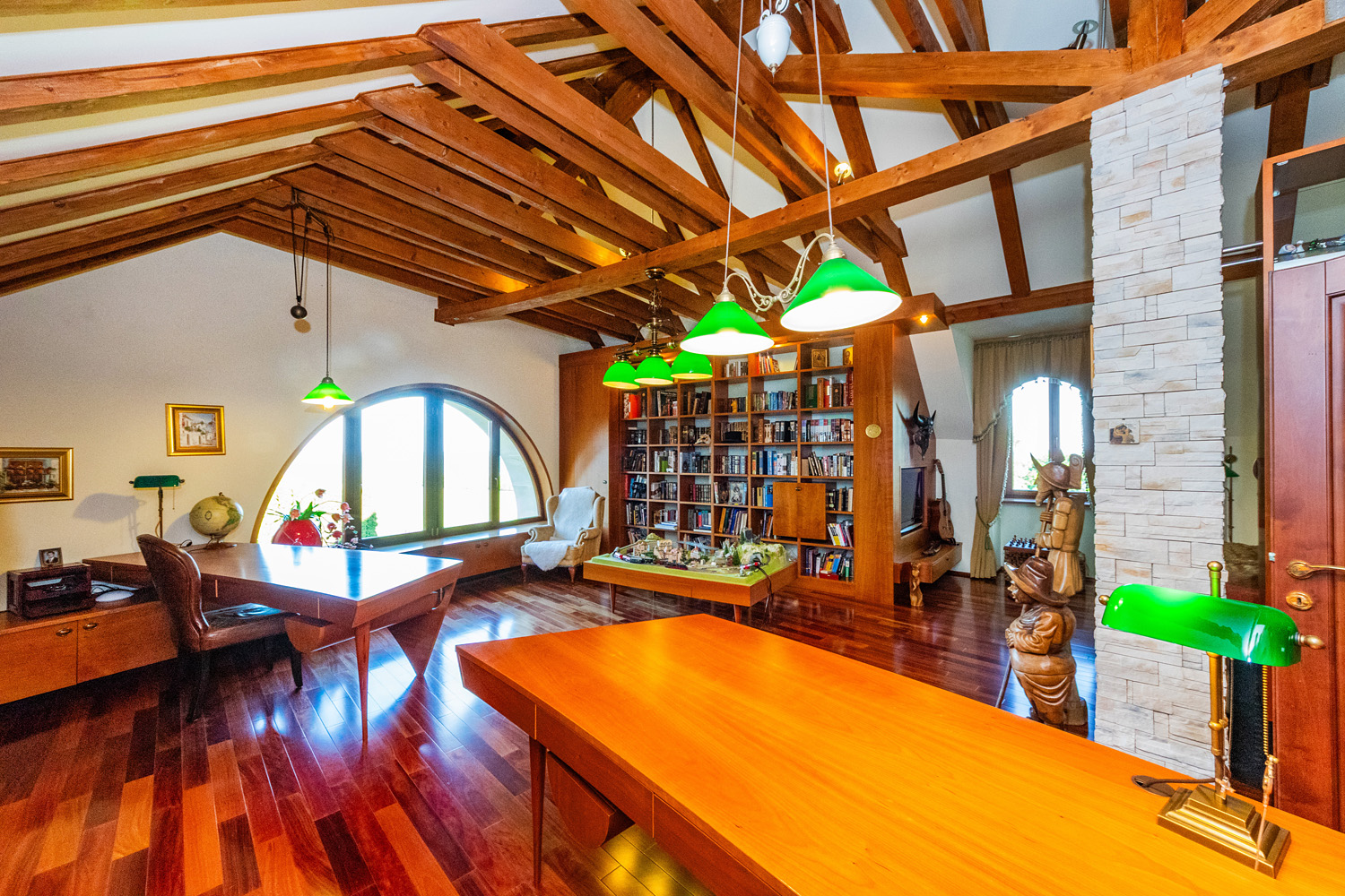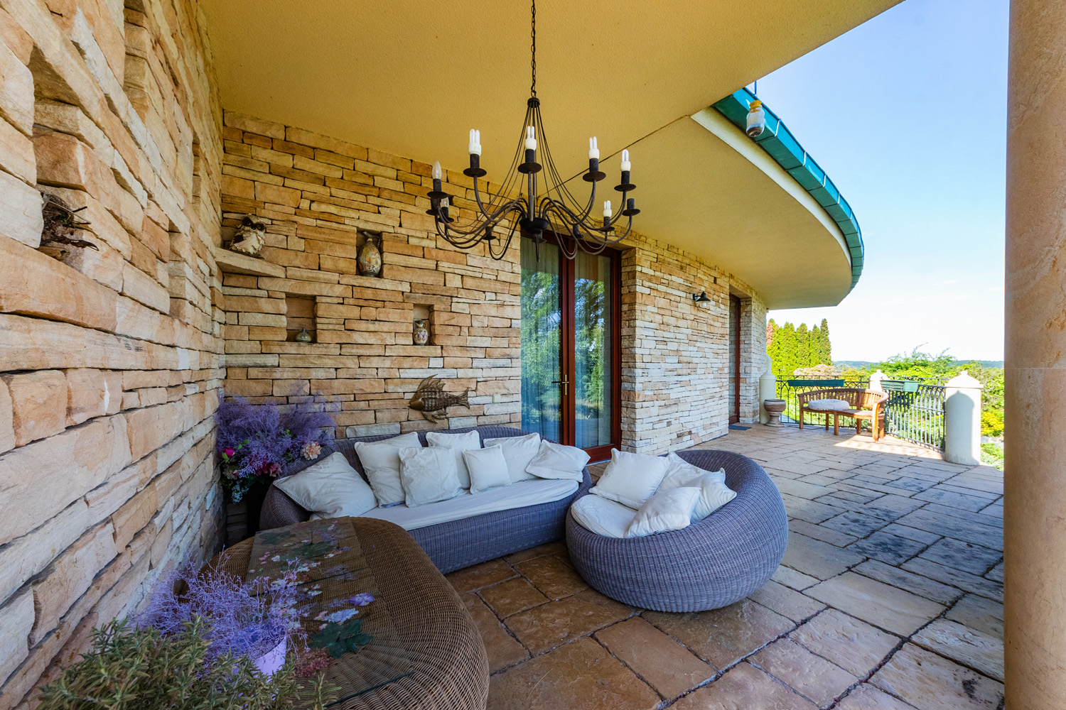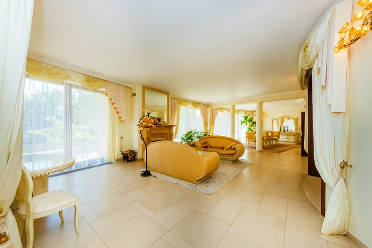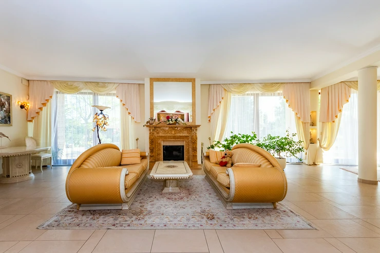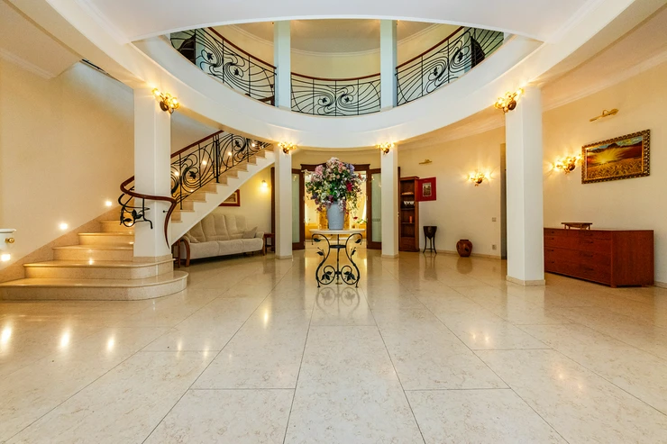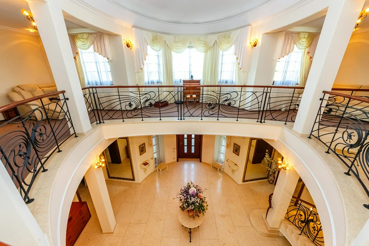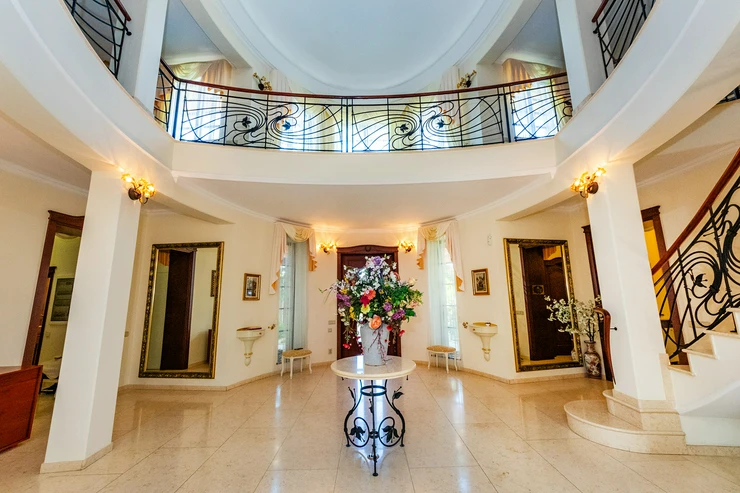 The villa offers spacious areas, including a grand entrance hall with a marble staircase and an open gallery floor. The living spaces are bright, airy, and equipped with a strong emphasis on comfort. The centerpiece of the living room is a handcrafted stone fireplace that adds a cozy atmosphere to the interior. The house includes an elegant dining area with garden views, a fully equipped kitchen, and several bedrooms with views of the surrounding nature.
