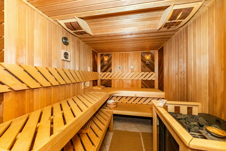 In the basement, there is a luxurious wellness area: a gym, sauna, and access to a covered terrace with a swimming pond – an ideal place for relaxation and rejuvenation.