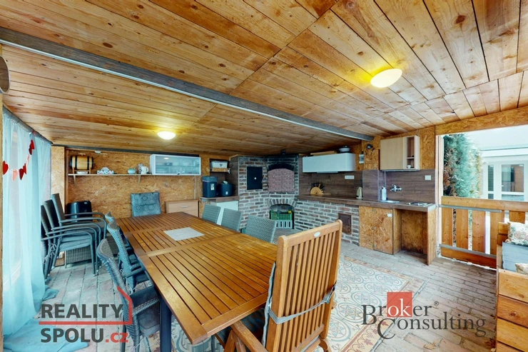 Součástí prodeje je i již zmíněný pozemek za domem, kde se nachází prostorné posezení, které je možné využít na oslavy s rodinou a setkání s přáteli. Pergola, ve které je gril, udírna, elektřina a přívod vody s umyvadlem je navíc uzavíratelná OSB deskami na míru a je tak využitelná během celého roku i za nepříznivého počasí.