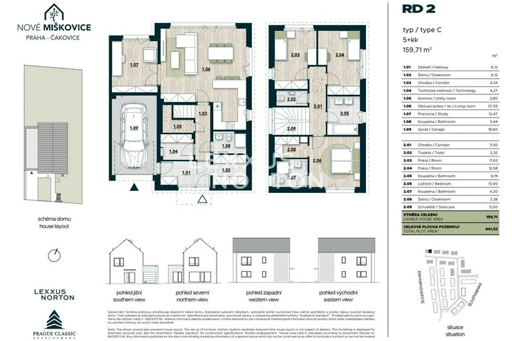 We are offering for sale a spacious four-bedroom family house in the Nove Miskovice residential project, which stands out with its generous usable area of 159.71 sqm and its own plot of land measuring 441.22 sqm. The layout of the house is designed with an emphasis on comfortable family life, plenty of privacy, and a natural connection between the interior and the garden.On the ground floor of the house, there is a spacious living room with a kitchenette and direct access to the garden, a separate room suitable as a study or guest room, a bathroom, a utility room, a storage room, a vestibule, and direct access to the garage. The living area is clearly connected to the garden, which offers plenty of space for relaxation and family activities.Upstairs there are three separate rooms, a bedroom, two bathrooms, a dressing room, and a hallway, which comfortably separates the quiet part of the house from the common area on the ground floor. The layout allows for comfortable living even for a larger family and at the same time provides enough space for working from home.The house is built to a high standard with an emphasis on functionality and long-term cost-effective operation. The furnishings include vinyl flooring from Alpod, SIKO tiles and wall tiles, including accessories, and interior doors of a higher standard. Plastic windows with insulated triple glazing provide plenty of daylight. The house is equipped with a heat pump for heating and hot water and controlled ventilation with air recovery, making the house very energy efficient. The houses are not connected to gas. The house meets energy efficiency standards (PENB: B).Nove Miskovice is being built between Polabska and Krcmarovska streets as a new residential area of Prague – Cakovice. The project will offer a new square with shops, services, and an electrified bus stop.The Praha-Cakovice train station provides connections to the center of Prague in approximately 22 minutes. The location thus offers an ideal balance between quiet family living and accessibility to the city.