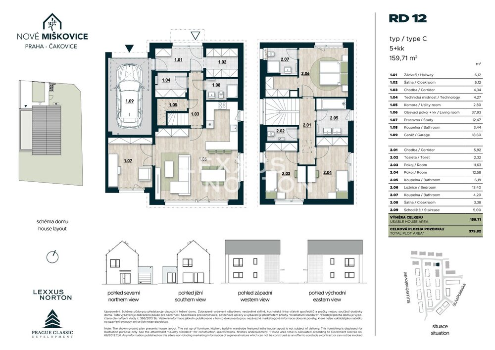 We are offering for sale a spacious four-bedroom family house in the Nove Miskovice residential project, which stands out with its generous usable area of 159.71 sqm and its own plot of land measuring 379.82 sqm. The layout of the house is designed with an emphasis on comfortable family life, plenty of privacy, and a natural connection between the interior and the garden.On the ground floor of the house, there is a spacious living room with a kitchenette and direct access to the garden, a separate room suitable as a study or guest room, a bathroom, a utility room, a storage room, a vestibule, and direct access to the garage. The living area is clearly connected to the garden, which offers plenty of space for relaxation and family activities.Upstairs there are three separate rooms, a bedroom, two bathrooms, a dressing room, and a hallway, which comfortably separates the quiet part of the house from the common area on the ground floor. The layout allows for comfortable living even for a larger family and at the same time provides enough space for working from home.The house is built to a high standard with an emphasis on functionality and long-term cost-effective operation. The furnishings include vinyl flooring from Alpod, SIKO tiles and wall tiles, including accessories, and interior doors of a higher standard. Plastic windows with insulated triple glazing provide plenty of daylight. The house is equipped with a heat pump for heating and hot water and controlled ventilation with air recovery, making the house very energy efficient. The houses are not connected to gas. The house meets energy efficiency standards (PENB: B).Nove Miskovice is being built between Polabska and Krcmarovska streets as a new residential area of Prague – Cakovice. The project will offer a new square with shops, services, and an electrified bus stop.The Praha-Cakovice train station provides connections to the center of Prague in approximately 22 minutes. The location thus offers an ideal balance between quiet family living and accessibility to the city.