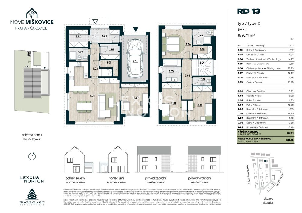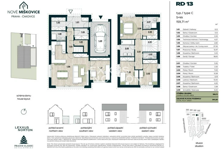 We are offering for sale a spacious four-bedroom family house in the Nove Miskovice residential project, which stands out with its generous usable area of 159.71 sqm and its own plot of land measuring 341.20 sqm. The layout of the house is designed with an emphasis on comfortable family life, plenty of privacy, and a natural connection between the interior and the garden.On the ground floor of the house, there is a spacious living room with a kitchenette and direct access to the garden, a separate room suitable as a study or guest room, a bathroom, a utility room, a storage room, a vestibule, and direct access to the garage. The living area is clearly connected to the garden, which offers plenty of space for relaxation and family activities.Upstairs there are three separate rooms, a bedroom, two bathrooms, a dressing room, and a hallway, which comfortably separates the quiet part of the house from the common area on the ground floor. The layout allows for comfortable living even for a larger family and at the same time provides enough space for working from home.The house is built to a high standard with an emphasis on functionality and long-term cost-effective operation. The furnishings include vinyl flooring from Alpod, SIKO tiles and wall tiles, including accessories, and interior doors of a higher standard. Plastic windows with insulated triple glazing provide plenty of daylight. The house is equipped with a heat pump for heating and hot water and controlled ventilation with air recovery, making the house very energy efficient. The houses are not connected to gas. The house meets energy efficiency standards (PENB: B).Nove Miskovice is being built between Polabska and Krcmarovska streets as a new residential area of Prague – Cakovice. The project will offer a new square with shops, services, and an electrified bus stop.The Praha-Cakovice train station provides connections to the center of Prague in approximately 22 minutes. The location thus offers an ideal balance between quiet family living and accessibility to the city.