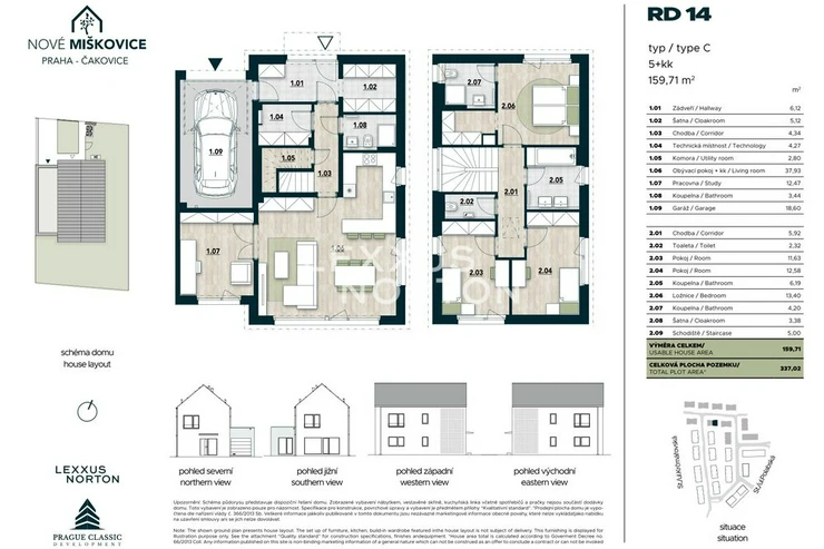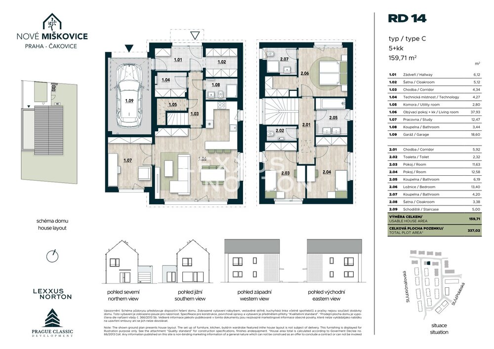 We are offering for sale a spacious four-bedroom family house in the Nove Miskovice residential project, which stands out with its generous usable area of 159.71 sqm and its own plot of land measuring 337.02 sqm. The layout of the house is designed with an emphasis on comfortable family life, plenty of privacy, and a natural connection between the interior and the garden.On the ground floor of the house, there is a spacious living room with a kitchenette and direct access to the garden, a separate room suitable as a study or guest room, a bathroom, a utility room, a storage room, a vestibule, and direct access to the garage. The living area is clearly connected to the garden, which offers plenty of space for relaxation and family activities.Upstairs there are three separate rooms, a bedroom, two bathrooms, a dressing room, and a hallway, which comfortably separates the quiet part of the house from the common area on the ground floor. The layout allows for comfortable living even for a larger family and at the same time provides enough space for working from home.The house is built to a high standard with an emphasis on functionality and long-term cost-effective operation. The furnishings include vinyl flooring from Alpod, SIKO tiles and wall tiles, including accessories, and interior doors of a higher standard. Plastic windows with insulated triple glazing provide plenty of daylight. The house is equipped with a heat pump for heating and hot water and controlled ventilation with air recovery, making the house very energy efficient. The houses are not connected to gas. The house meets energy efficiency standards (PENB: B).Nove Miskovice is being built between Polabska and Krcmarovska streets as a new residential area of Prague – Cakovice. The project will offer a new square with shops, services, and an electrified bus stop.The Praha-Cakovice train station provides connections to the center of Prague in approximately 22 minutes. The location thus offers an ideal balance between quiet family living and accessibility to the city.