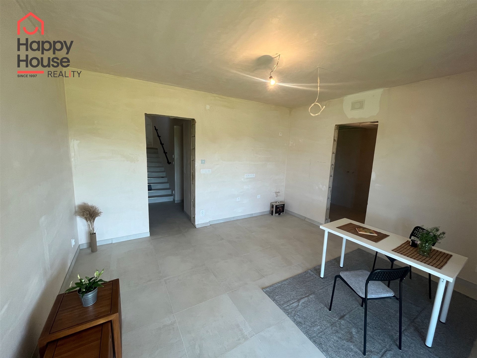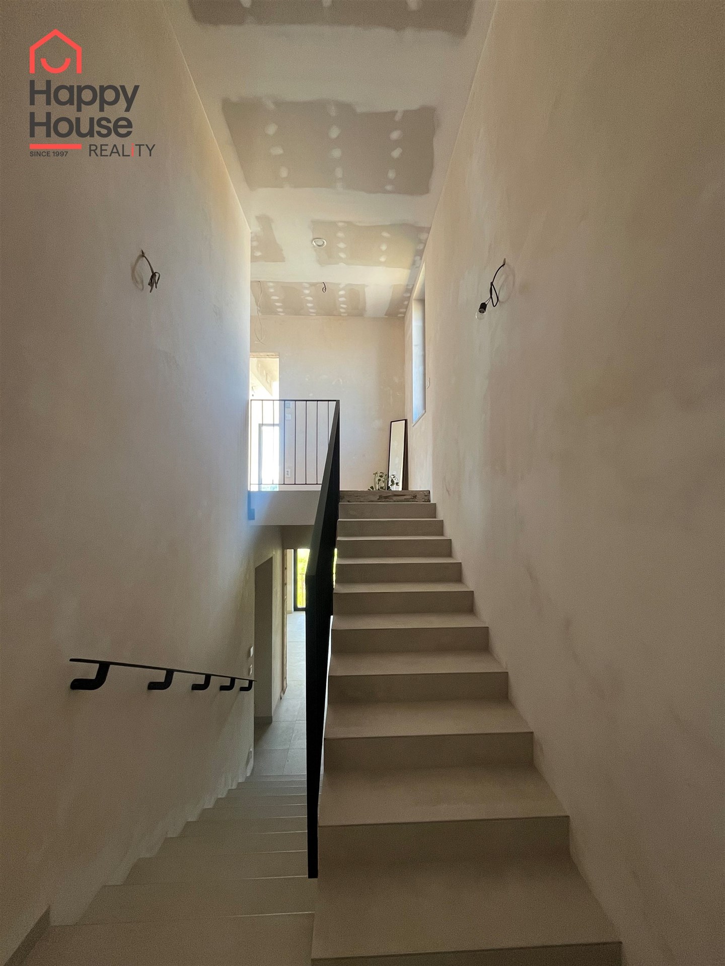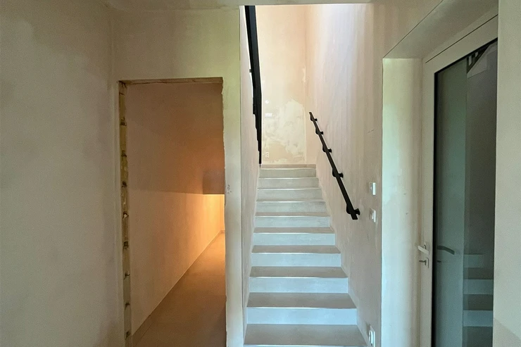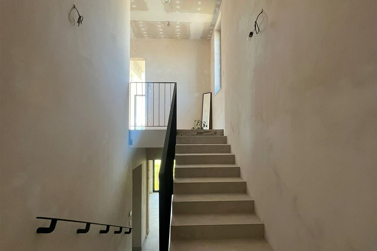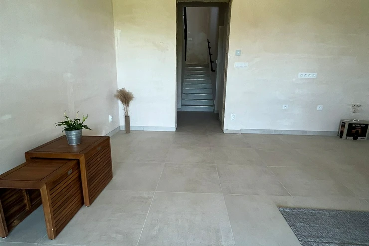 The house is situated on a plot of 942 sqm and has 2 floors. From the entrance hall on the mezzanine floor, a staircase leads to the main living area, which features an open concept living room with a kitchen measuring 45 sqm and direct access to a 13 sqm terrace. Large-format windows to the south and east provide ample natural light throughout the day.