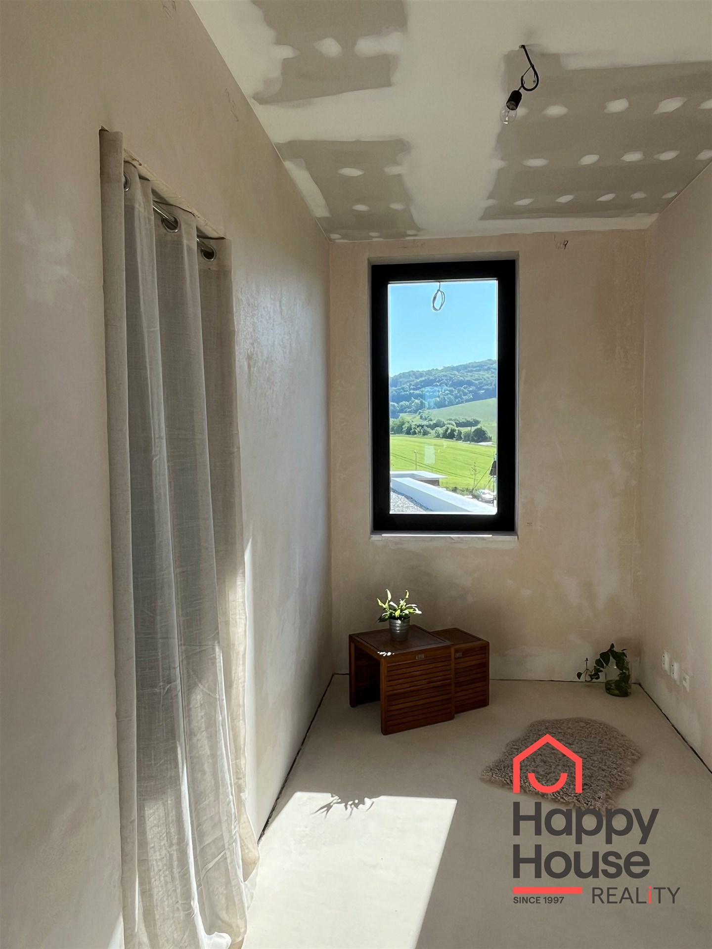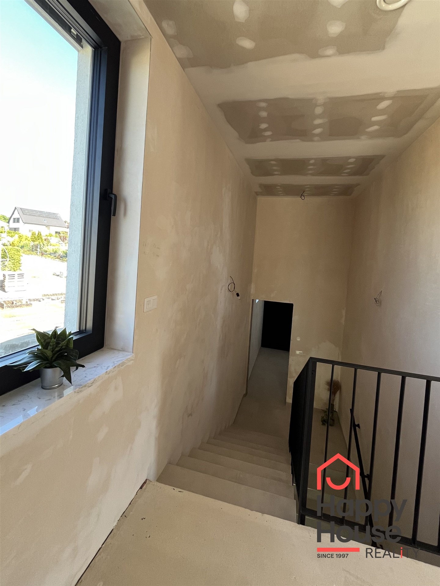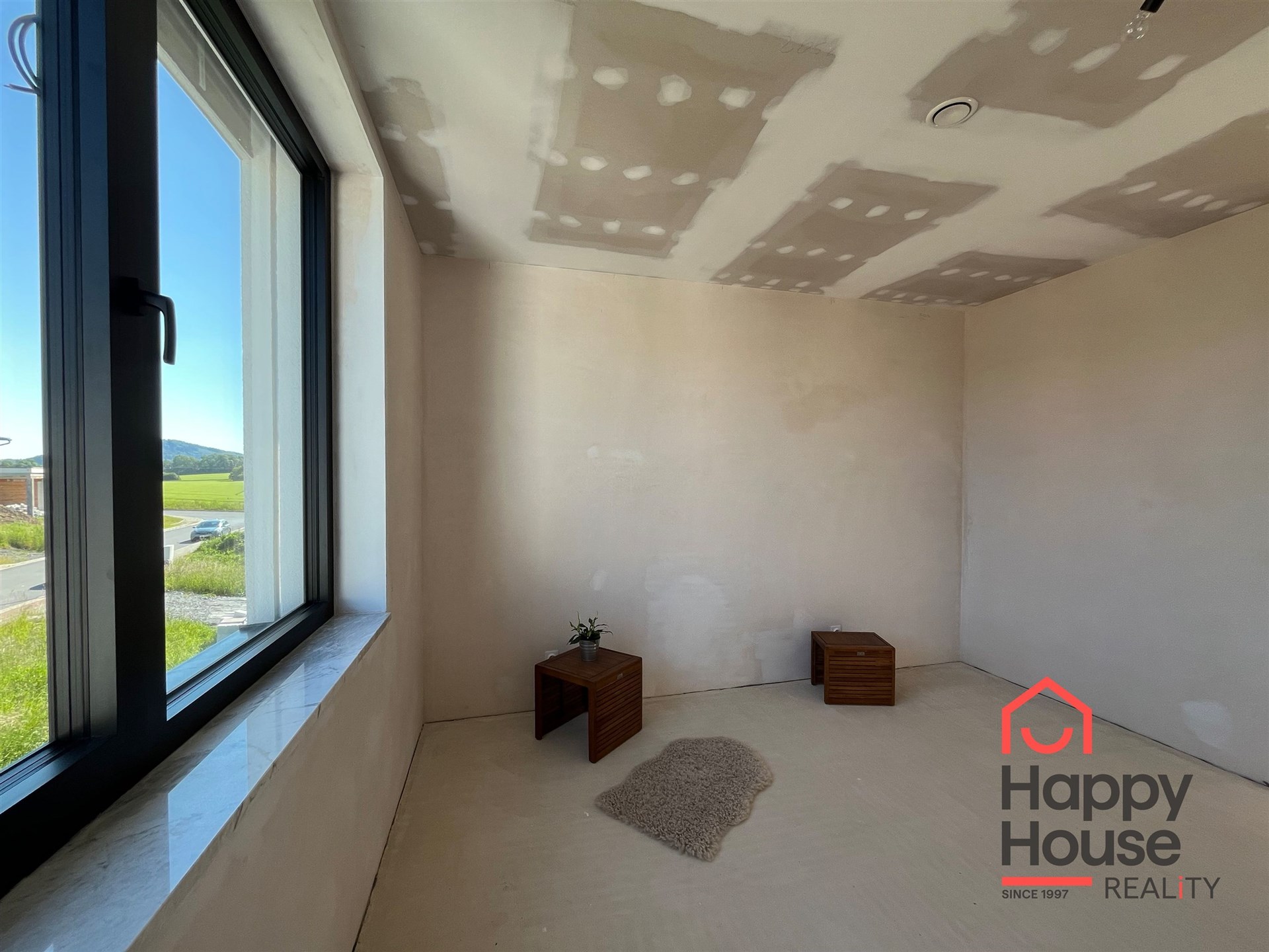 The black aluminum windows with insulating triple-glazing offer maximum energy savings, an elegant look, and high durability. Electrical installations for outdoor blinds are prepared.