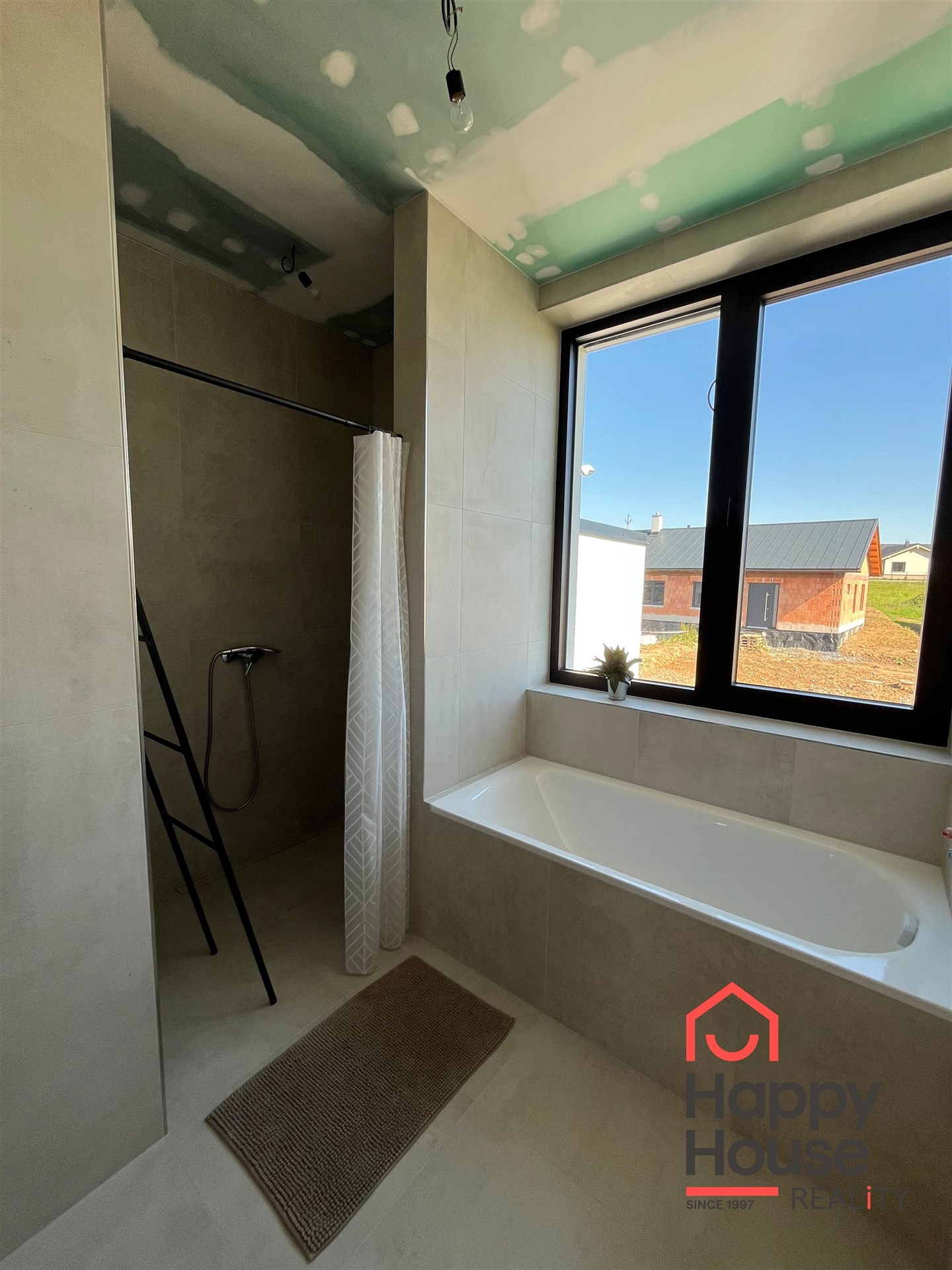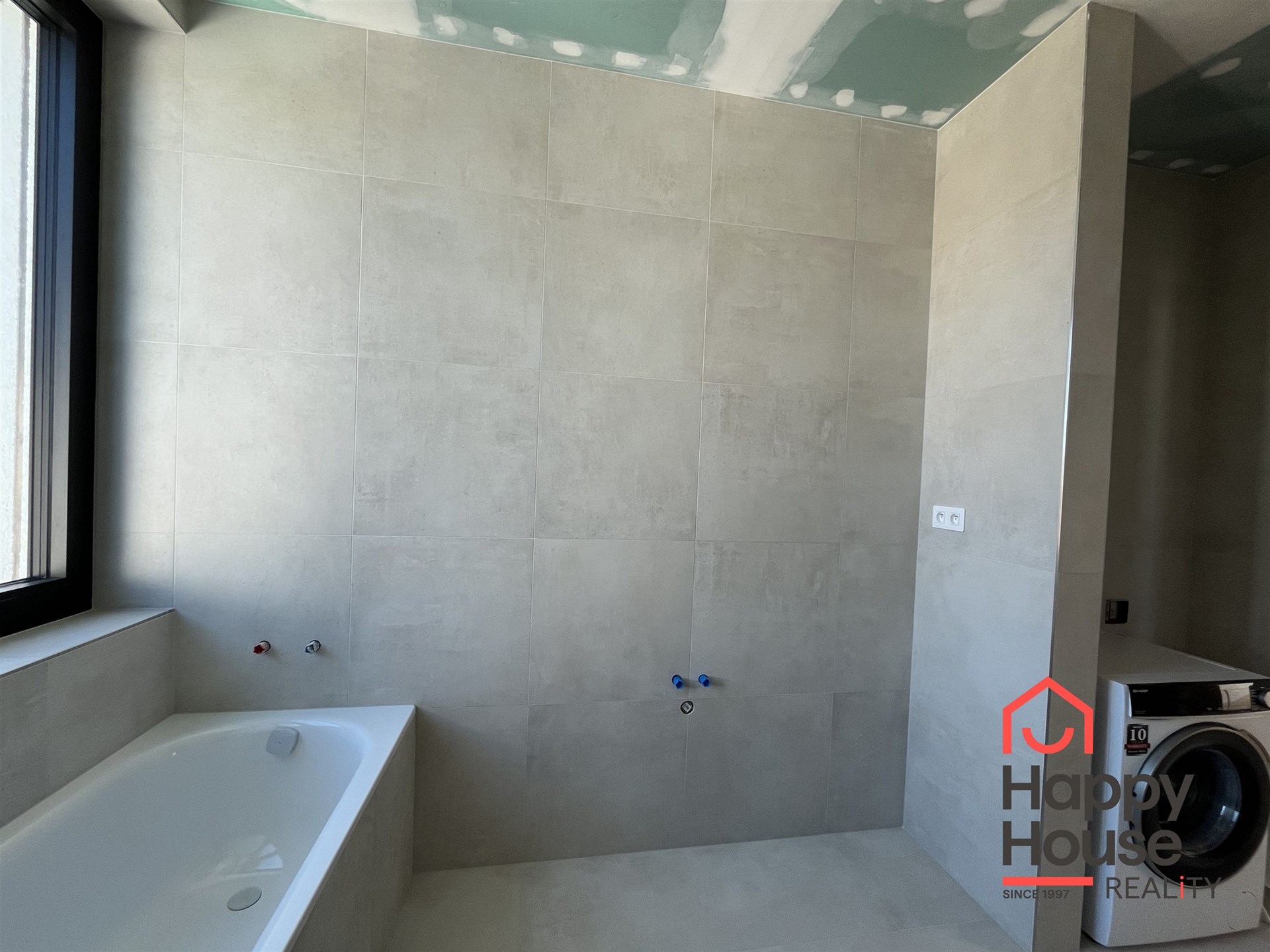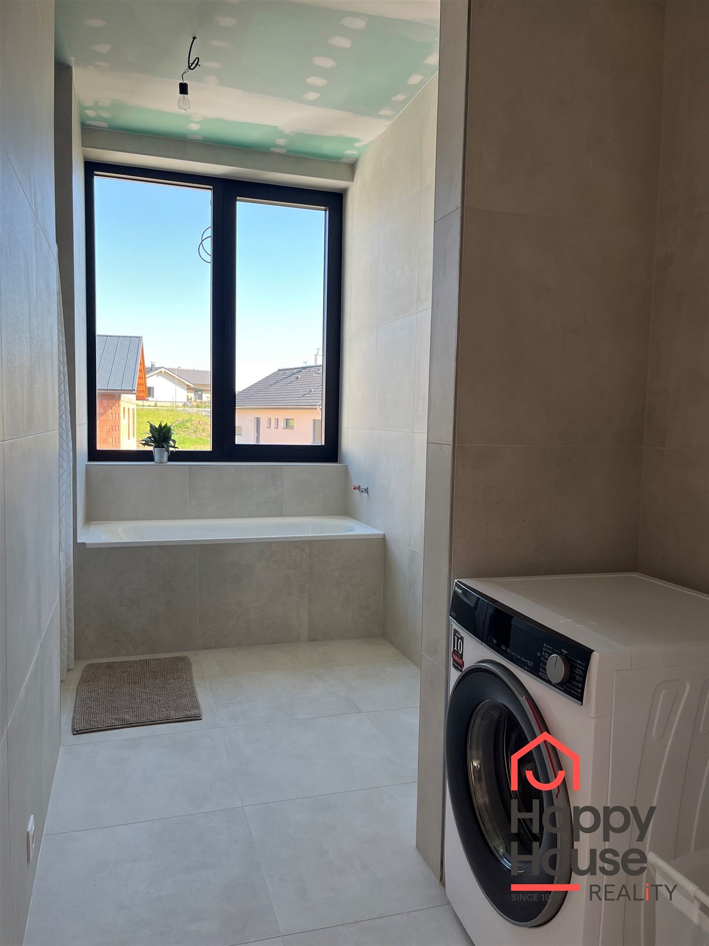 The modern bathroom includes a window, bathtub, shower stall, space for a double sink, and a visually separated area for a washing machine and dryer, with a separate toilet.