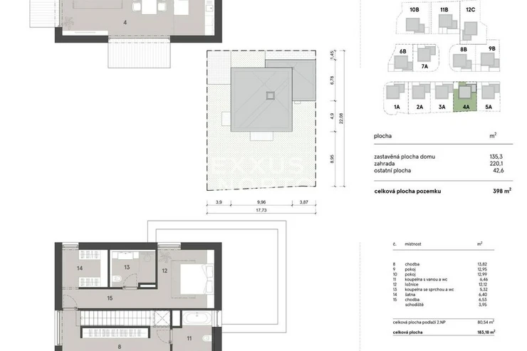 We offer for sale a modern two-storey family house within a new residential project in the prestigious area of Prague 4 – Tocna. The project consists of only twelve homes located in a quiet neighborhood surrounded by nature. The Tocna Residence combines privacy, high-quality architectural design, and a pleasant green setting, creating an ideal place for family living.The 4-bedroom layout with a usable area of 183 sqm is divided is divided into two living zones. The ground floor includes an entrance hall with a utility room connected to the garage and an open-plan living space with a kitchen and dining area of 45 sqm. Large-format aluminum windows bring in abundant daylight from two directions and connect the interior with terraces and a sunny south-facing garden. A separate room with a bathroom can be used as a study or guest room.The second floor offers a master bedroom with a walk-in closet and private bathroom, two additional bedrooms, a spacious family bathroom, and practical storage areas.Each home is equipped with an air-to-water heat pump, underfloor heating, and heat recovery ventilation for a healthy indoor climate and energy-efficient operation. Standard features include aluminum triple glazing, wooden floors, bathroom furniture, external blinds, preparation for photovoltaic panels, and an electric vehicle charging socket. The property meets Energy Class A energy efficiency.Tocna stands out for its peaceful atmosphere and abundant greenery while maintaining quick access to the city center. The project also supports the development of local infrastructure, including a community center for gatherings and shops for everyday needs. Nearby is one of the most respected international schools, Prague British International School.