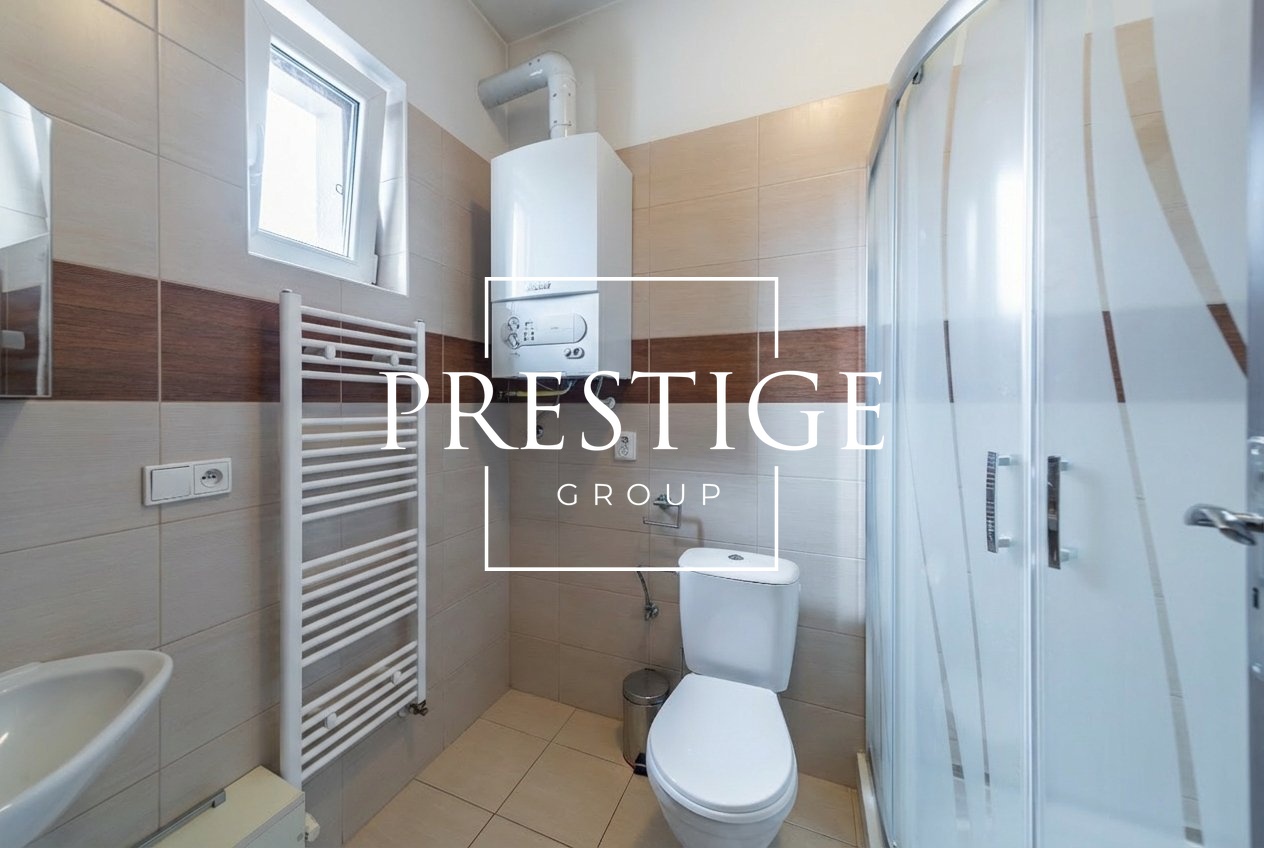 The house is fully furnished and ready for immediate occupancy. The ground floor features an entrance hall, a bathroom with a shower and toilet, a spacious walk-in closet, and a bright living room with a kitchen area equipped with built-in appliances and a pantry. The living area provides direct access to the terrace and garden. The first floor offers three separate bedrooms and a bathroom with a bathtub and toilet. The layout is practical and ensures sufficient privacy for each family member.