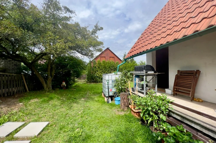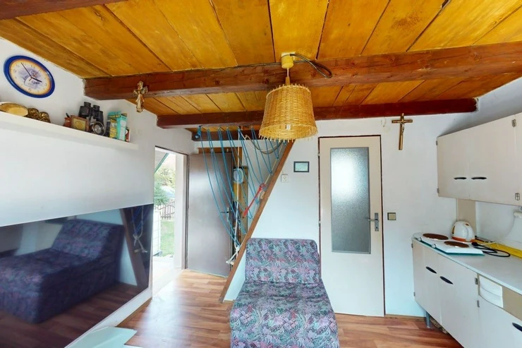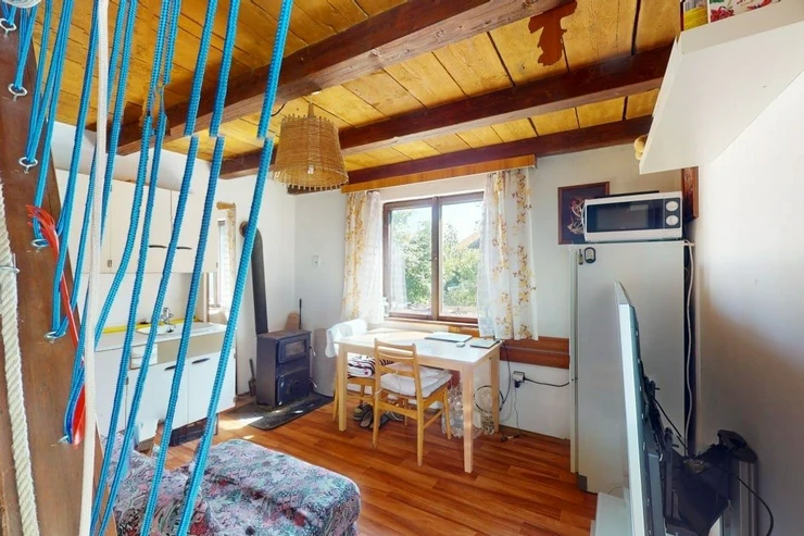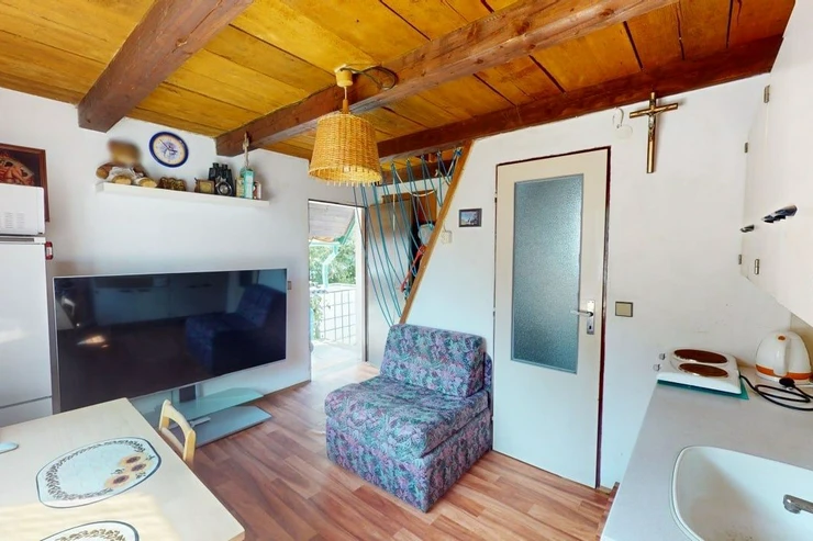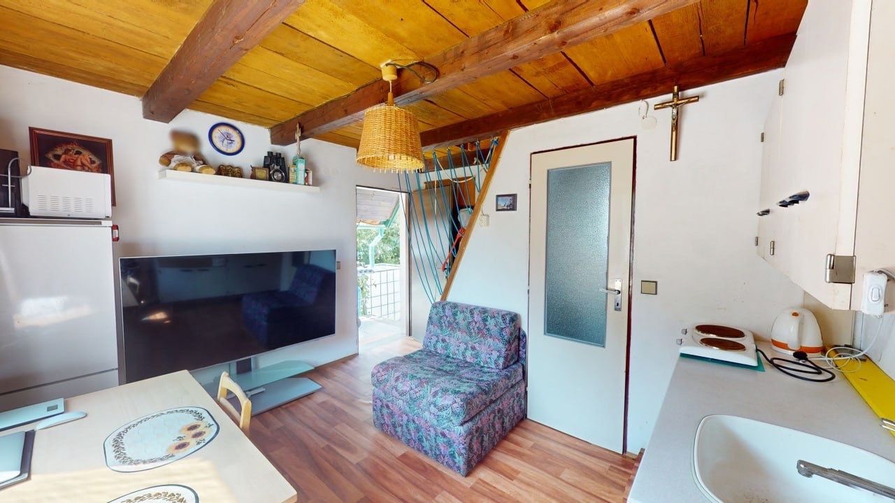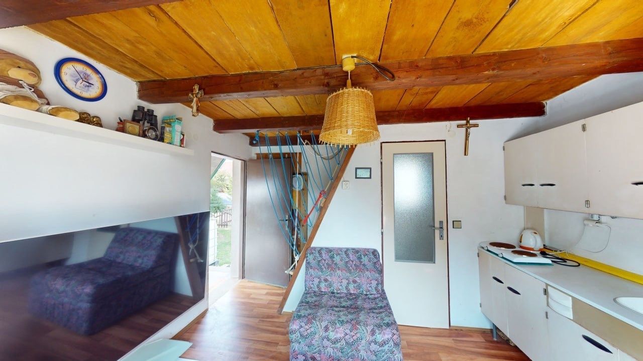 We offer for sale a cottage in the popular place Rabyně near Slapská přehrada, 200 meters above the village. The cottage is on its own fenced yard. Heating is provided by a fireplace stove (solid fuel). Electricity and city water are connected, sewerage is brought to a sump, sewerage is planned in the future. Layout - on the ground floor there is a kitchen combined with a living room, a bathroom (boiler) with a shower and a toilet. The bedroom is on the top floor. Like the first floor, the second floor also has a window that provides daylight and airiness. Everything is in good condition, completely brick. Parking for two cars, flat corner lot.