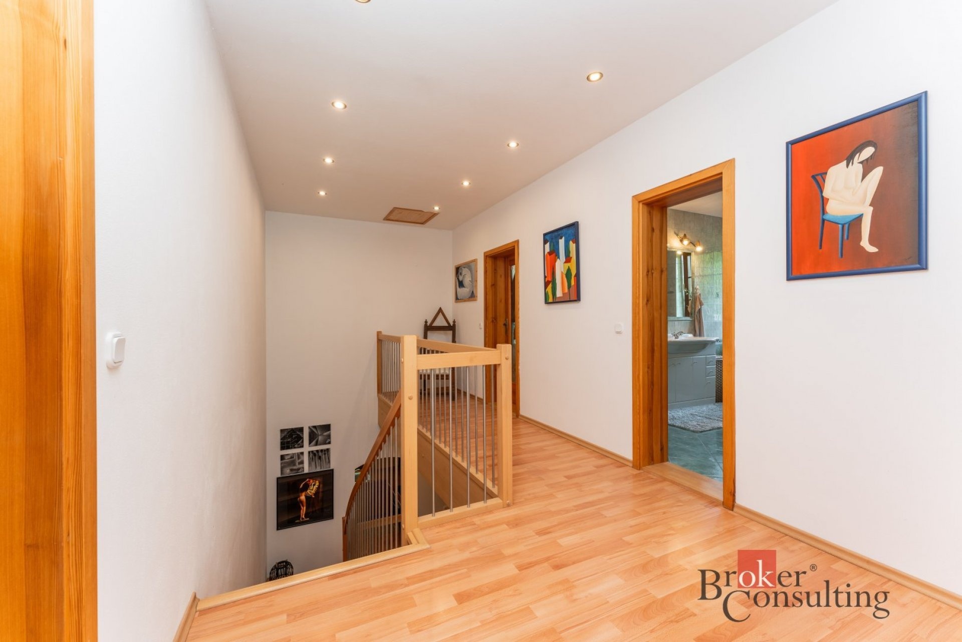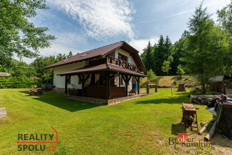 Dům obklopuje vzrostlá zeleň, která poskytuje vysokou míru soukromí. Součástí zahrady je útulná terasa s posezením a grilem, přístřešek pro parkování dvou aut a jezírko s molem.