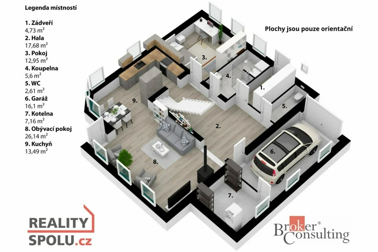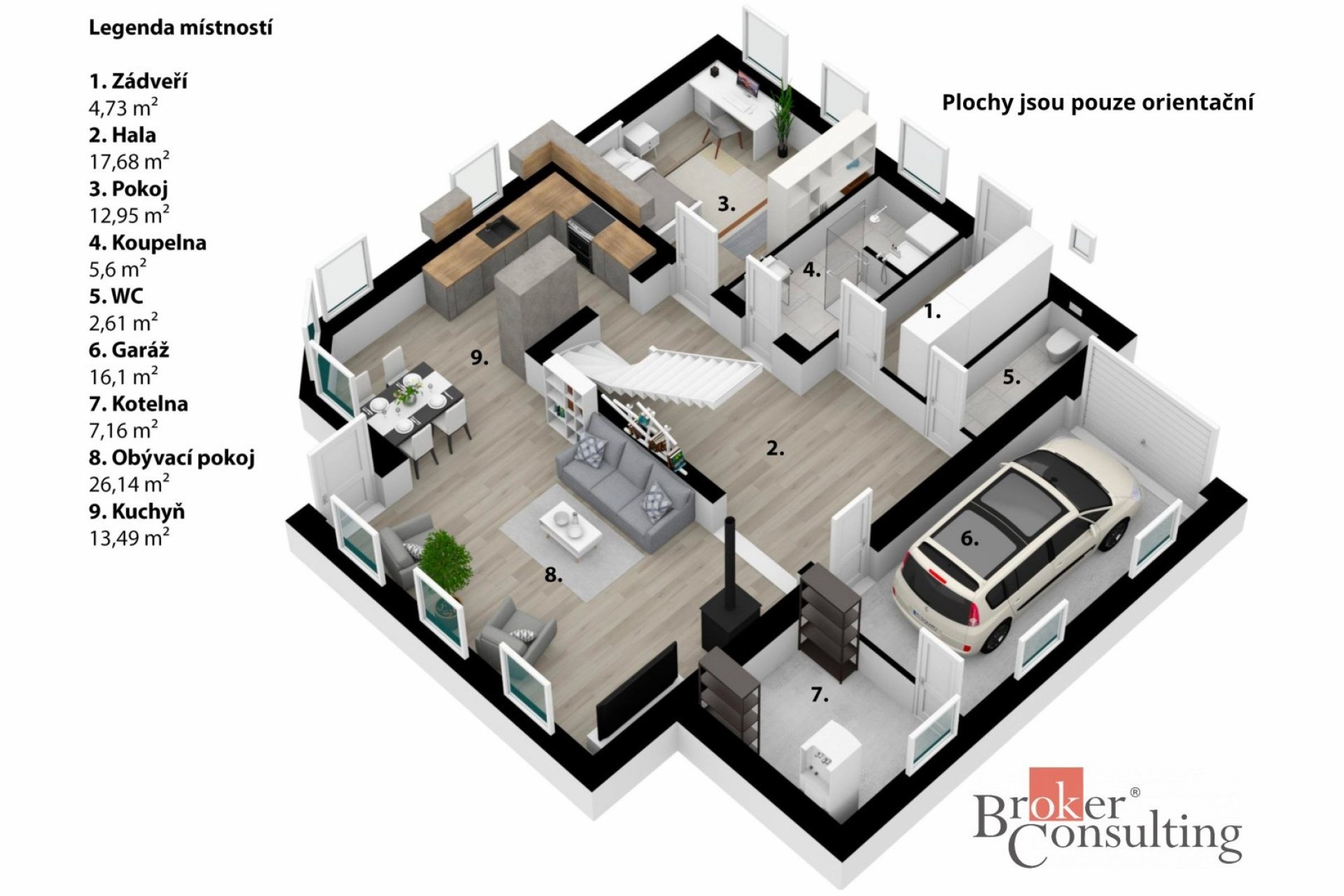 Dům má dispozici 5+kk s celkovou plochou 216,5 m². Přízemí domu se skládá ze zádveří (4,79 m²), chodby (17,68 m²), ze které se dá vstoupit do garáže (16,10 m²) a kotelny (7,16 m²), koupelny (5,60 m²) a oddělené toalety (2,61 m²), ložnice (12,95 m²), následuje kuchyňský kout (6,96 m²), součástí kterého je jídelna (6,53 m²). Dominantou domu je obývací pokoj s krbem (26,14 m²) se vstupem na venkovní terasu.